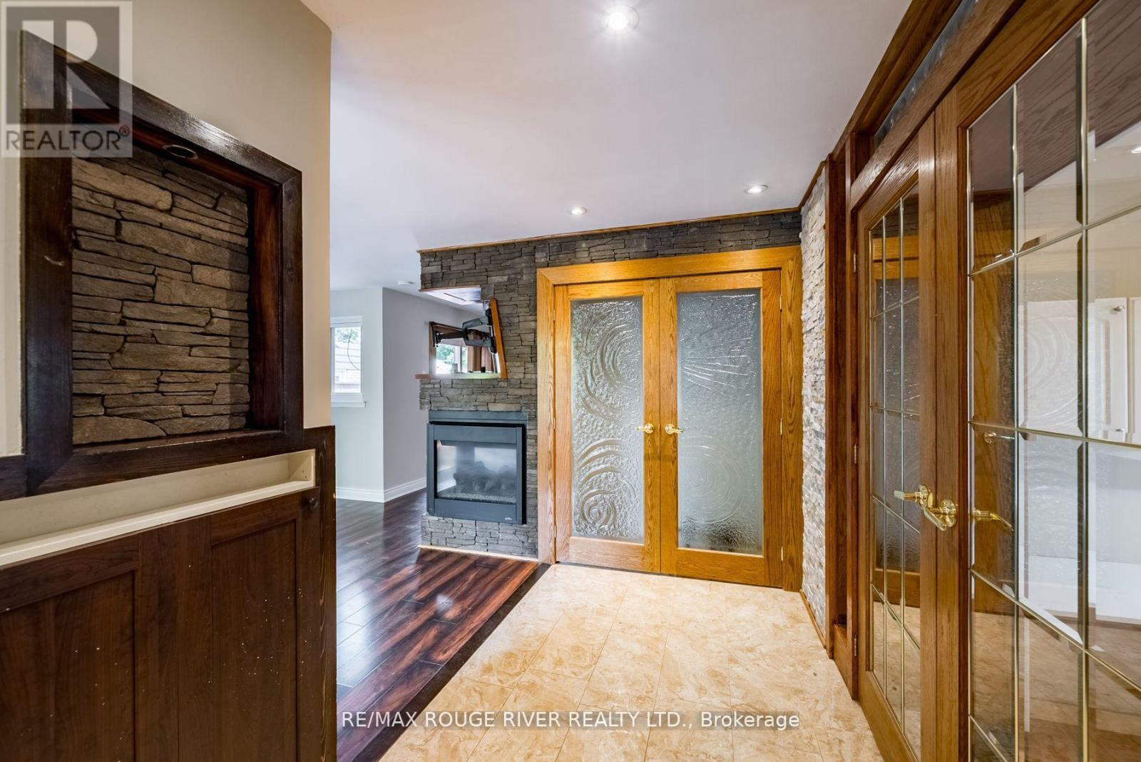 In a coveted South Ajax lakeside community, set on a private mature treed lot, this renovated bungalow with 3+2 bedrooms and three full bathrooms offers the rare advantage of a legal duplex generating approximately $54,000 in rental income annually, plus utilities. A sheltered portico entry welcomes you into an inviting foyer that opens to a private office/den on one side and a spacious living room enhanced by a contemporary three-sided fireplace that also warms the dining area. The expansive chef's kitchen features quality finishes and a walkout to a large fenced side deck with a gas BBQ line, perfect for entertaining. The primary bedroom includes a renovated 3-piece ensuite with an oversized glass shower. Good sized secondary bedrooms offer outstanding custom closet built-ins, complemented by a renovated main bath. For convenience, there are two separate laundry areas, one for each unit. From the front door you are ideally located a short walk to Ajax's scenic waterfront trails, Rotary Park, Duffins Bay Beach, and well-regarded local schools, with excellent proximity to transit, dining, and shopping... and just steps from Exeter Park offering a playground, splash pad, and a leash-free dog park with separate areas for large and small dogs. This is an exceptional opportunity with a substantial mortgage helper income of approximately $4,500 per month with tenants paying the utilities. The lower unit will be vacant on closing, offering flexibility for owner occupancy or tenant selection. Conveniently located minutes to the GO (id:4555)