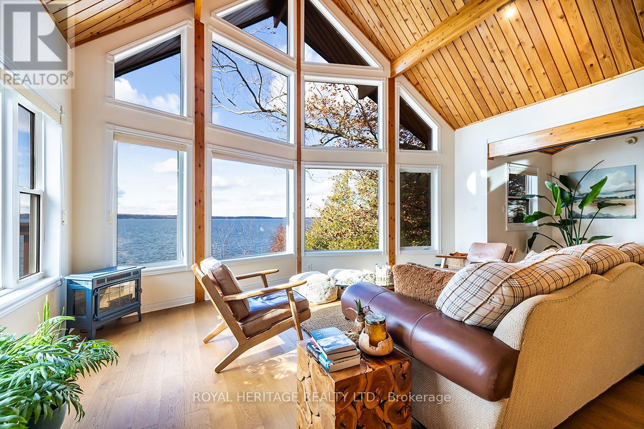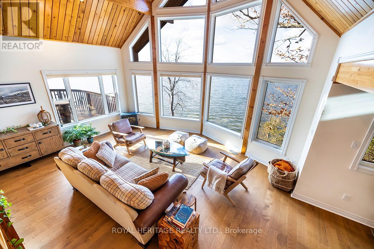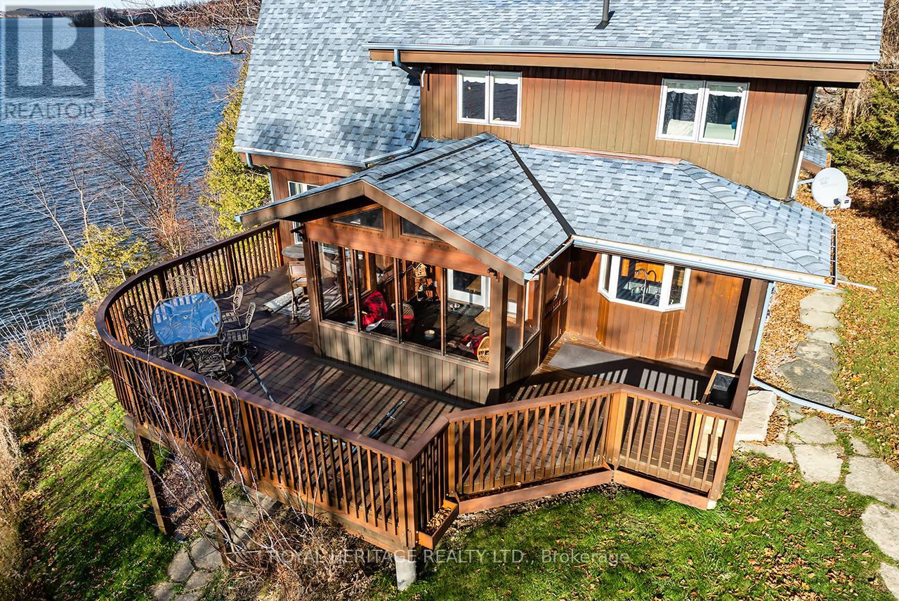 Offering exceptional quality and privacy with 387ft of frontage on the south shores of Rice Lake. This Linwood built home rests on a secluded 1.4 acre lot on a dead end road. The clean shoreline offers excellent swimming and unobstructed views of natural skyline & sunsets. The impeccably kept home offers 4 Bedrooms & 3 Washrooms and is filled with natural light, built with consideration offering clear views of the lake from every vantage point. Open concept main floorplan with vaulted ceilings and hardwood floors, Eat-In kitchen with centre island & stone counter. 2nd floor loft bedroom with ensuite bath & W/I closet. Main floor bedroom, full bath, laundry & custom fireplace. The lower level is completed with 2 bedrooms, 3pc bath & sauna and a walkout to greenspace. Outdoors you'll find a spacious storage shed and a bunkie for guests in the summer time. New dock w easy lift for winter storage. Lakeside firepit. Tons of parking. Truly a resort style property that must be seen to be fully appreciated! (id:4555)