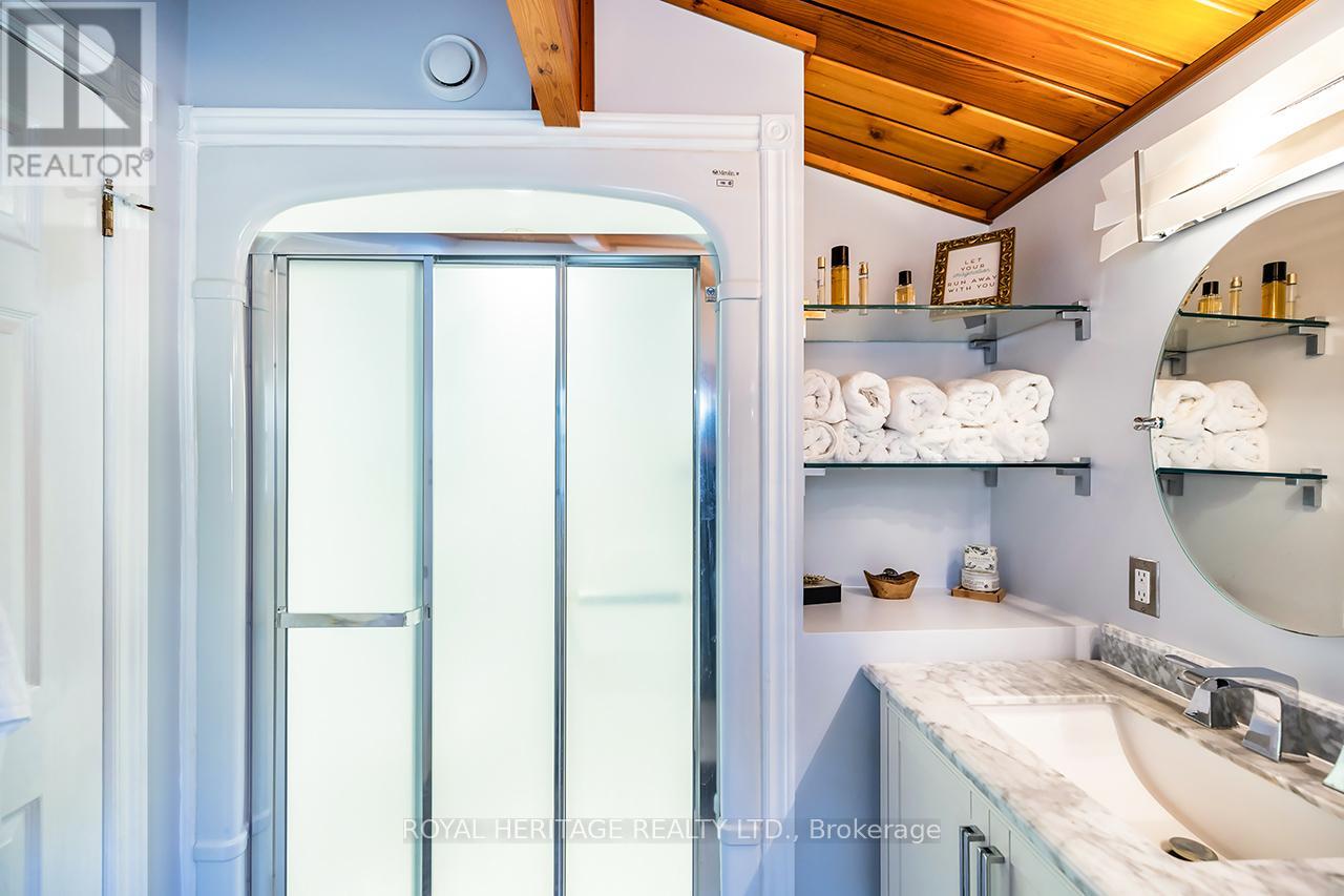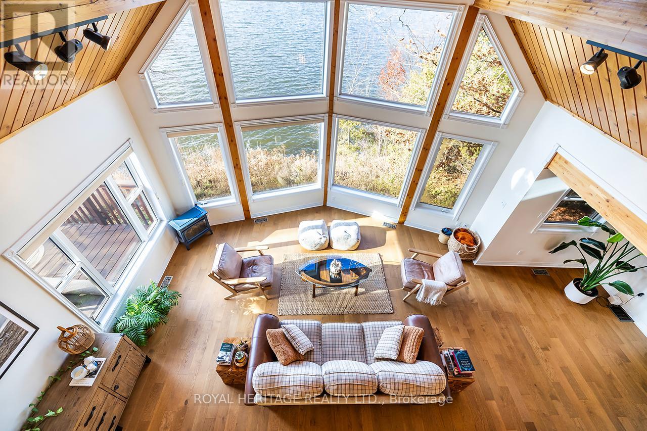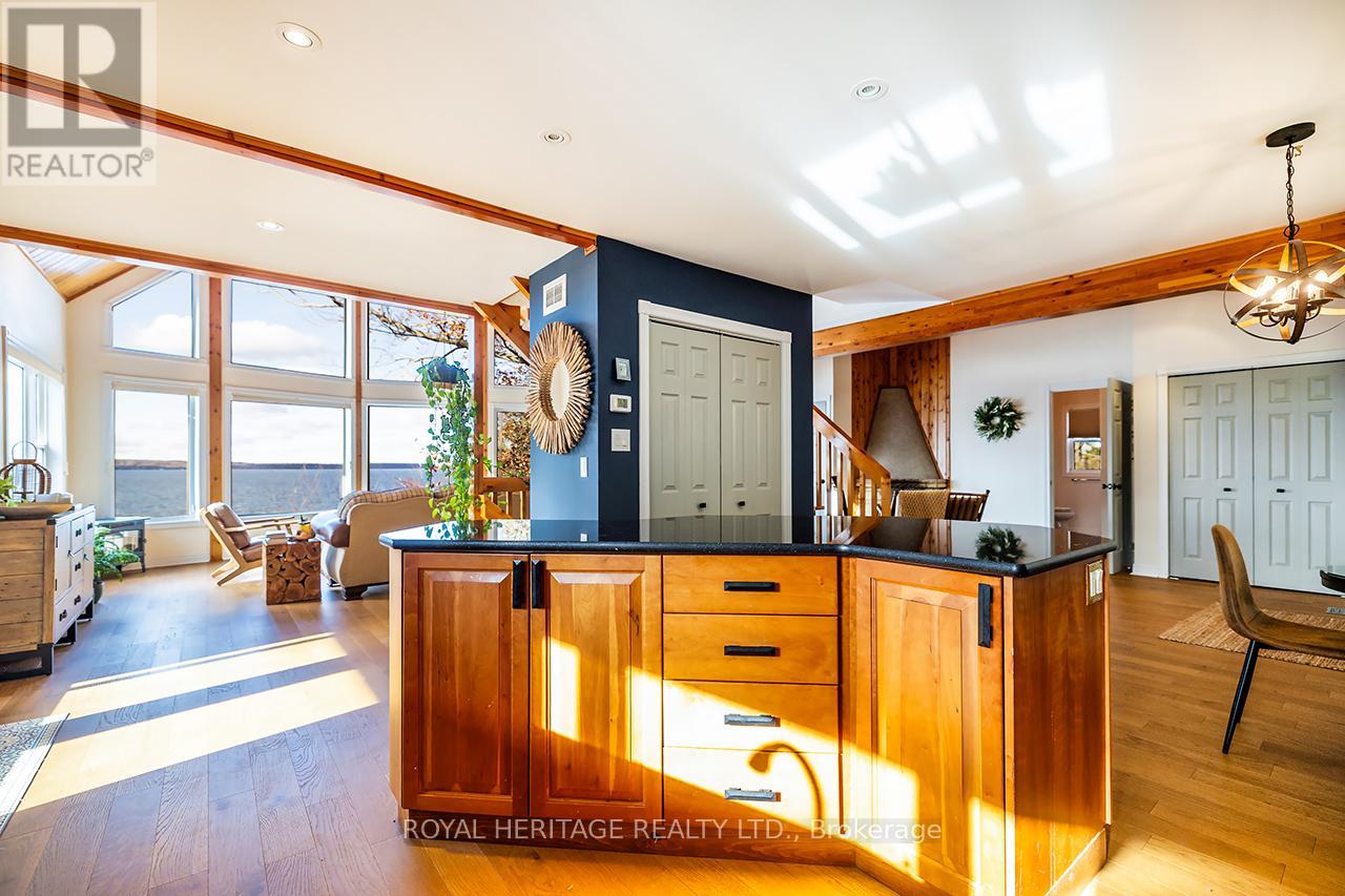 Offering exceptional quality and privacy with 387ft of frontage on the south shores of Rice Lake. This Linwood built home rests on a secluded 1.4 acre lot on a dead end road. The clean shoreline offers excellent swimming and unobstructed views of natural skyline & sunsets. The impeccably kept home offers 4 Bedrooms & 3 Washrooms and is filled with natural light, built with consideration offering clear views of the lake from every vantage point. Open concept main floorplan with vaulted ceilings and hardwood floors, Eat-In kitchen with centre island & stone counter. 2nd floor loft bedroom with ensuite bath & W/I closet. Main floor bedroom, full bath, laundry & custom fireplace. The lower level is completed with 2 bedrooms, 3pc bath & sauna and a walkout to greenspace. Outdoors you'll find a spacious storage shed and a bunkie for guests in the summer time. New dock w easy lift for winter storage. Lakeside firepit. Tons of parking. Truly a resort style property that must be seen to be fully appreciated! (id:4555)