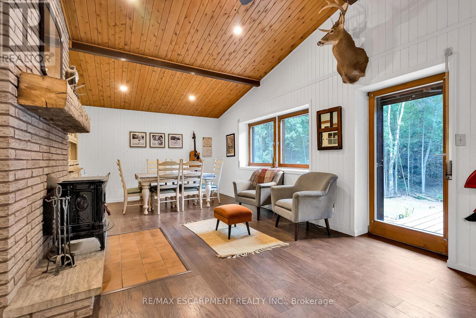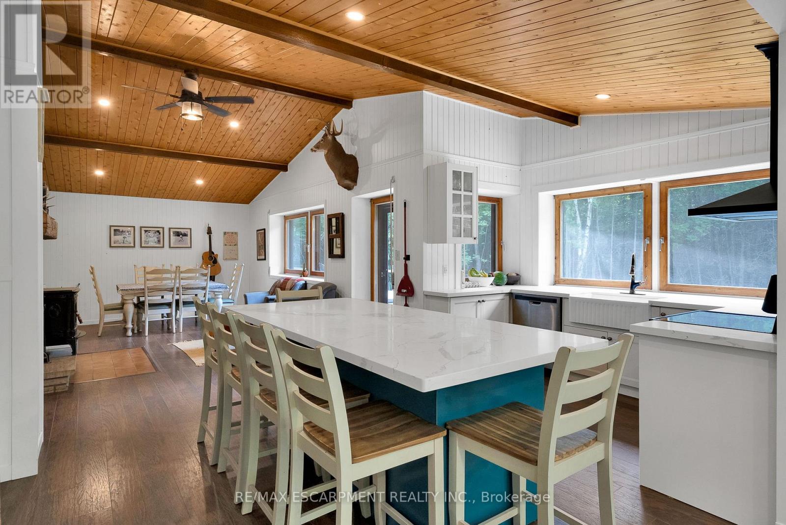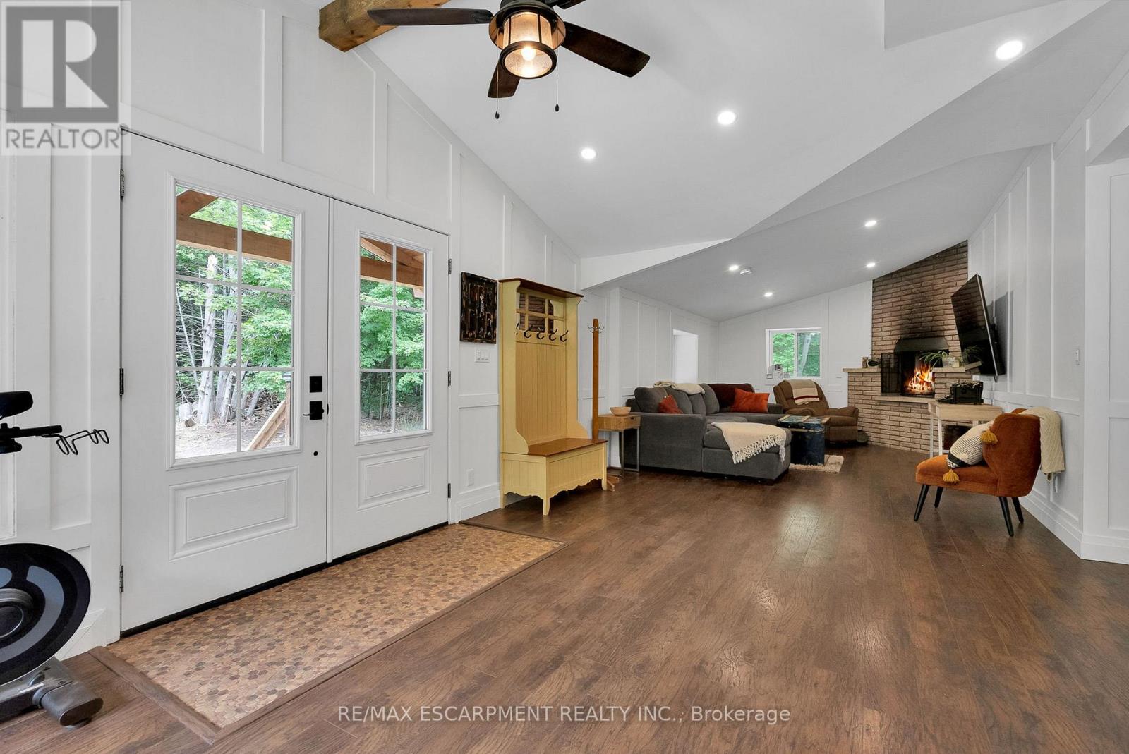Welcome to 155 Hofer Road your private retreat on 18+ acres of rolling countryside. Renovated and thoughtfully designed, this family home offers the perfect balance of rustic charm and modern comfort. Step inside to a bright and inviting family room where soaring vaulted ceilings, exposed beams, and a wood-burning fireplace create a warm and welcoming atmosphere. Huge windows and a walkout to the deck fill this space with natural light, while pot lighting adds a touch of modern style. The open-concept kitchen and dining area is the true heart of the home, featuring quartz countertops, a farmers sink, a central island, and plenty of storage and prep space ideal for both everyday living and entertaining. On the main level, you'll find two generous bedrooms, including a stunning primary bedroom with a luxurious 5-piece ensuite. A second bedroom and a beautifully updated 4-piece bath ensure comfort and convenience for family or guests. The fully finished lower level provides even more living space with three additional bedrooms, a 3-piece bath, a laundry room, and a large rec room with its own walkout. Perfect for a growing family or hosting overnight guests. Outdoors, every season brings new adventures. In summer, relax in the pool or hot tub, explore the river running through the property, or entertain family and friends on over 1,200 sq. ft. of deck space. Evenings are made for gathering around the firepit under the stars. In winter, lace up your skates and enjoy your own private pond just steps away. Stay connected with Starlink, enjoy the convenience of school bus route access, and appreciate being just 10 minutes to town with easy 401 access. This isn't just a home its a place where every season brings new memories, new adventures, and a way of life you've been waiting for. The only thing missing is you. Its Time to Make YOUR Move! (id:4555)