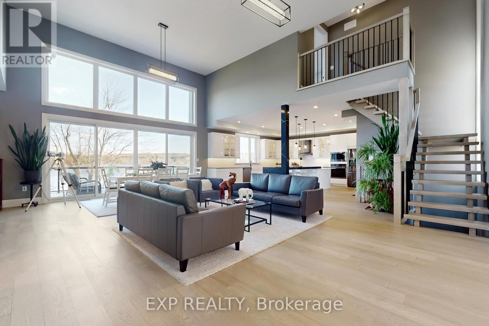 Stunning custom-built lakefront home with 175 ft of private shoreline surrounded by mature trees. The master bedroom loft with a walkout to a balcony with breathtaking lake views and a luxurious ensuite. The main floor with 10 to 16 ft ceilings, a spacious open-concept layout, large windows for natural light, and a walkout to a terrace overlooking the lake. The elegant foyer features built-in closets on both sides, modern kitchen includes a cozy built-in breakfast area and unique architectural design. The walk-out basement offers 9 ft ceilings, two bedrooms with ensuites, and access to a lake view terrace from both the bedrooms and the recreation room. A separate side entrance leads to a private "man cave" with a kitchenette and 3-piece bath - perfect for guests or hobbies. Enjoy a lakeside sauna with a sitting and relaxation area, a garage with large windows, and a mudroom with built-in closets and a convenient dog spa for post-walk cleanups. Heated bathroom floors. House is built using the ICF construction method for superior efficiency and durability, this home also includes a central backup generator and a heat pump system. (id:4555)