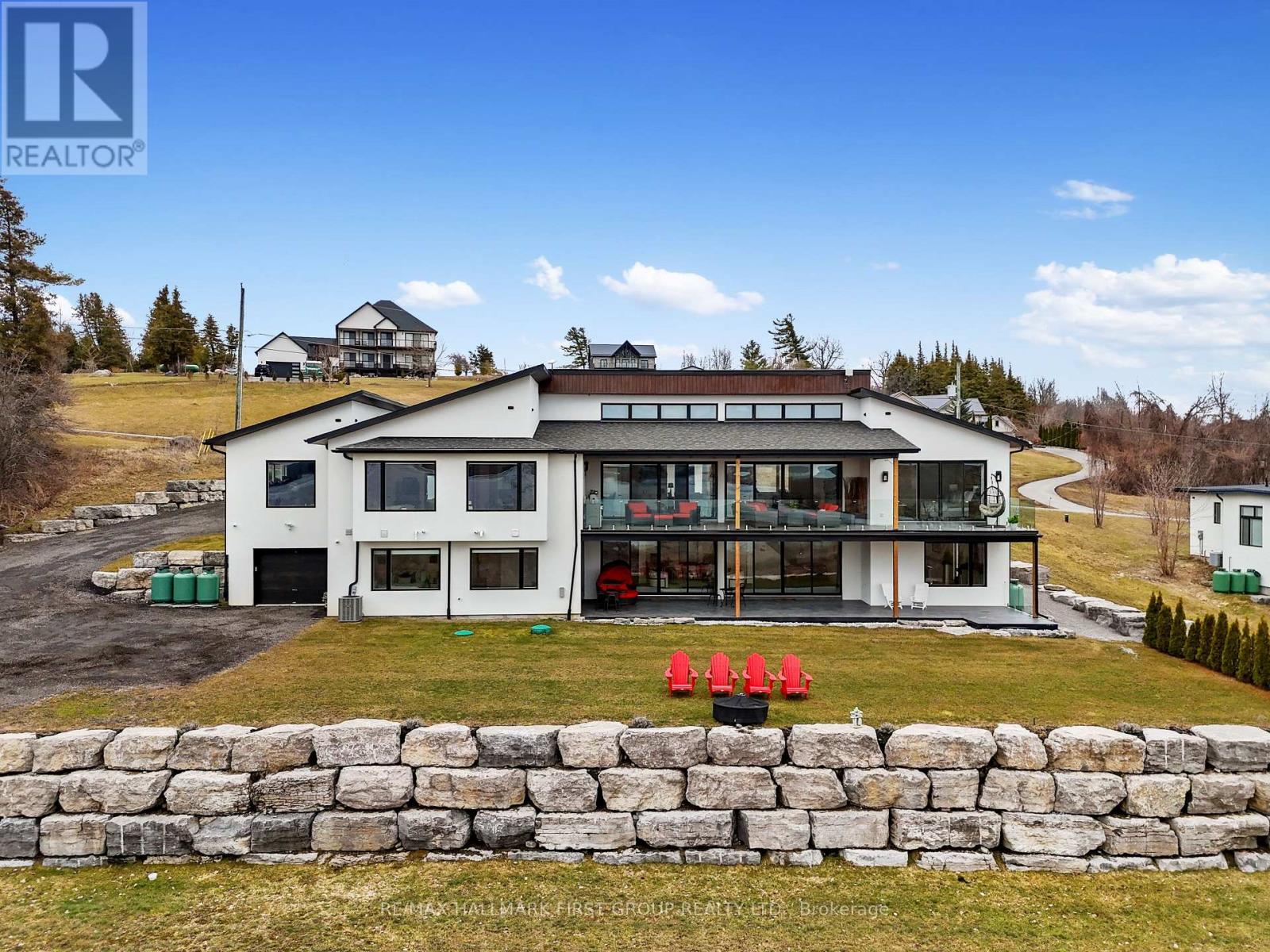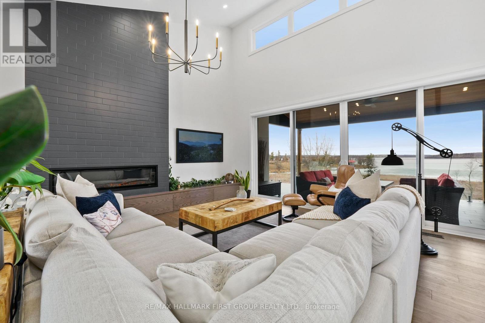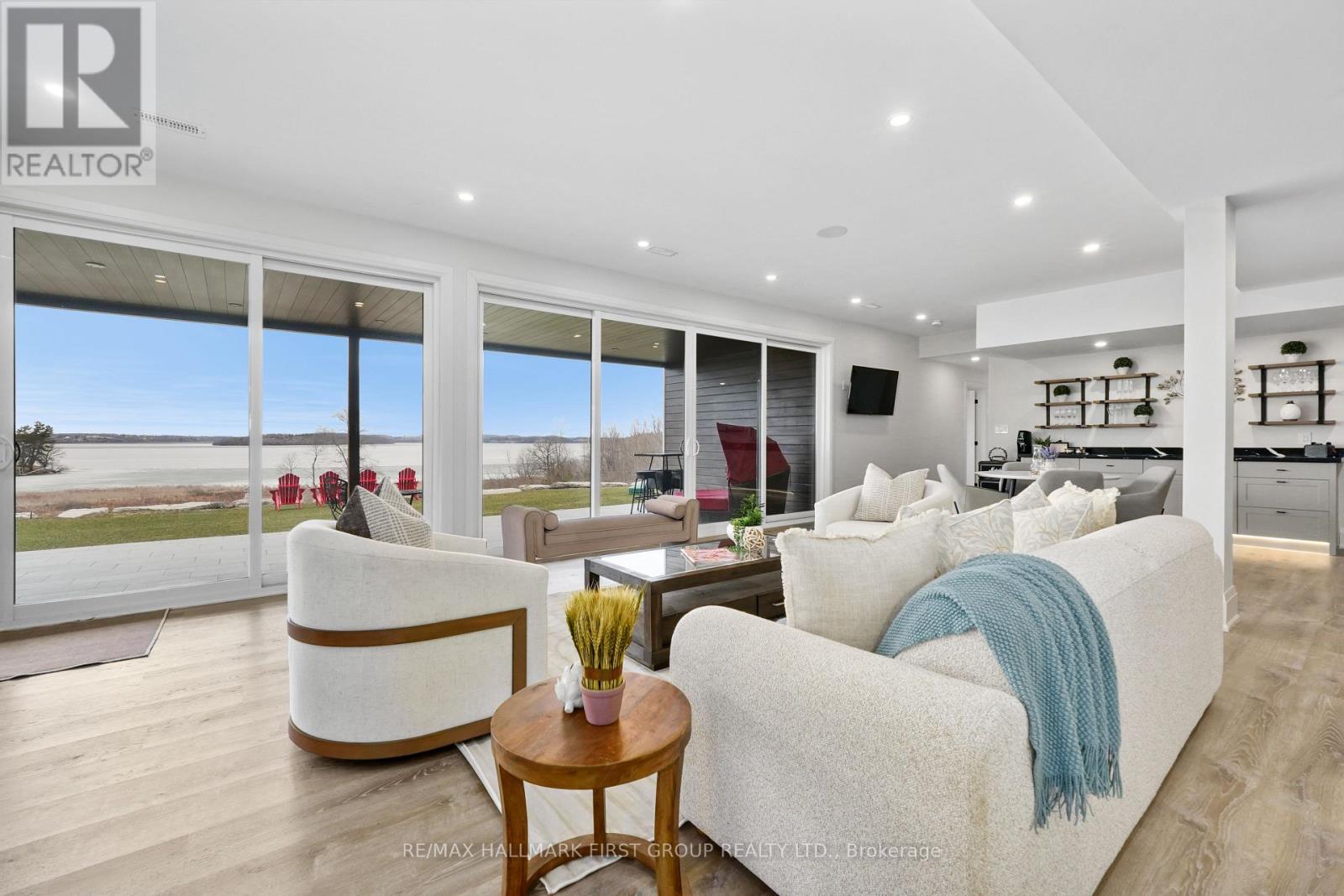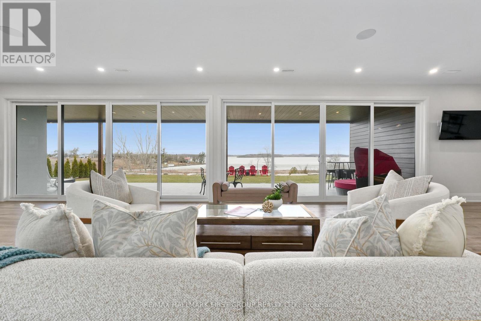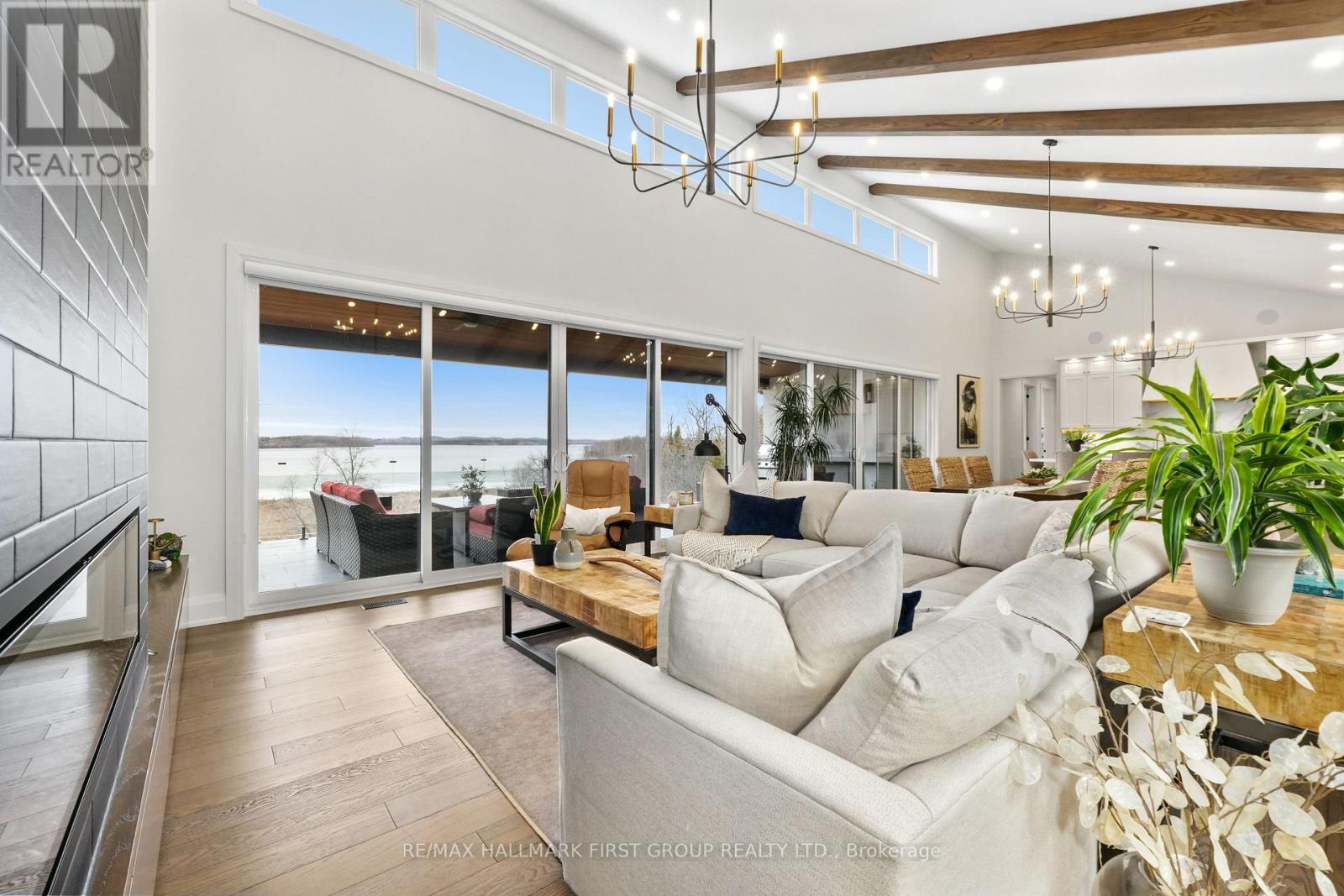 Set on 1.79 acres along the picturesque shores of Rice Lake, this extraordinary waterfront bungalow offers over 5,000 square feet of elevated living with five bedrooms, four bathrooms, a heated four-car attached garage, and a whole-home Generac generator for added peace of mind. A stunning great room sets the tone with soaring vaulted ceilings, exposed beams, and expansive upper windows that pour natural light into the space. A dramatic wall of windows with walkout captures sweeping lake views, creating a seamless connection between indoors and out. The living area is anchored by a striking fireplace with built-in cabinetry, adding both warmth and architectural interest. Designed for gathering, the open dining area flows effortlessly into a beautifully appointed kitchen featuring extra-high cabinetry, sleek matching countertops and backsplash, stainless steel appliances, and a large island with breakfast bar and statement lighting. A separate coffee bar with open shelving adds a stylish touch. Just beyond, a finished laundry room, guest bathroom, and mudroom with a dog wash station offer everyday function. The main level primary suite is a true retreat, with unobstructed lake views and a private walkout to the deck, perfect for quiet mornings by the water. The spa-inspired ensuite showcases heated floors, a double vanity, soaker tub, glass shower, and a private water closet. Two additional bedrooms and a full bathroom complete the level. The lower level continues to impress with in-floor heating throughout, a sprawling recreation and games room with a wall of windows overlooking the lake, multiple walkouts, a wet bar, theatre room, two bright bedrooms, and a full bathroom, ideal for guests or extended family. Outdoors, thoughtfully designed spaces invite you to relax and entertain with an upper deck offering both covered and open seating, a lower covered patio, tiered gardens, and lush landscaping, all set against the backdrop of tranquil waterfront living. (id:4555)