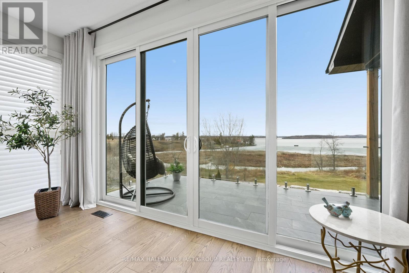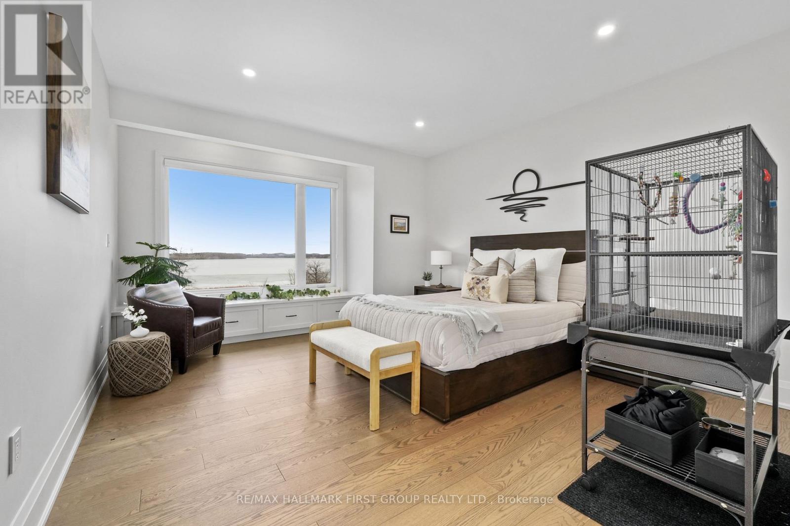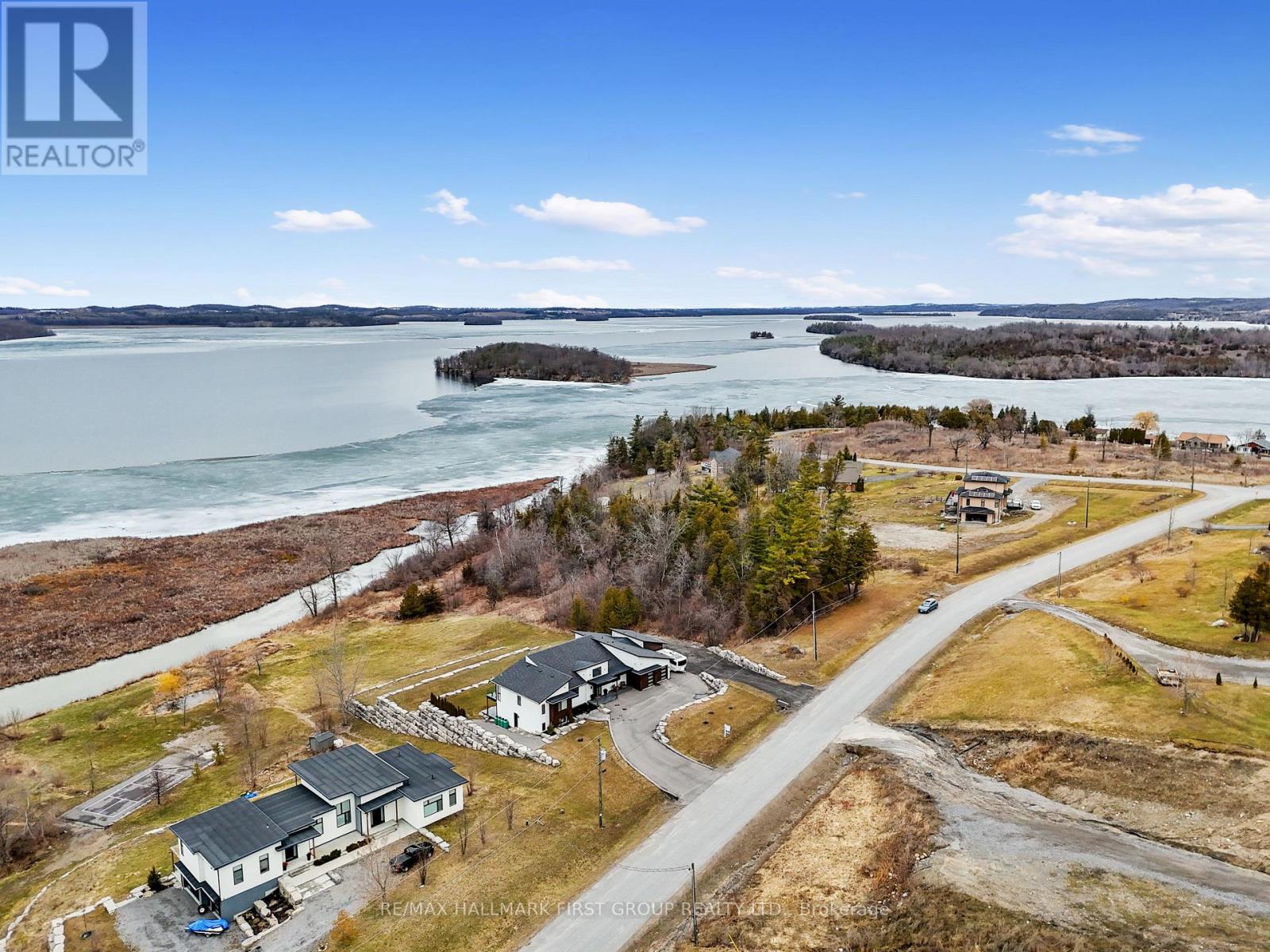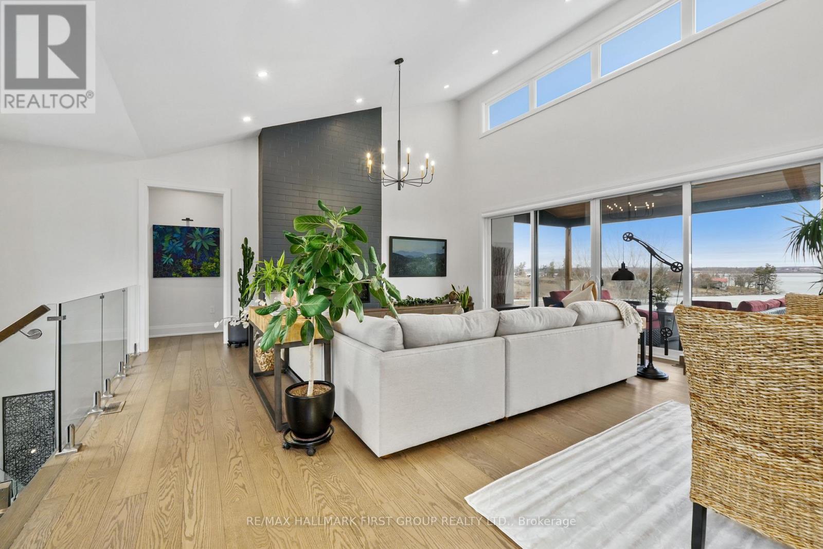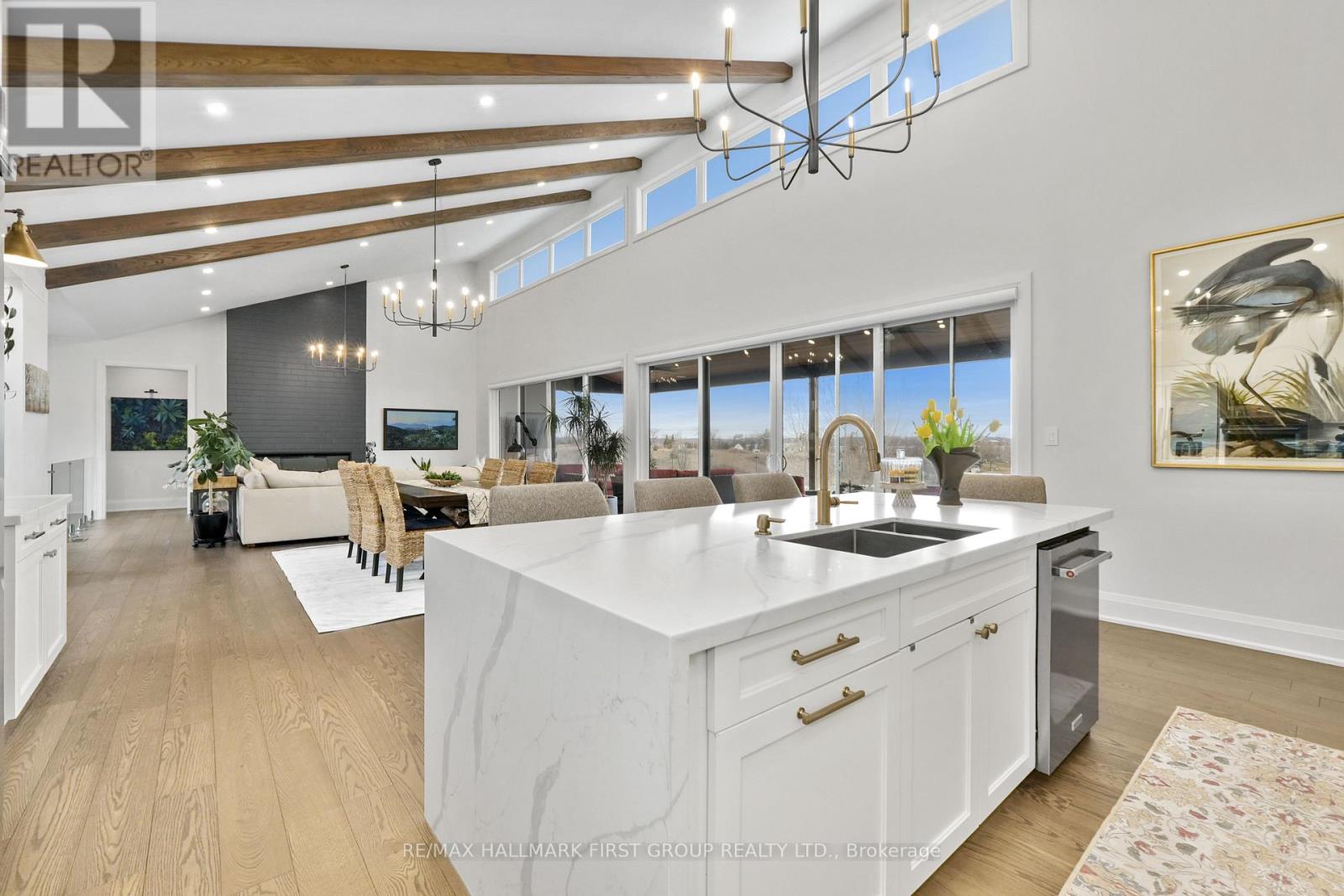 Set on 1.79 acres along the picturesque shores of Rice Lake, this extraordinary waterfront bungalow offers over 5,000 square feet of elevated living with five bedrooms, four bathrooms, a heated four-car attached garage, and a whole-home Generac generator for added peace of mind. A stunning great room sets the tone with soaring vaulted ceilings, exposed beams, and expansive upper windows that pour natural light into the space. A dramatic wall of windows with walkout captures sweeping lake views, creating a seamless connection between indoors and out. The living area is anchored by a striking fireplace with built-in cabinetry, adding both warmth and architectural interest. Designed for gathering, the open dining area flows effortlessly into a beautifully appointed kitchen featuring extra-high cabinetry, sleek matching countertops and backsplash, stainless steel appliances, and a large island with breakfast bar and statement lighting. A separate coffee bar with open shelving adds a stylish touch. Just beyond, a finished laundry room, guest bathroom, and mudroom with a dog wash station offer everyday function. The main level primary suite is a true retreat, with unobstructed lake views and a private walkout to the deck, perfect for quiet mornings by the water. The spa-inspired ensuite showcases heated floors, a double vanity, soaker tub, glass shower, and a private water closet. Two additional bedrooms and a full bathroom complete the level. The lower level continues to impress with in-floor heating throughout, a sprawling recreation and games room with a wall of windows overlooking the lake, multiple walkouts, a wet bar, theatre room, two bright bedrooms, and a full bathroom, ideal for guests or extended family. Outdoors, thoughtfully designed spaces invite you to relax and entertain with an upper deck offering both covered and open seating, a lower covered patio, tiered gardens, and lush landscaping, all set against the backdrop of tranquil waterfront living. (id:4555)