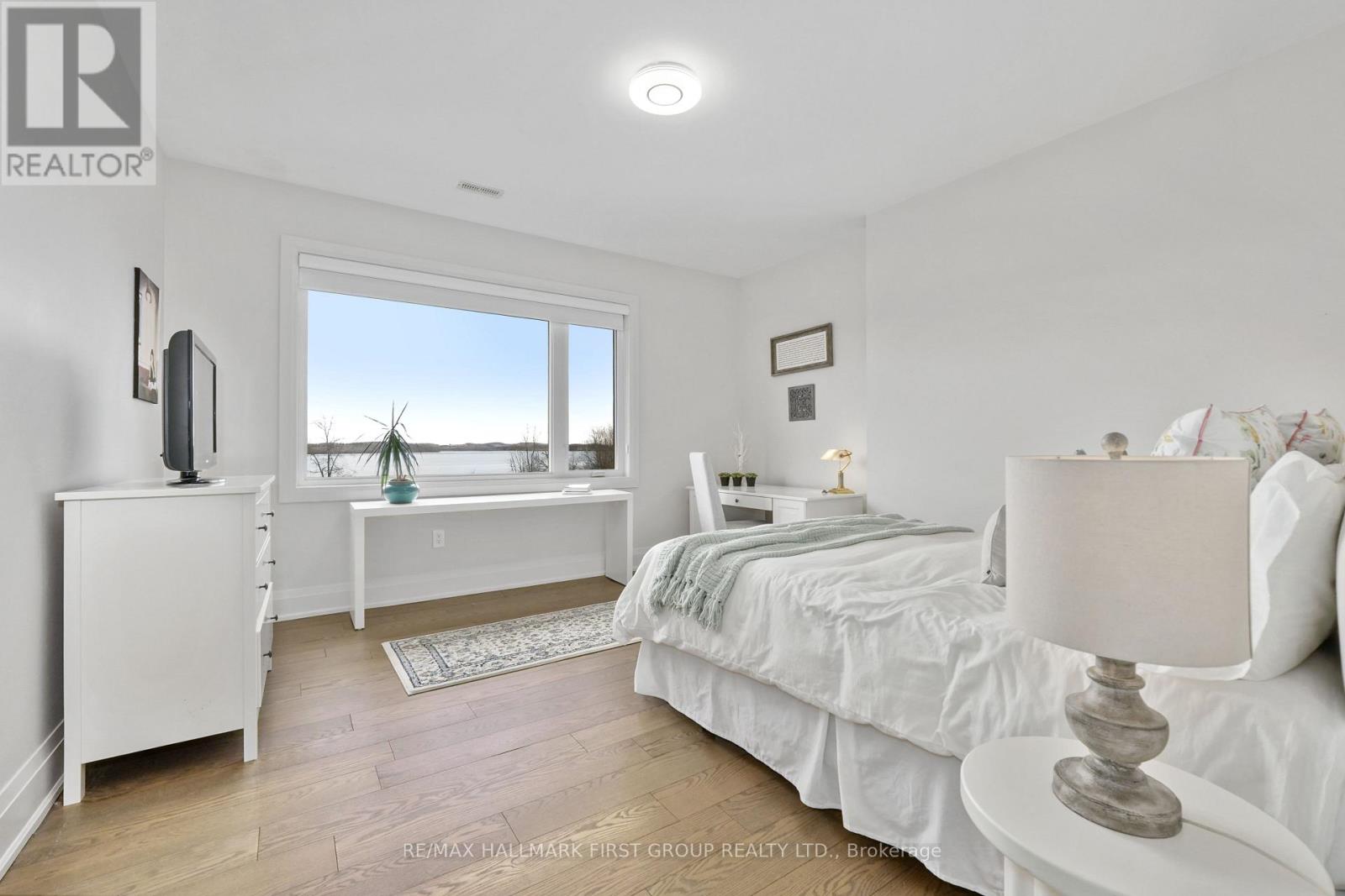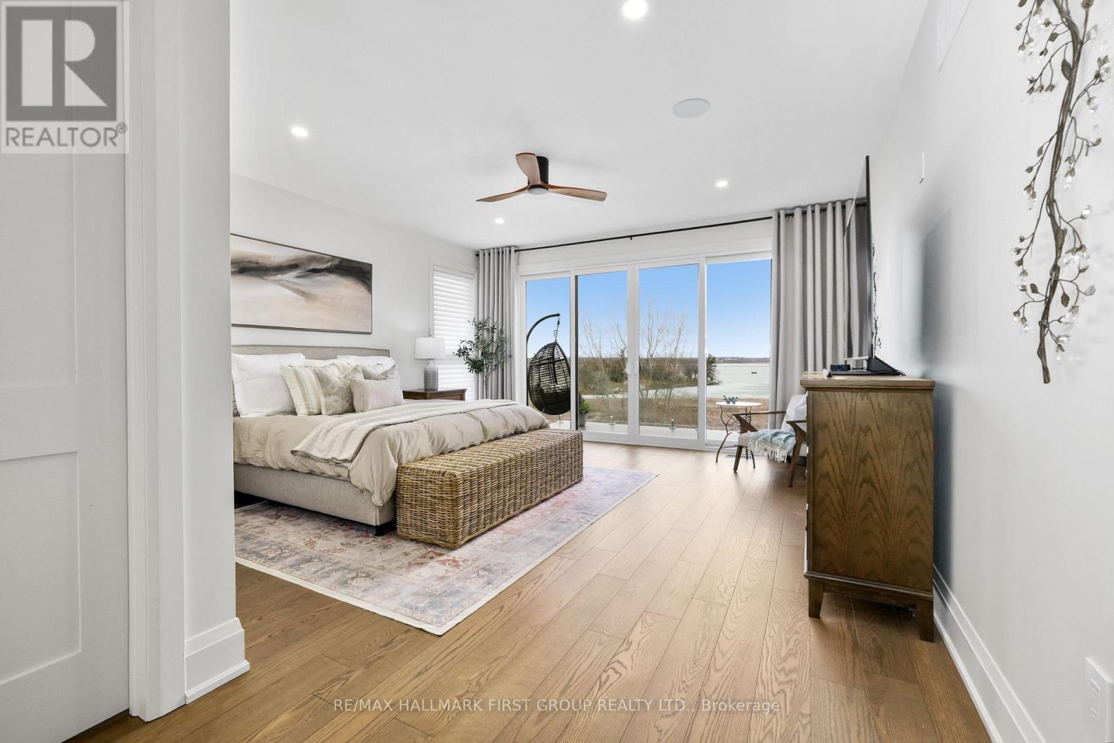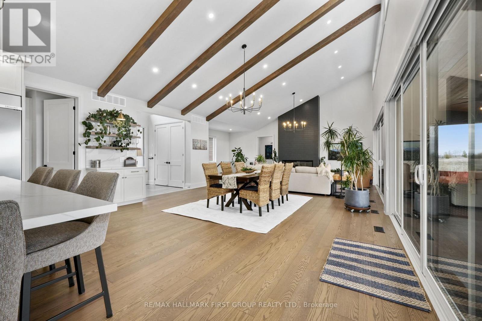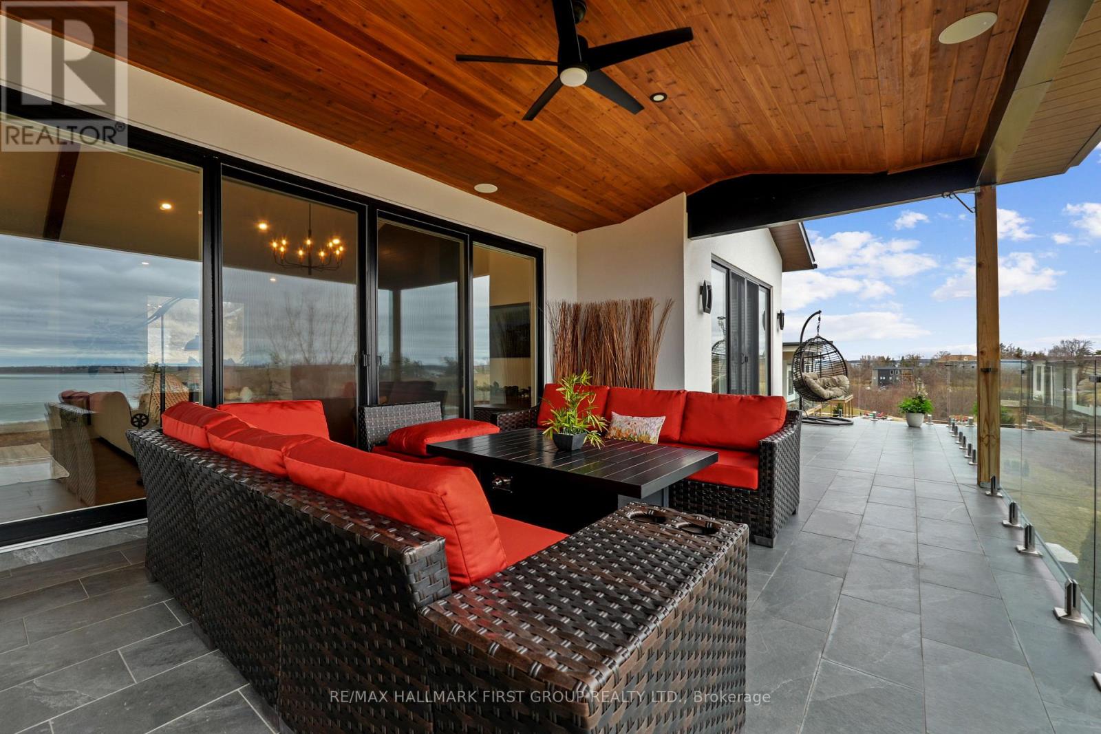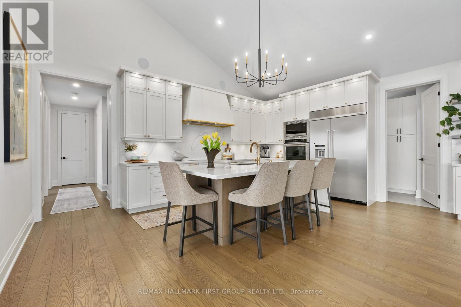 Set on 1.79 acres along the picturesque shores of Rice Lake, this extraordinary waterfront bungalow offers over 5,000 square feet of elevated living with five bedrooms, four bathrooms, a heated four-car attached garage, and a whole-home Generac generator for added peace of mind. A stunning great room sets the tone with soaring vaulted ceilings, exposed beams, and expansive upper windows that pour natural light into the space. A dramatic wall of windows with walkout captures sweeping lake views, creating a seamless connection between indoors and out. The living area is anchored by a striking fireplace with built-in cabinetry, adding both warmth and architectural interest. Designed for gathering, the open dining area flows effortlessly into a beautifully appointed kitchen featuring extra-high cabinetry, sleek matching countertops and backsplash, stainless steel appliances, and a large island with breakfast bar and statement lighting. A separate coffee bar with open shelving adds a stylish touch. Just beyond, a finished laundry room, guest bathroom, and mudroom with a dog wash station offer everyday function. The main level primary suite is a true retreat, with unobstructed lake views and a private walkout to the deck, perfect for quiet mornings by the water. The spa-inspired ensuite showcases heated floors, a double vanity, soaker tub, glass shower, and a private water closet. Two additional bedrooms and a full bathroom complete the level. The lower level continues to impress with in-floor heating throughout, a sprawling recreation and games room with a wall of windows overlooking the lake, multiple walkouts, a wet bar, theatre room, two bright bedrooms, and a full bathroom, ideal for guests or extended family. Outdoors, thoughtfully designed spaces invite you to relax and entertain with an upper deck offering both covered and open seating, a lower covered patio, tiered gardens, and lush landscaping, all set against the backdrop of tranquil waterfront living. (id:4555)