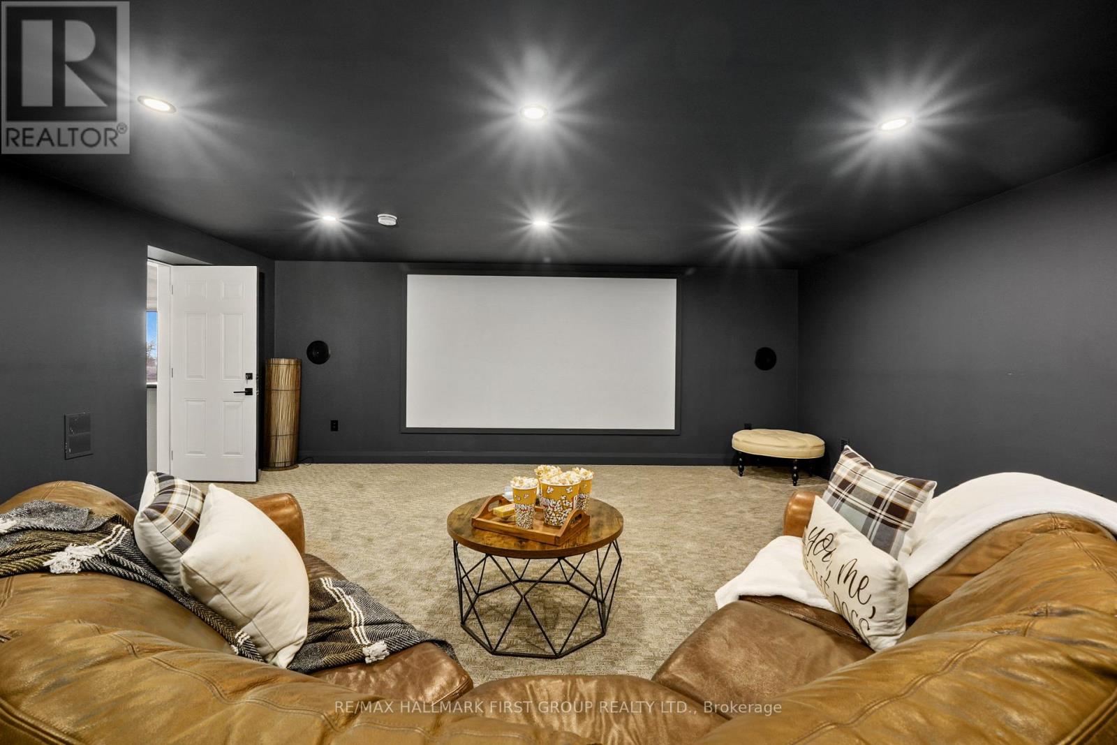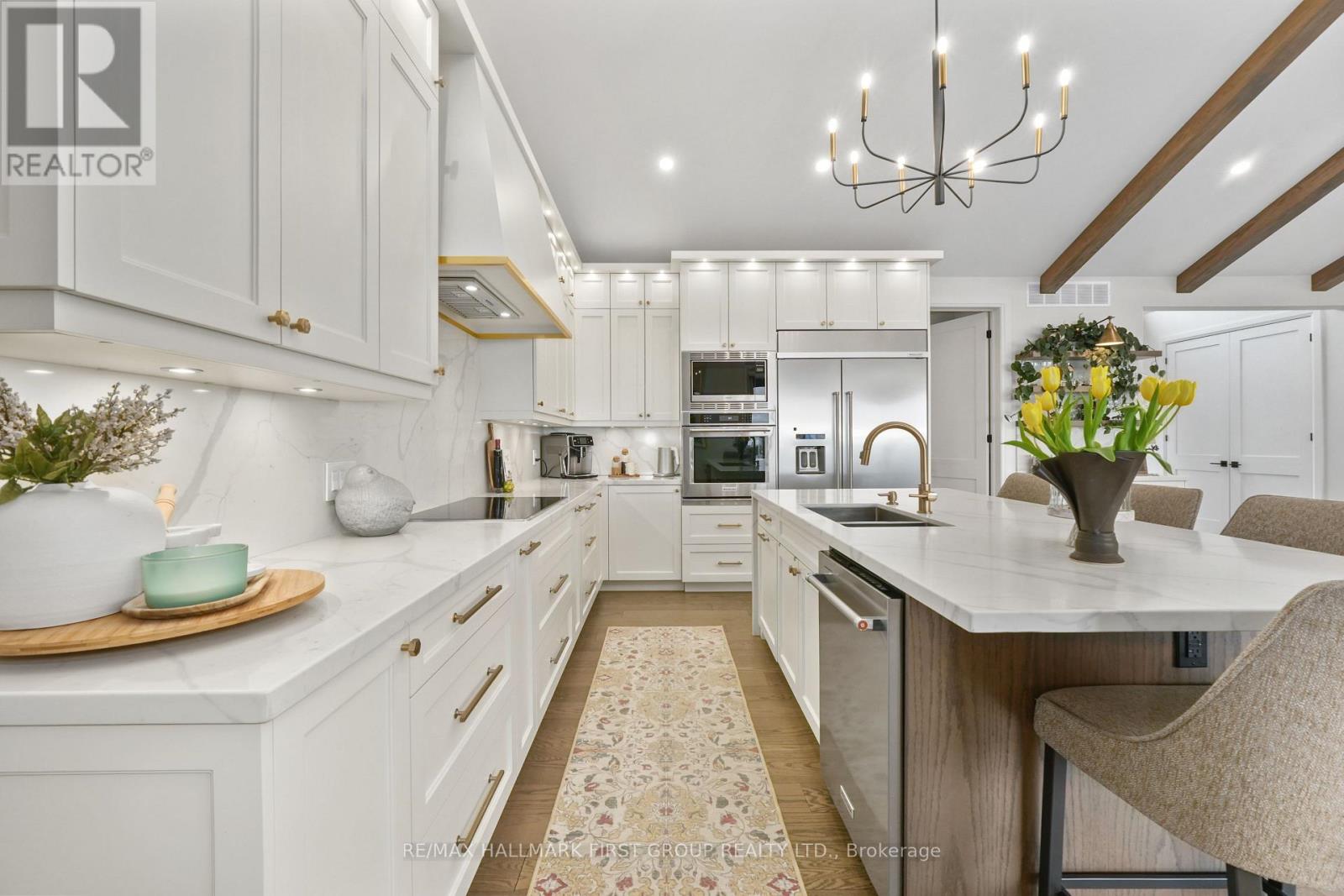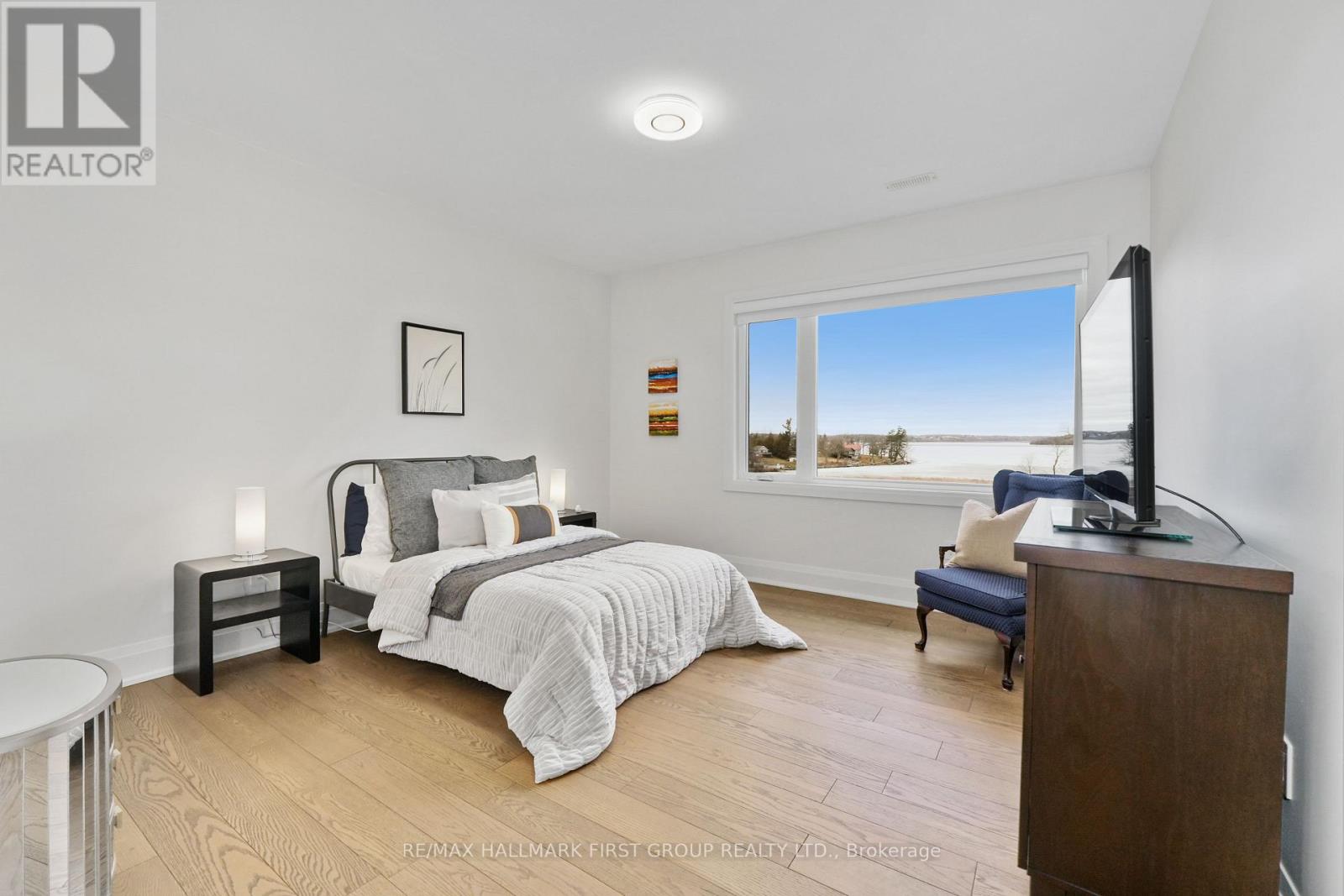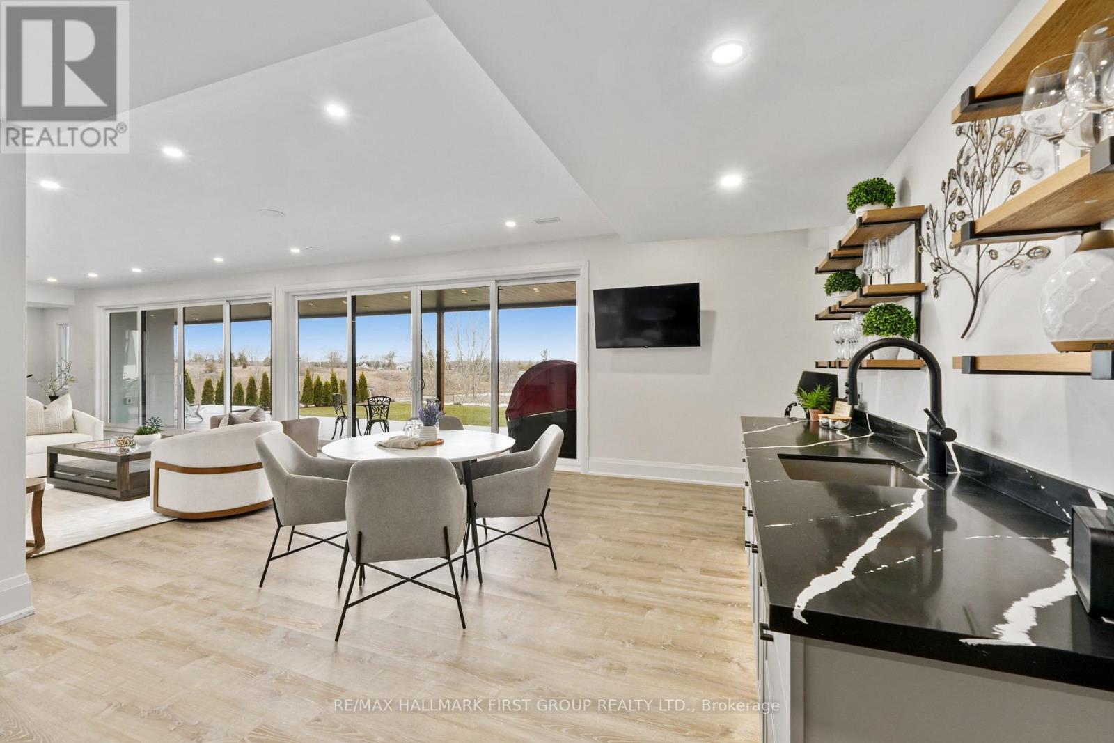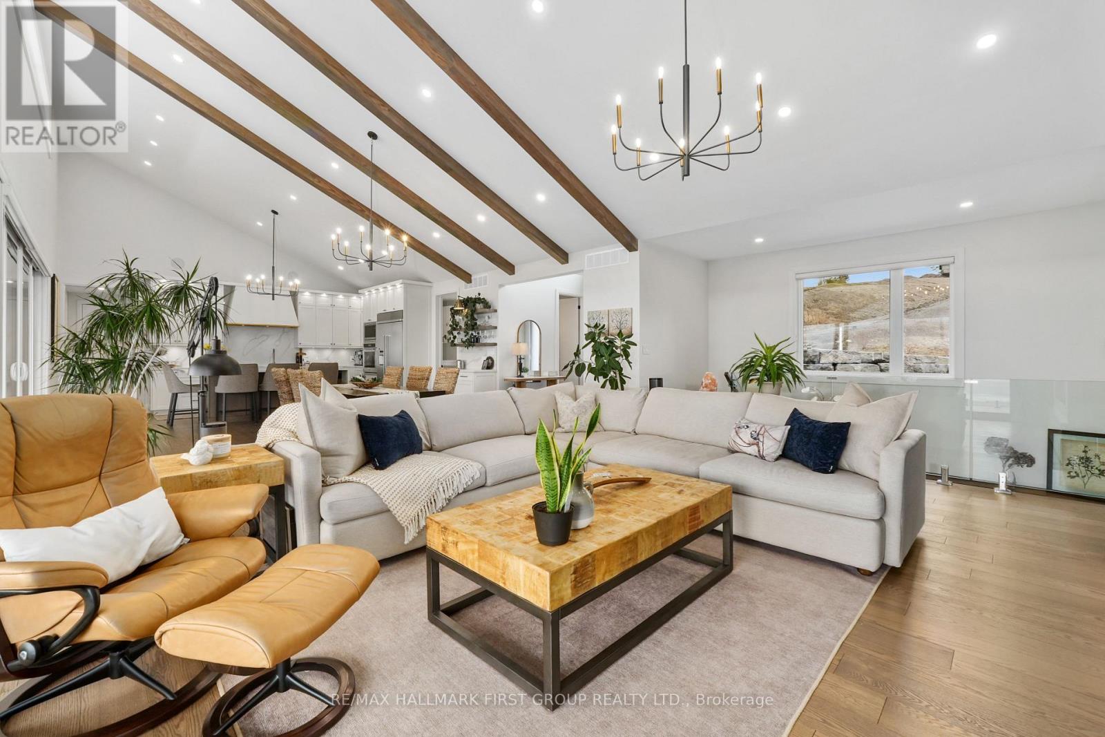 Set on 1.79 acres along the picturesque shores of Rice Lake, this extraordinary waterfront bungalow offers over 5,000 square feet of elevated living with five bedrooms, four bathrooms, a heated four-car attached garage, and a whole-home Generac generator for added peace of mind. A stunning great room sets the tone with soaring vaulted ceilings, exposed beams, and expansive upper windows that pour natural light into the space. A dramatic wall of windows with walkout captures sweeping lake views, creating a seamless connection between indoors and out. The living area is anchored by a striking fireplace with built-in cabinetry, adding both warmth and architectural interest. Designed for gathering, the open dining area flows effortlessly into a beautifully appointed kitchen featuring extra-high cabinetry, sleek matching countertops and backsplash, stainless steel appliances, and a large island with breakfast bar and statement lighting. A separate coffee bar with open shelving adds a stylish touch. Just beyond, a finished laundry room, guest bathroom, and mudroom with a dog wash station offer everyday function. The main level primary suite is a true retreat, with unobstructed lake views and a private walkout to the deck, perfect for quiet mornings by the water. The spa-inspired ensuite showcases heated floors, a double vanity, soaker tub, glass shower, and a private water closet. Two additional bedrooms and a full bathroom complete the level. The lower level continues to impress with in-floor heating throughout, a sprawling recreation and games room with a wall of windows overlooking the lake, multiple walkouts, a wet bar, theatre room, two bright bedrooms, and a full bathroom, ideal for guests or extended family. Outdoors, thoughtfully designed spaces invite you to relax and entertain with an upper deck offering both covered and open seating, a lower covered patio, tiered gardens, and lush landscaping, all set against the backdrop of tranquil waterfront living. (id:4555)