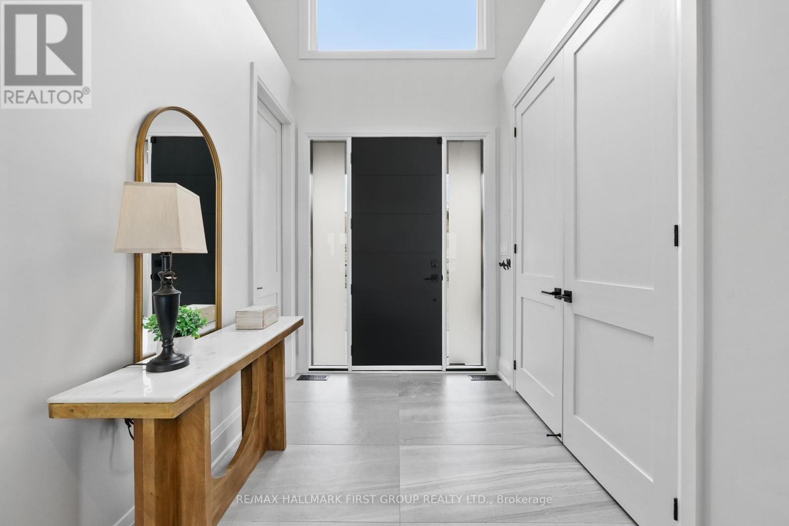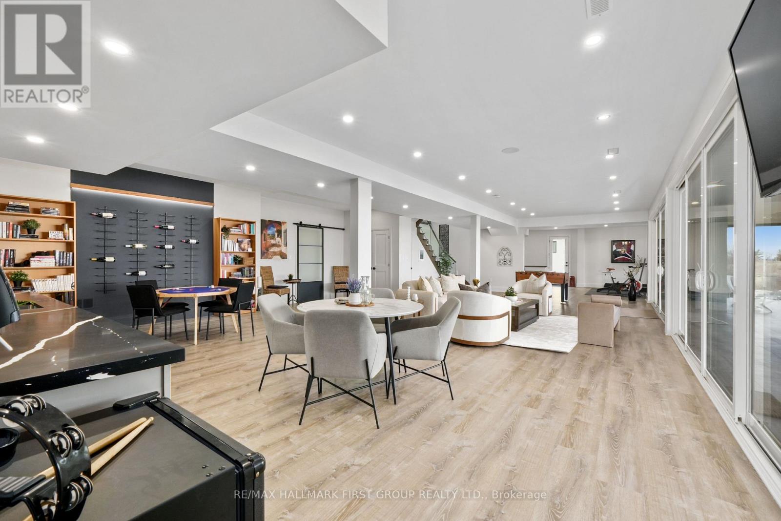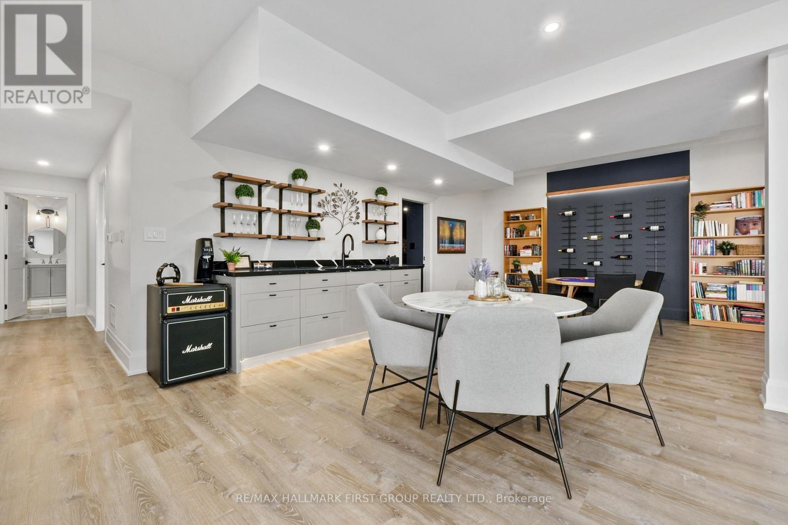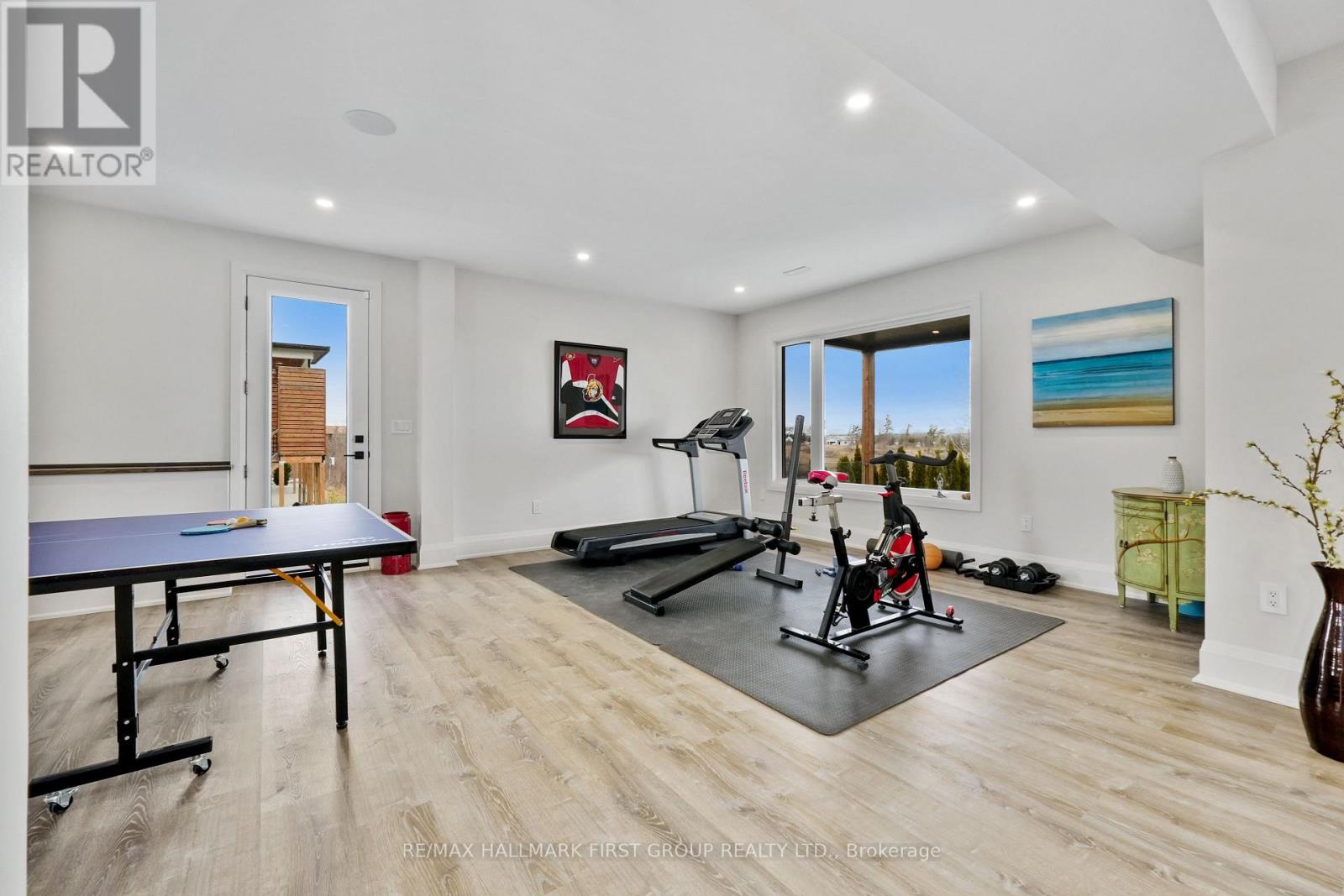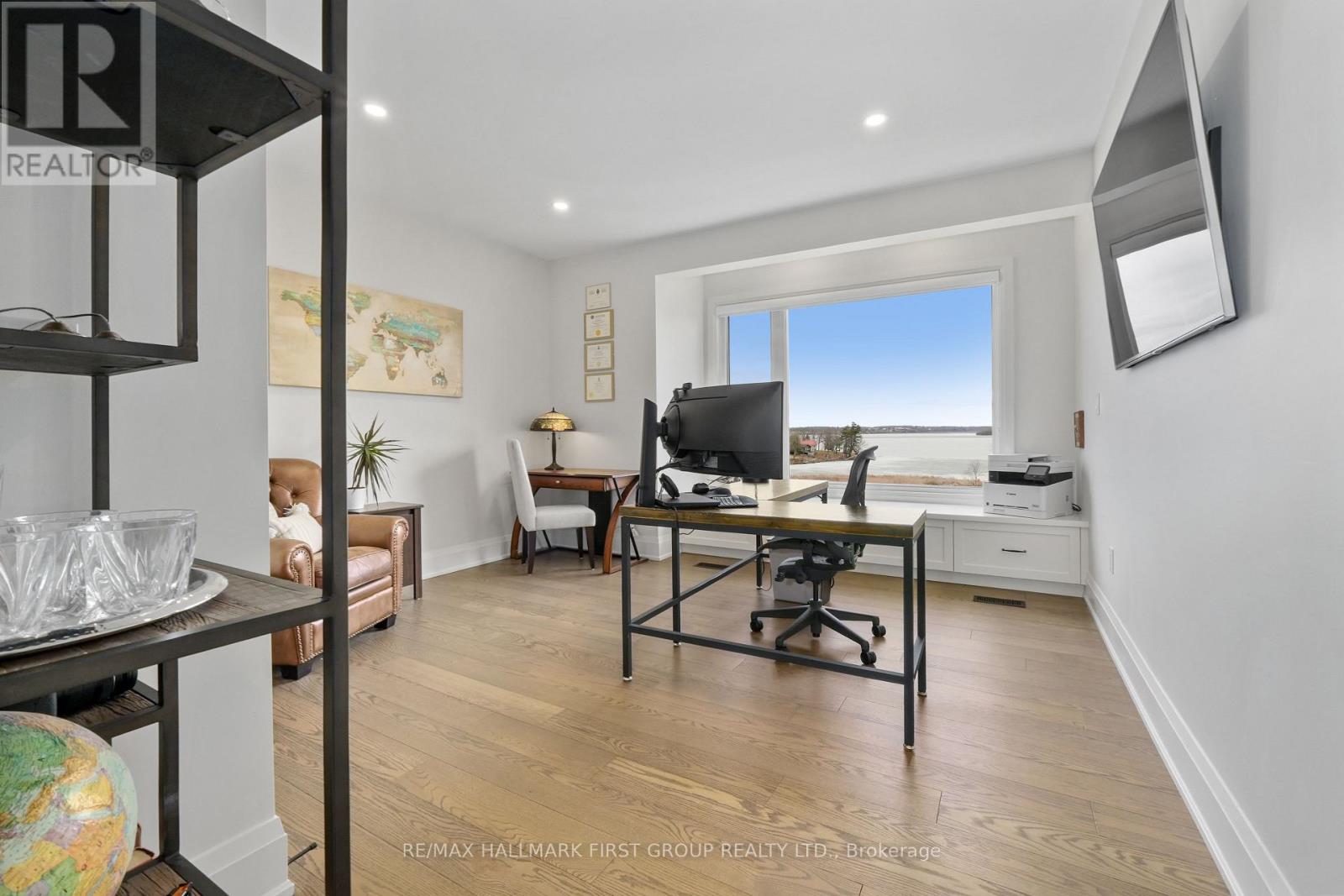 Set on 1.79 acres along the picturesque shores of Rice Lake, this extraordinary waterfront bungalow offers over 5,000 square feet of elevated living with five bedrooms, four bathrooms, a heated four-car attached garage, and a whole-home Generac generator for added peace of mind. A stunning great room sets the tone with soaring vaulted ceilings, exposed beams, and expansive upper windows that pour natural light into the space. A dramatic wall of windows with walkout captures sweeping lake views, creating a seamless connection between indoors and out. The living area is anchored by a striking fireplace with built-in cabinetry, adding both warmth and architectural interest. Designed for gathering, the open dining area flows effortlessly into a beautifully appointed kitchen featuring extra-high cabinetry, sleek matching countertops and backsplash, stainless steel appliances, and a large island with breakfast bar and statement lighting. A separate coffee bar with open shelving adds a stylish touch. Just beyond, a finished laundry room, guest bathroom, and mudroom with a dog wash station offer everyday function. The main level primary suite is a true retreat, with unobstructed lake views and a private walkout to the deck, perfect for quiet mornings by the water. The spa-inspired ensuite showcases heated floors, a double vanity, soaker tub, glass shower, and a private water closet. Two additional bedrooms and a full bathroom complete the level. The lower level continues to impress with in-floor heating throughout, a sprawling recreation and games room with a wall of windows overlooking the lake, multiple walkouts, a wet bar, theatre room, two bright bedrooms, and a full bathroom, ideal for guests or extended family. Outdoors, thoughtfully designed spaces invite you to relax and entertain with an upper deck offering both covered and open seating, a lower covered patio, tiered gardens, and lush landscaping, all set against the backdrop of tranquil waterfront living. (id:4555)