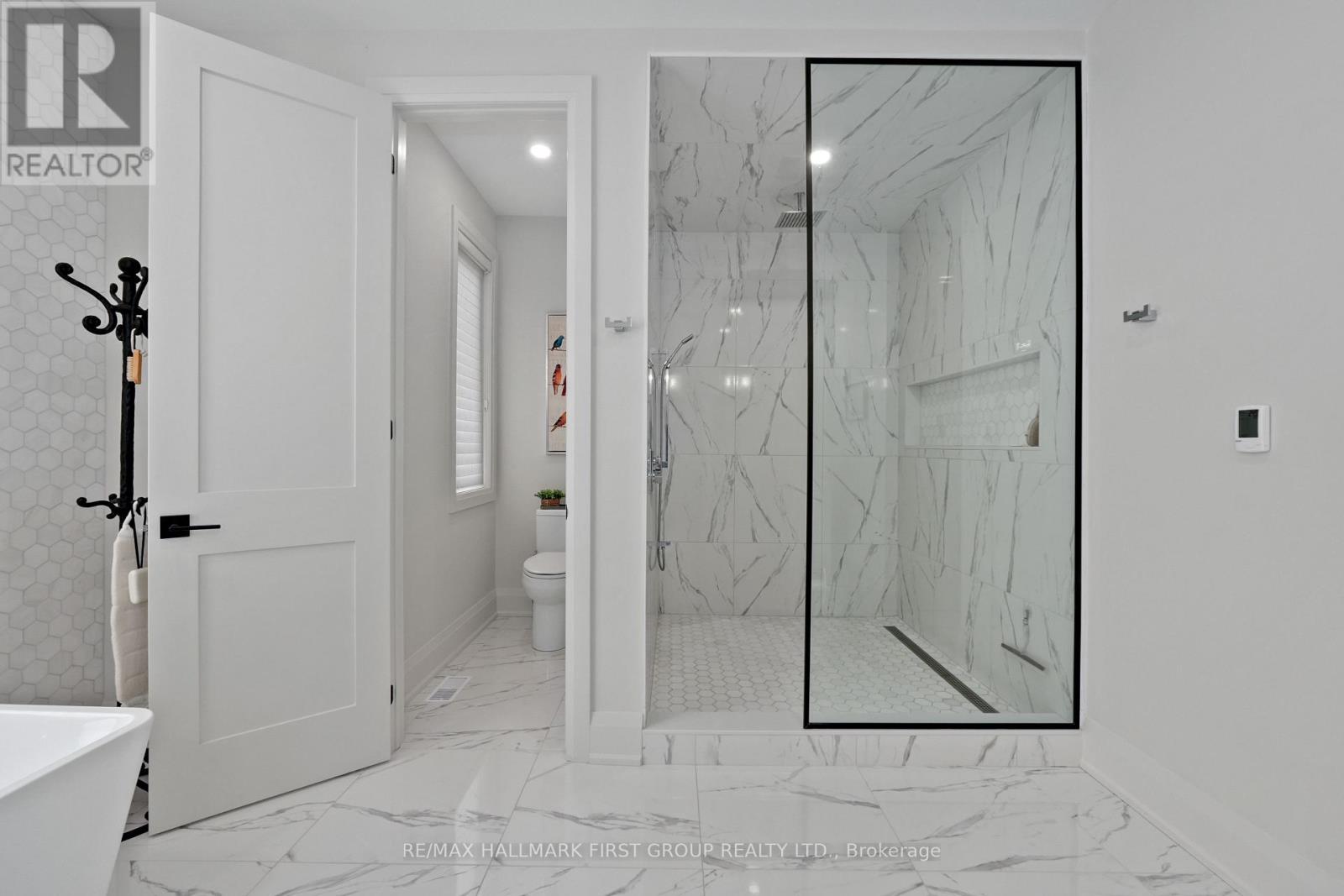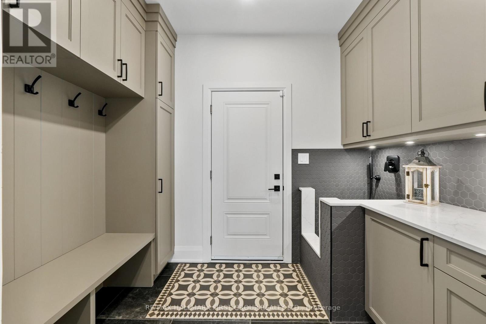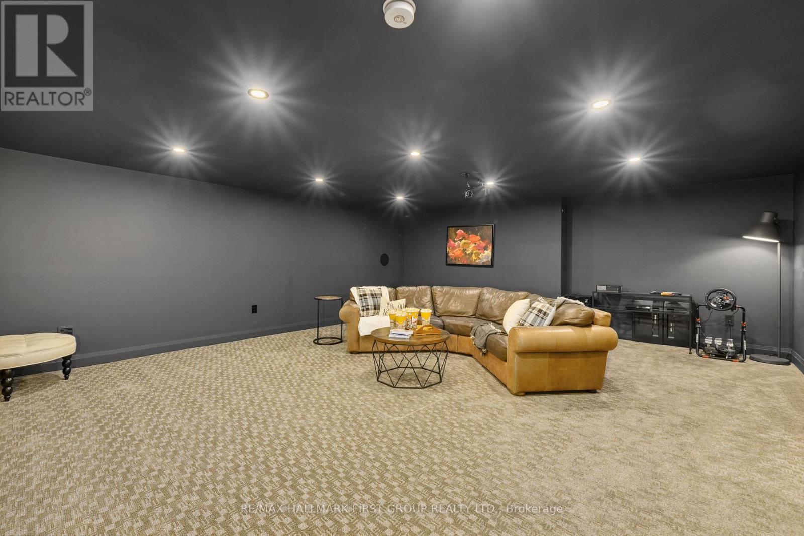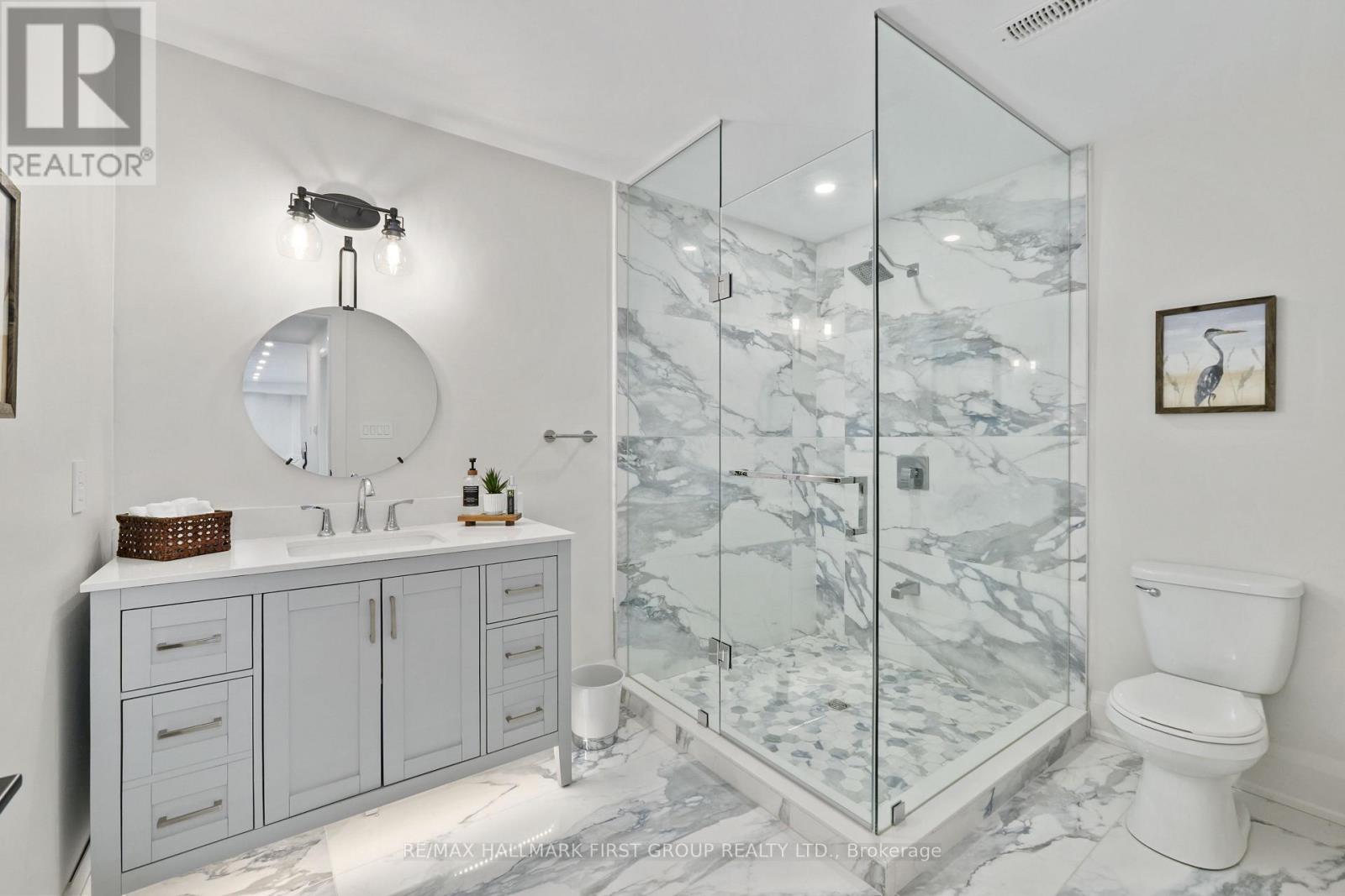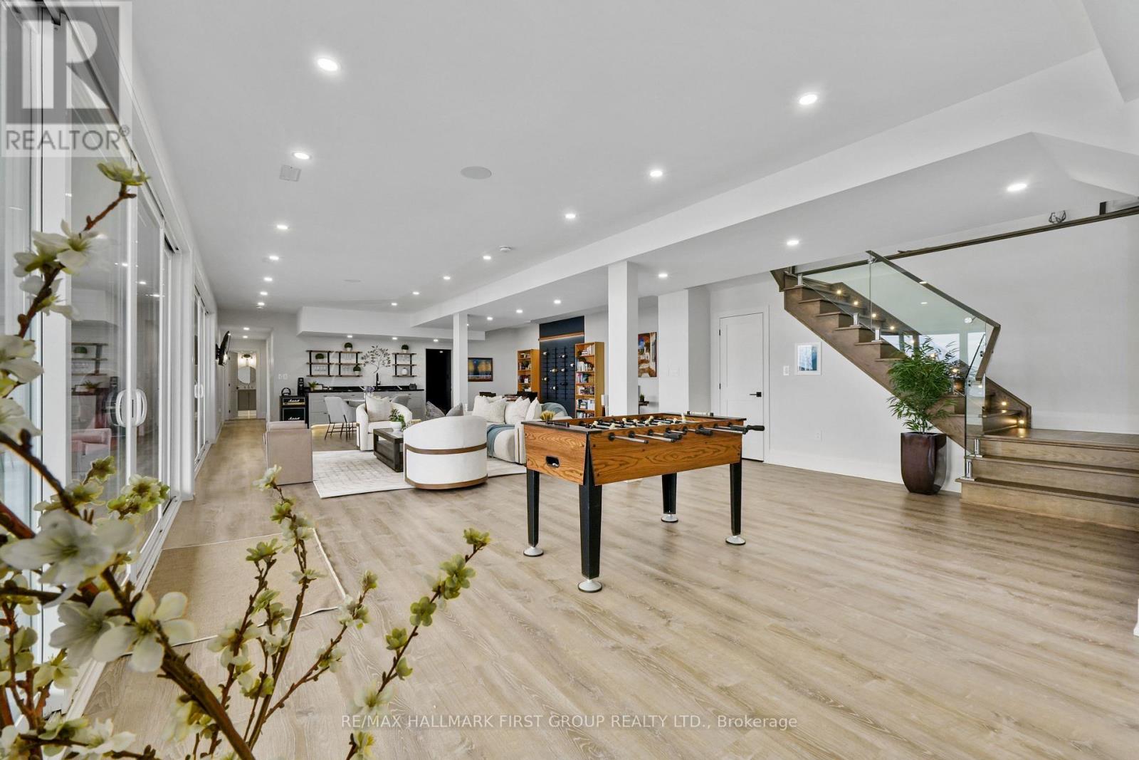 Set on 1.79 acres along the picturesque shores of Rice Lake, this extraordinary waterfront bungalow offers over 5,000 square feet of elevated living with five bedrooms, four bathrooms, a heated four-car attached garage, and a whole-home Generac generator for added peace of mind. A stunning great room sets the tone with soaring vaulted ceilings, exposed beams, and expansive upper windows that pour natural light into the space. A dramatic wall of windows with walkout captures sweeping lake views, creating a seamless connection between indoors and out. The living area is anchored by a striking fireplace with built-in cabinetry, adding both warmth and architectural interest. Designed for gathering, the open dining area flows effortlessly into a beautifully appointed kitchen featuring extra-high cabinetry, sleek matching countertops and backsplash, stainless steel appliances, and a large island with breakfast bar and statement lighting. A separate coffee bar with open shelving adds a stylish touch. Just beyond, a finished laundry room, guest bathroom, and mudroom with a dog wash station offer everyday function. The main level primary suite is a true retreat, with unobstructed lake views and a private walkout to the deck, perfect for quiet mornings by the water. The spa-inspired ensuite showcases heated floors, a double vanity, soaker tub, glass shower, and a private water closet. Two additional bedrooms and a full bathroom complete the level. The lower level continues to impress with in-floor heating throughout, a sprawling recreation and games room with a wall of windows overlooking the lake, multiple walkouts, a wet bar, theatre room, two bright bedrooms, and a full bathroom, ideal for guests or extended family. Outdoors, thoughtfully designed spaces invite you to relax and entertain with an upper deck offering both covered and open seating, a lower covered patio, tiered gardens, and lush landscaping, all set against the backdrop of tranquil waterfront living. (id:4555)