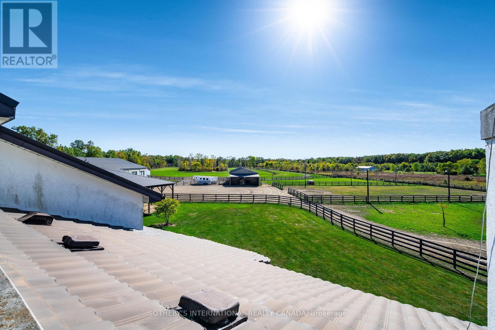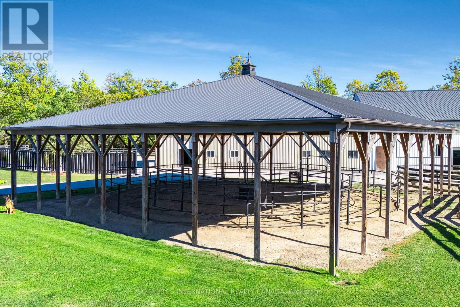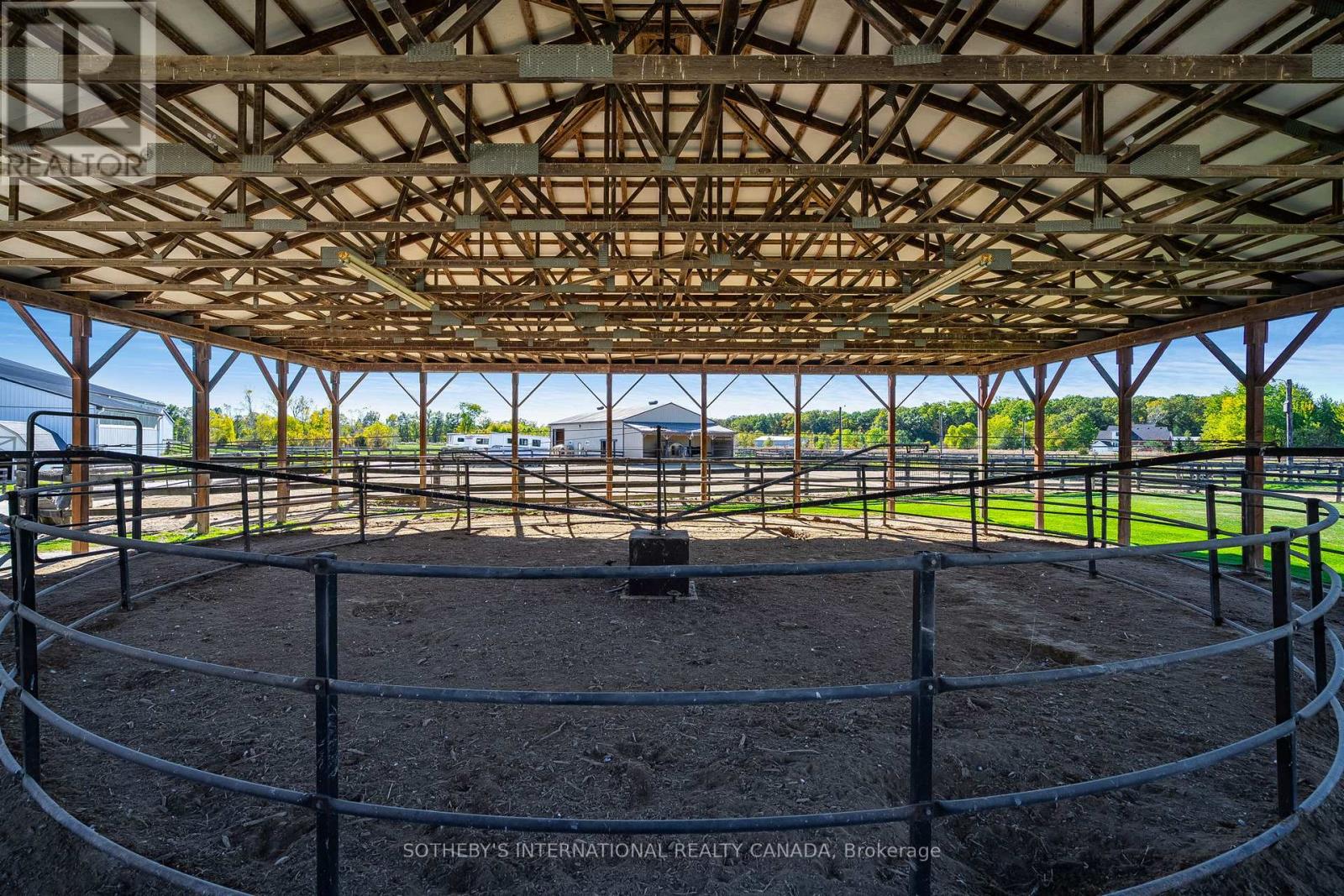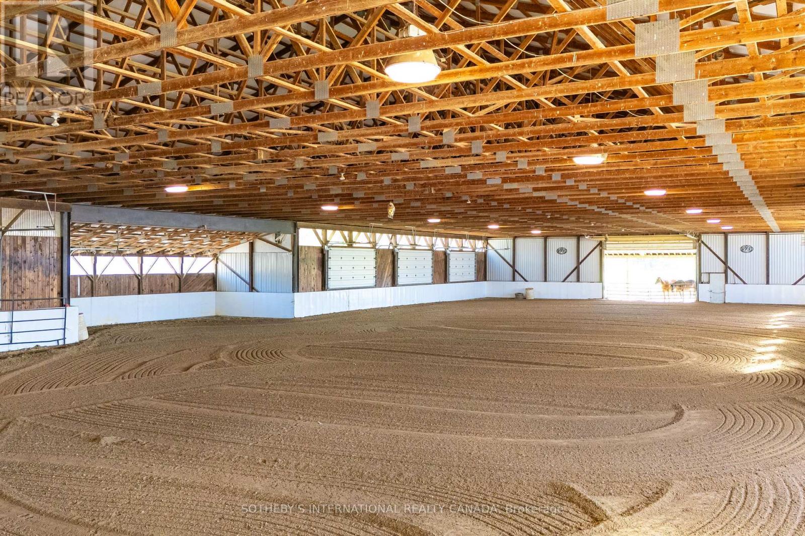 A unique modern ranch on nearly 20 acres with premier equestrian facilities. Royal Run Ranch features an 80x200 indoor arena with roll up doors for natural light and airflow, heated 12-stall barn with tack room and automatic waterers, hay barn, 6 fenced paddocks, 2 covered horse shelters, and insulated covered horse walker. Arena offers east-side parking for trailers and equipment. The home blends modern style with farmhouse charm, offering formal living/dining, open family room with fireplace, elevated kitchen overlooking back paddocks, and 4 fireplaces total. Primary suite on its own floor with walk-in closet, jacuzzi tub, and separate shower. Lower level includes gym, party room with wet bar, bonus rooms, and tanning room. Pond with finished track, mature trees, privacy, and scenic views complete this rare estate. (id:4555)