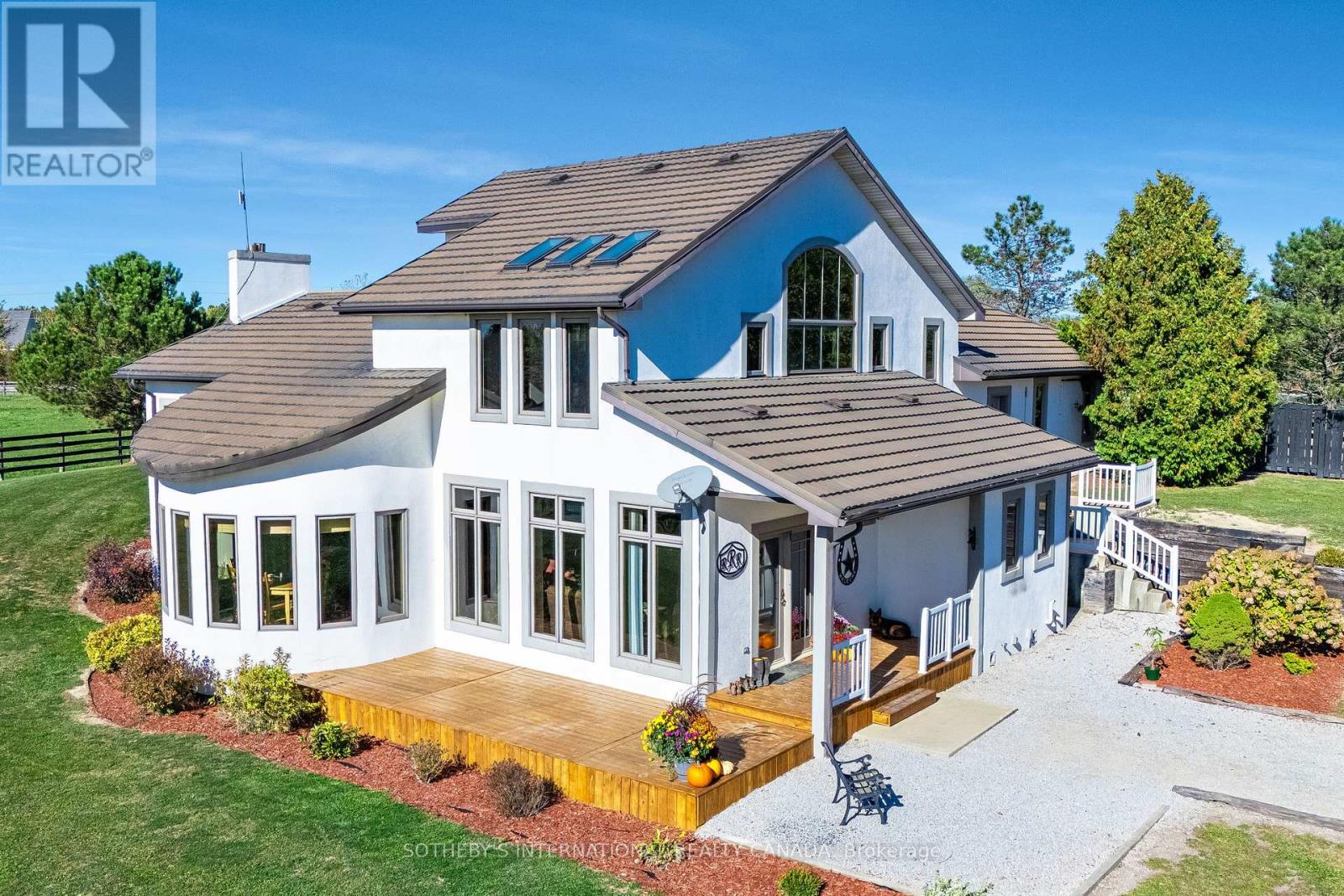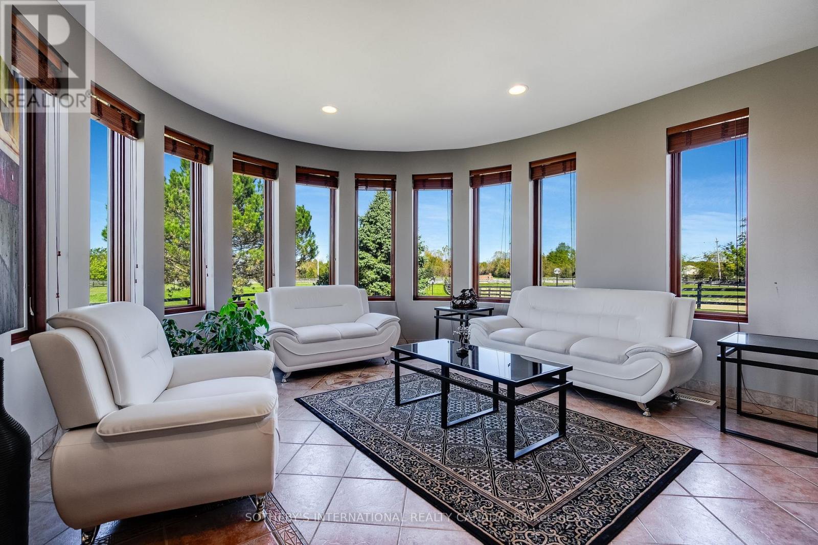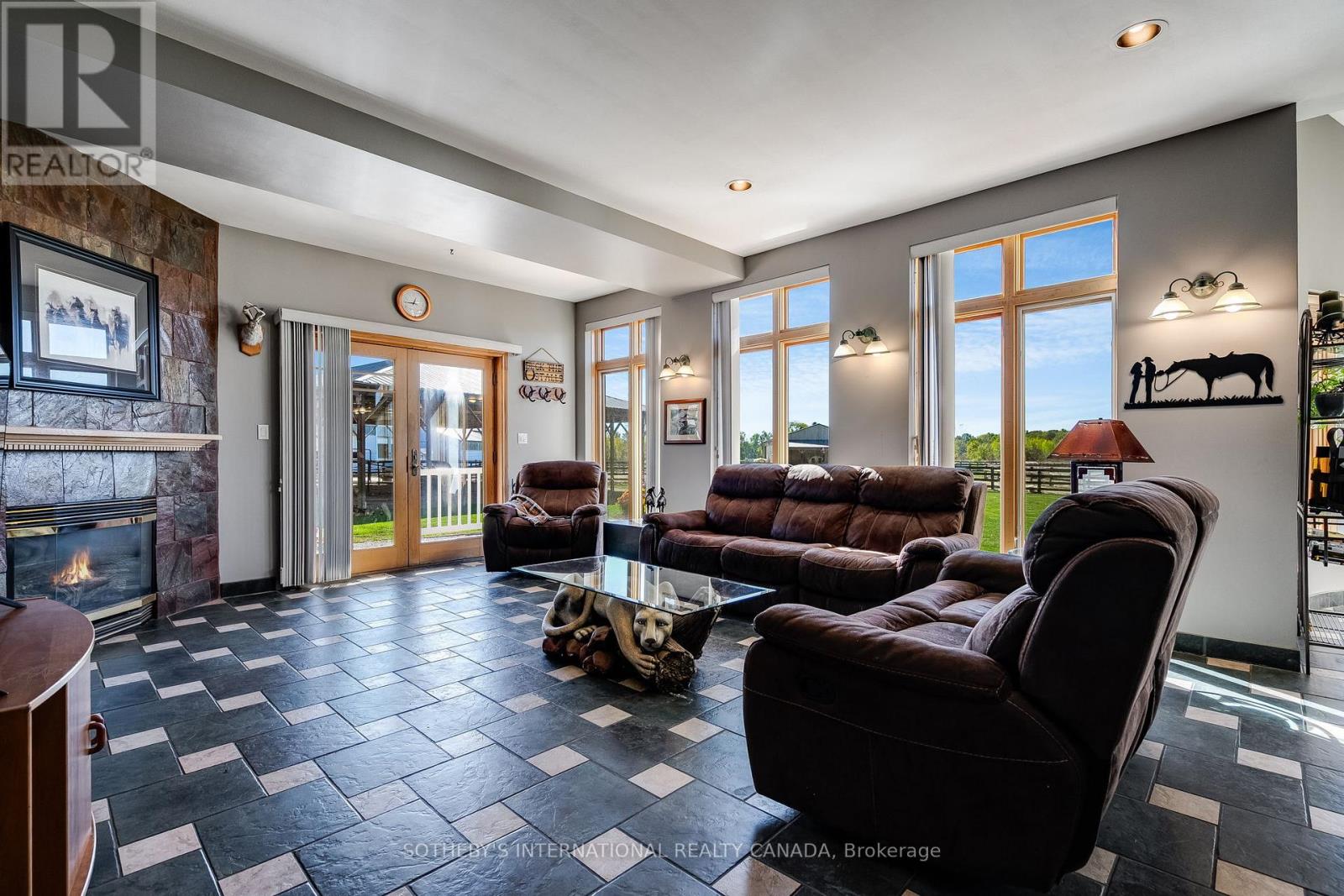 A unique modern ranch on nearly 20 acres with premier equestrian facilities. Royal Run Ranch features an 80x200 indoor arena with roll up doors for natural light and airflow, heated 12-stall barn with tack room and automatic waterers, hay barn, 6 fenced paddocks, 2 covered horse shelters, and insulated covered horse walker. Arena offers east-side parking for trailers and equipment. The home blends modern style with farmhouse charm, offering formal living/dining, open family room with fireplace, elevated kitchen overlooking back paddocks, and 4 fireplaces total. Primary suite on its own floor with walk-in closet, jacuzzi tub, and separate shower. Lower level includes gym, party room with wet bar, bonus rooms, and tanning room. Pond with finished track, mature trees, privacy, and scenic views complete this rare estate. (id:4555)