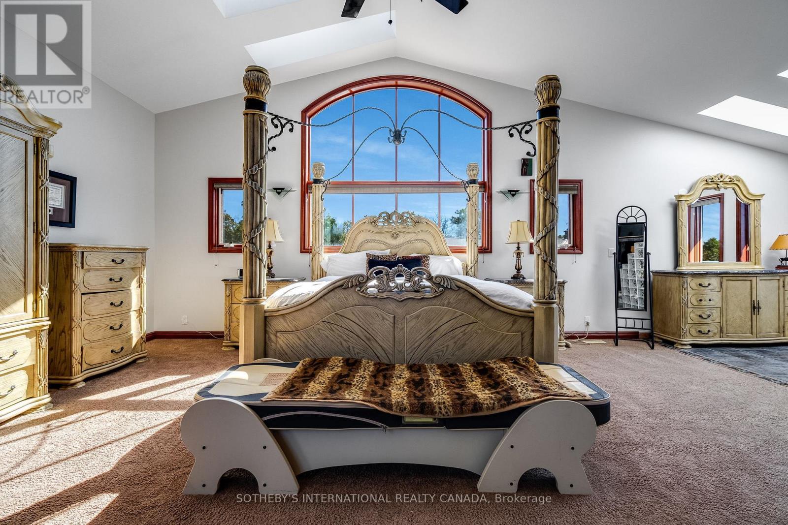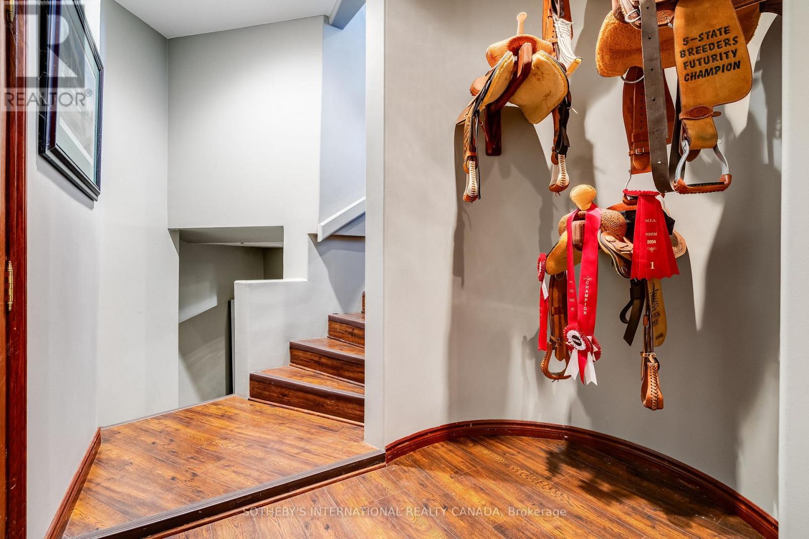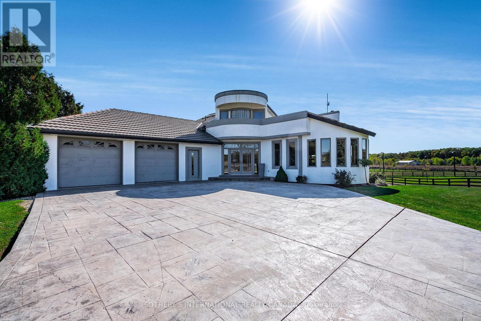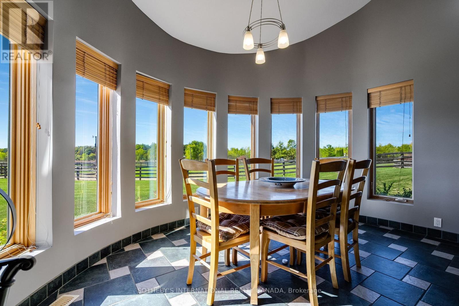 A unique modern ranch on nearly 20 acres with premier equestrian facilities. Royal Run Ranch features an 80x200 indoor arena with roll up doors for natural light and airflow, heated 12-stall barn with tack room and automatic waterers, hay barn, 6 fenced paddocks, 2 covered horse shelters, and insulated covered horse walker. Arena offers east-side parking for trailers and equipment. The home blends modern style with farmhouse charm, offering formal living/dining, open family room with fireplace, elevated kitchen overlooking back paddocks, and 4 fireplaces total. Primary suite on its own floor with walk-in closet, jacuzzi tub, and separate shower. Lower level includes gym, party room with wet bar, bonus rooms, and tanning room. Pond with finished track, mature trees, privacy, and scenic views complete this rare estate. (id:4555)