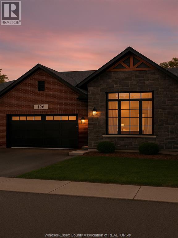 A beautifully crafted brick and stone ranch-style townhome nestled in the heart of Amherstburg’s newest residential enclave. Just minutes from the historic downtown core, this 1240 sq ft end unit blends timeless design with modern living, backing directly onto tranquil greenspace for added privacy and scenic views. This thoughtfully designed 2-bedroom, 2-bathroom single level residence features soaring ceiling heights and striking architectural details inspired by Amherstburg’s heritage and waterfront charm. Red brick, grey stone, and black accents highlight the exterior, while live dormers and a covered rear porch add both character and comfort. Inside, enjoy a bright, open-concept layout with two available kitchen configurations and refined contemporary finishes. The spacious double garage and double drive provide ample parking. Optional finished attic upgrade includes additional storage options. (id:4555)