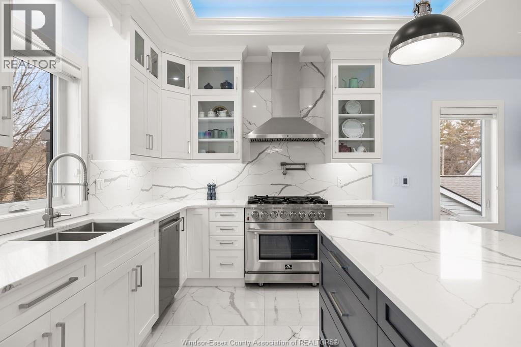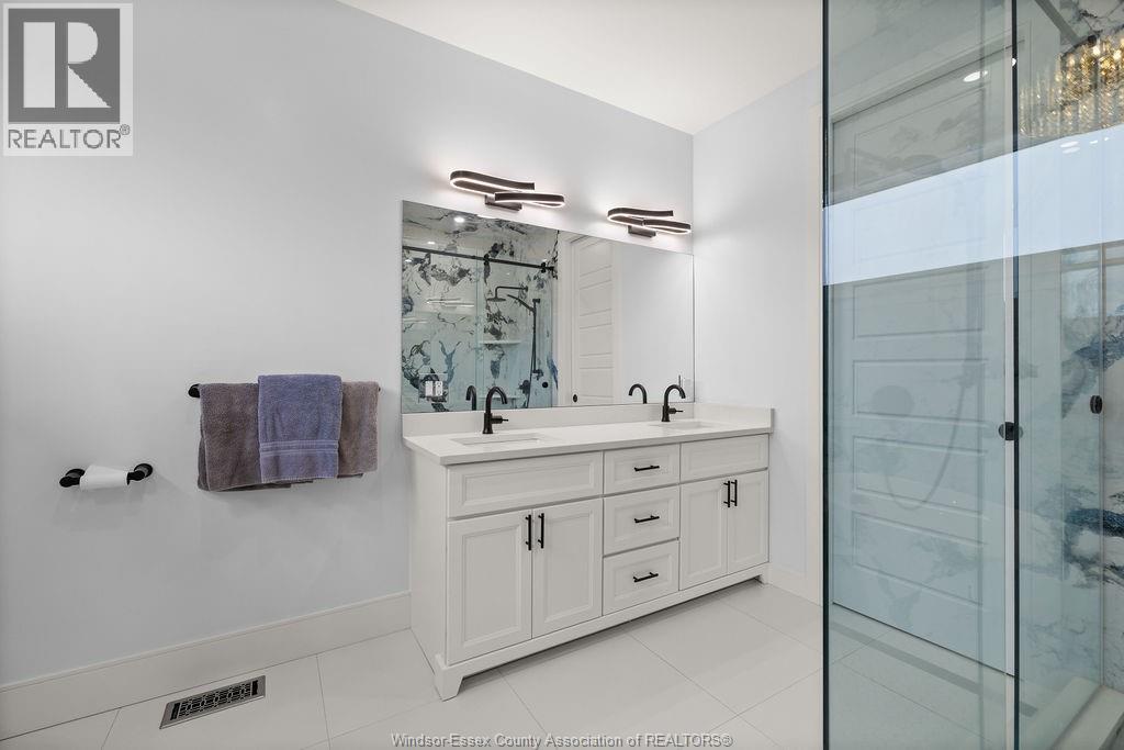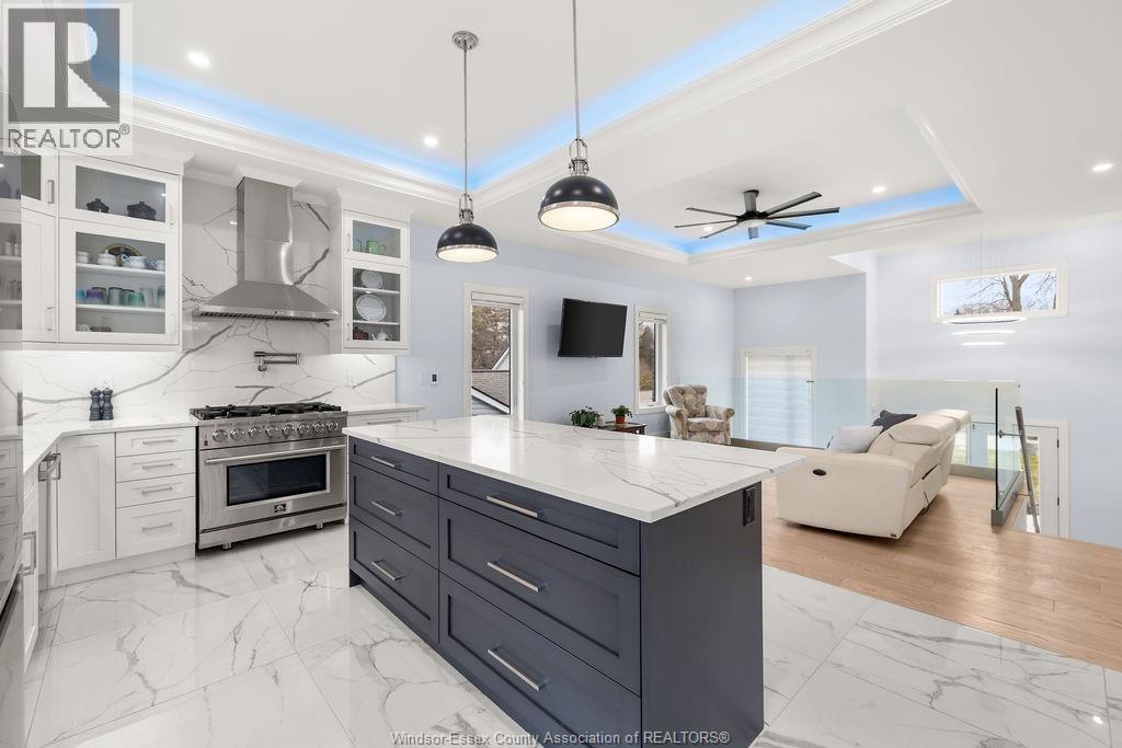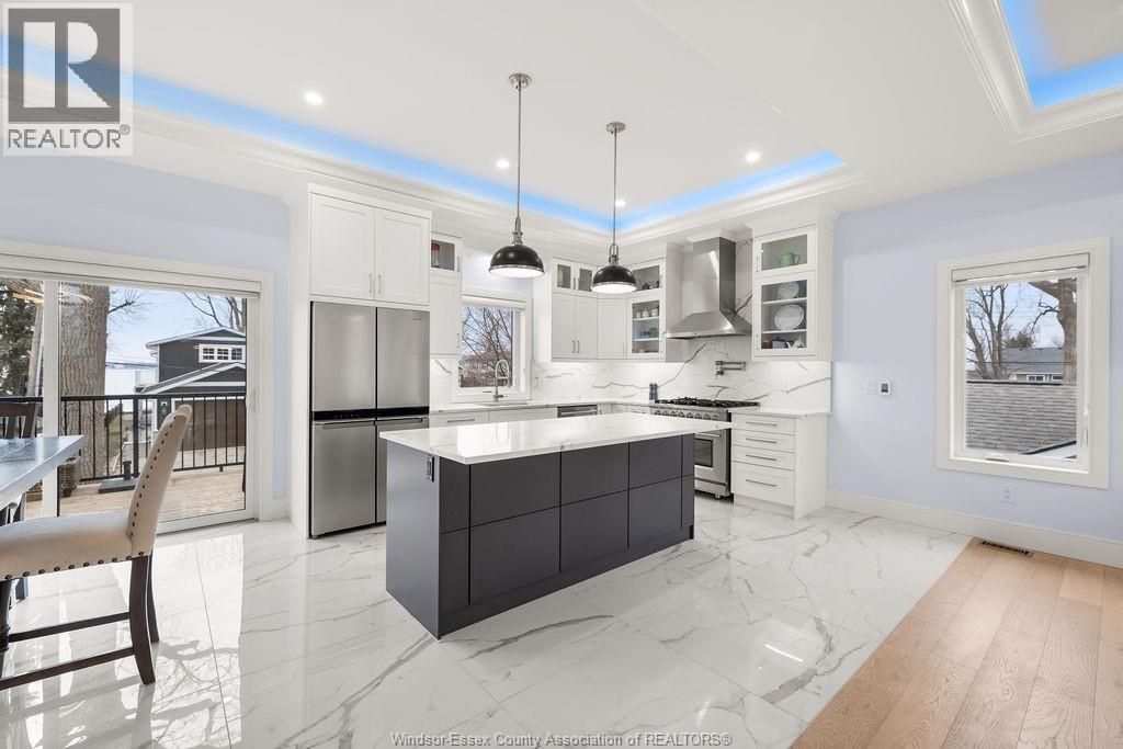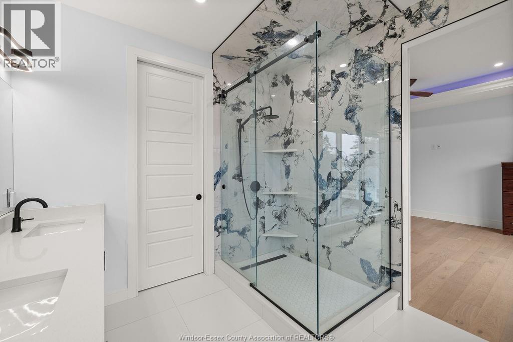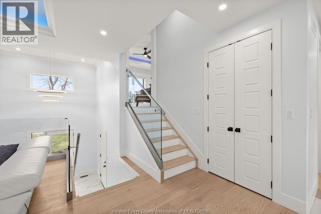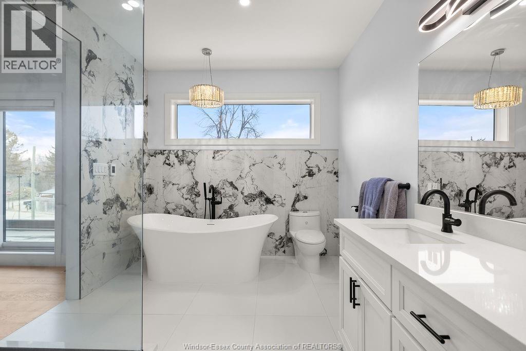 2yr new Cutting Edge, Loaded+ Water Views! Just Absolutely Breath-Taking Styles & Finishes!!! A must see! 10'4"" XX-tall basement ceiling, 9' main flr trayed up to 10' !!! Beautiful XL Quartz kitchen, Hi-End S/Steel Appliances, commercial gas stove, hood fan+ pot filler, b/splash, XXL 30x30 gorgeous flr tile, massive Island, 8' patio dr, uniquely open to living rm with X-Tall raised boxed ceilings, accented indirect lighting & pot lites! Luxurious Ensuite for the XL Private Master Suite, soaker tub, 1pc toilet, 5'x3'custom shower, double sinks, organized walkin closet + balcony walk out with ultra sleek glass rails. Enjoy main flr laundry, front load LG washer/dry + quartz working top. All hardwood thru-out continue into main flr bedrms (1 has walkin) + a sharp main bath with double quartz sink top. Heavy Duty borderless Clear Glass rails thru-out complements the open bright atmosphere. The Excitement continues, wide open Lower with amazing 10'4""ceiling, 4' tall windows, tiled feature wall + 8' linear fireplace, 3rd beautiful full bath, bedrms 4 & 5. Heated Kit & Ensuite floors, power blinds, security cameras , wired for tv's & projector system, Premium Light fixts & ceilng fans, LED's, Premium Plumbing fixts, Glass/tile showers, 8' tall doors, Premium hardware, H/wood Stairs, 200 Amp service +++more! Eye catching exterior, stone brick, landscaped, Full concrete drive with Full Side-Walk to rear patio(wired for Hot Tub-excluded) & deck with Maint-Free Aluminium rails. 23' wide Insulated garage & 9'x8' decora doors + more! Skip the subdivision, take-in this laid back neighbourhood of ""Edgewater ""with cool breezes, gorgeous sunsets with raised views of the water & the U.S. , right above across from houses on the River! Just mins to full amenities in Amherstburg + easy relax drive to Windsor with a properly yr round maintained 4 lane road! All approx. (id:4555)