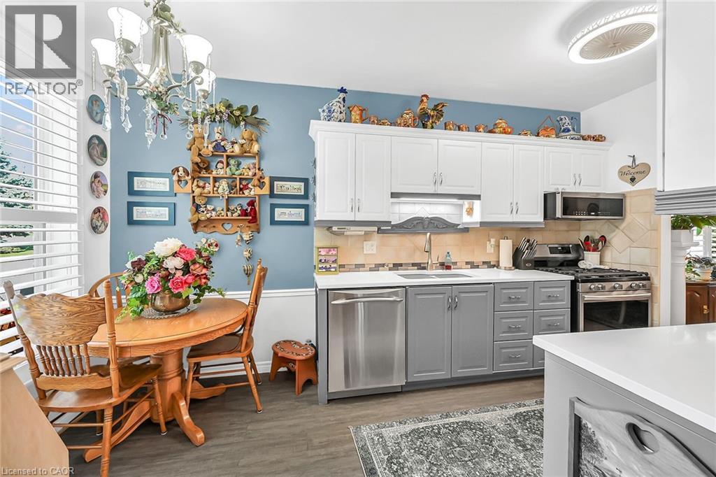 This pristine end-unit bungalow townhome with a fully finished walk-out lower level is located in the desirable Meadowlands community of Ancaster. The property offers about 2,000 sqft of meticulously finished living space across both levels. Recent upgrades total over $50,000. The main floor features 9-ft ceilings, refined crown molding, and an inviting open concept design. There are 3 bedrooms, 2 full bathrooms, and main floor laundry near the bedrooms. The modern kitchen is equipped with upgraded cabinetry, a double sink with garburator, luxury vinyl plank flooring, quartz countertops, premium stainless-steel appliances, and a comfortable breakfast nook. The spacious dining area seats six and transitions seamlessly into the living room with patio doors accessing a balcony. The primary bedroom features ensuite privileges and a walk-in closet. The professionally finished basement includes a generous family room with patio door access to a fenced rear yard featuring vibrant gardens, patio, deck and gazebo, plus there is a gas barbecue hook-up. An additional bonus room provides versatile space for a craft room, workout area, or has potential for a future 2nd kitchen. A 3rd bedroom, home office area, coffee bar, and 3-piece bathroom complete the lower level and offer excellent accommodations for guests. Additional amenities include a private driveway, an attached garage with interior access, and ample visitor parking. Extras include enhanced wood trim, hardwood flooring in the living and dining rooms and hallways, updated carpeting in bedrooms, premium California shutters, a new high-efficiency furnace and water heater, central air, and newly installed shower and bathroom fixtures. The Condo Fee covers road maintenance, lawn care, and snow removal. Situated close to highway access, a golf course, restaurants, and amenities such as Costco and the movie theatre. This home blends comfort, style, and convenience. Ideal for people seeking a low maintenance lifestyle. (id:4555)