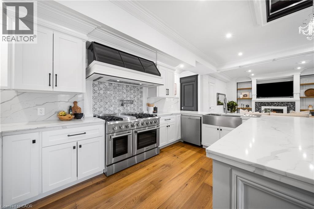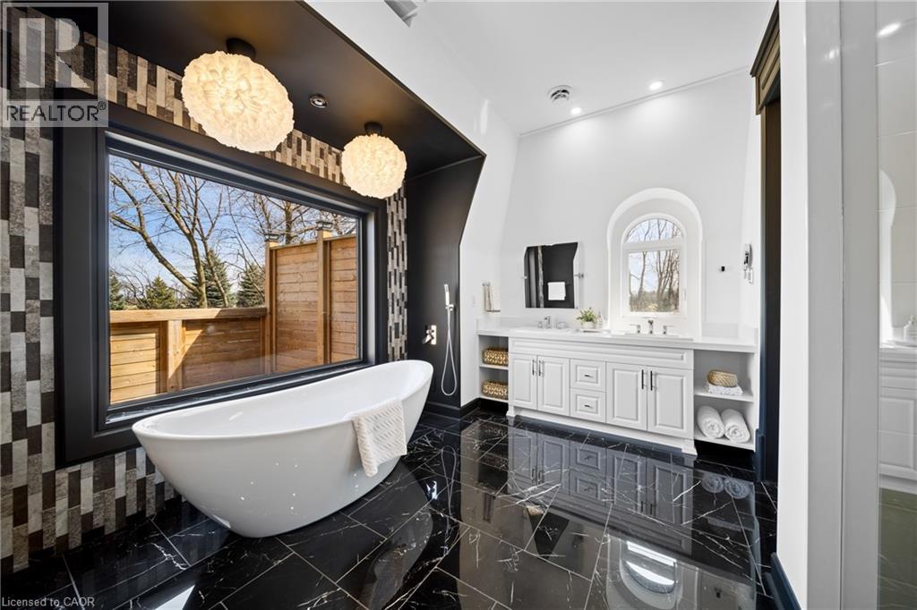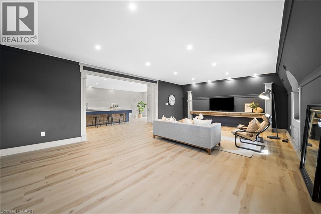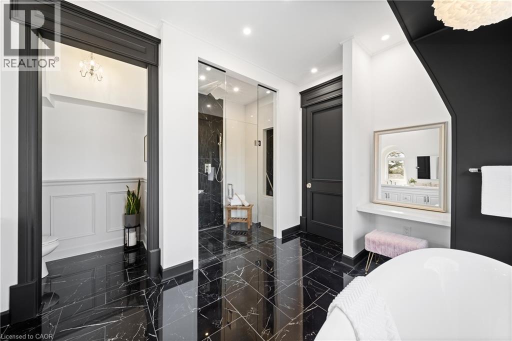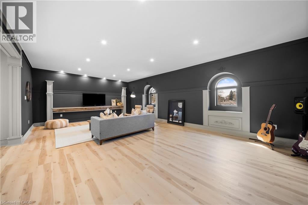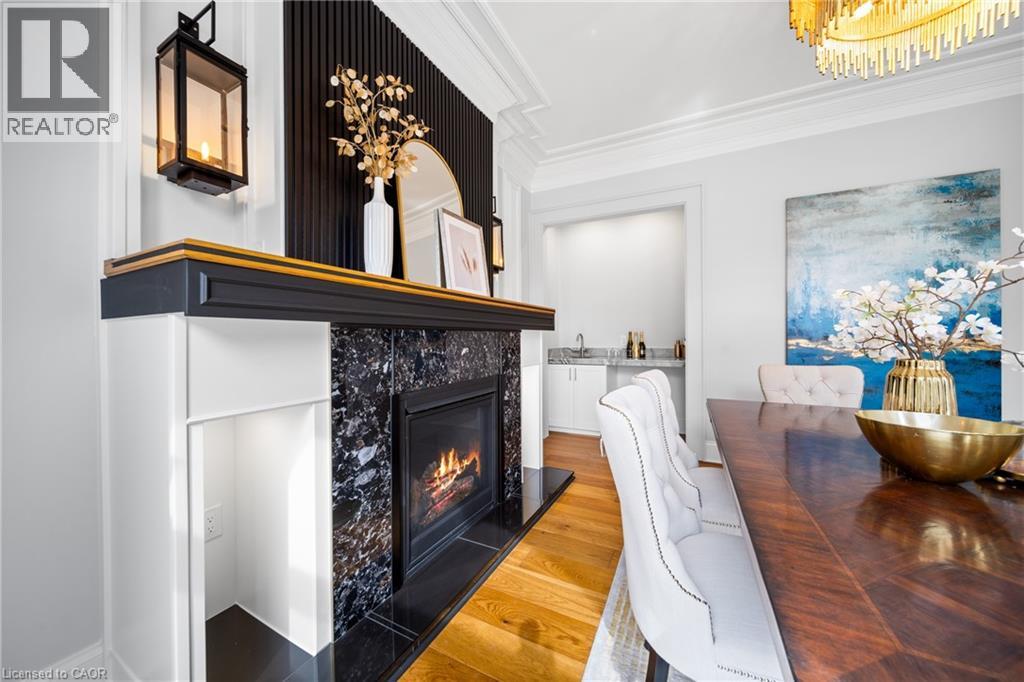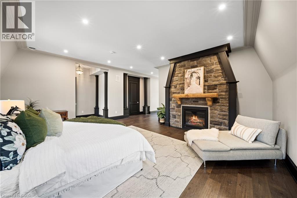 Nestled in scenic Ancaster Village, this French Chateau-inspired residence offers over 7,000 sqft of luxury backing onto the iconic Hamilton Golf Club, with sweeping views of one of Canada’s premier courses. This 3-storey masterpiece features 4 beds, 7 baths, 10.5’ soaring ceilings, custom millwork, and refined European design. The main floor is designed for entertaining, showcasing a gourmet kitchen with high-end appliances, quartz counters, custom cabinetry and a large island. Three sets of double doors open to a covered outdoor dining area. A formal dining room with chandelier, fireplace and wet bar adds elegance, while the family room with built-ins and fireplace connects seamlessly to the landscaped yard. Second level is dedicated to ultimate comfort, 3 spacious bedrooms each with private baths & walk-in closets. Primary suite boasts gorgeous stone fireplace, custom walk-in closet & spa-like ensuite with freestanding tub, rainfall shower, glass shower, and private terrace overlooking the golf course. Third level serves as a secluded refuge with spacious living room, large bedroom, full bath & kitchenette. A walk-out portico terrace offers panoramic views of the golf course. Lower level features 9' ceilings, a recroom, fitness room, family room with another fireplace, full bathroom, heated floors & a kitchenette. A wine cellar completes your chateau experience. The property boasts a cedar-ceiling covered deck, outdoor gas fireplace, mature trees for privacy, 5 fireplaces, 3 dishwashers, Terrazzo concrete driveway & large tandem garage with 4-post car lift for the car enthusiast. Crafted with an ICF foundation and whole-home hydronic in-floor heating across all four levels, the residence delivers year-round comfort, remarkably low operating costs, and a reduced carbon footprint—luxury that’s as smart as it is beautiful. Close to fine dining, shopping, trails, and conservation areas, this property is a rare haven of sophistication, luxury, and timeless elegance. (id:4555)
