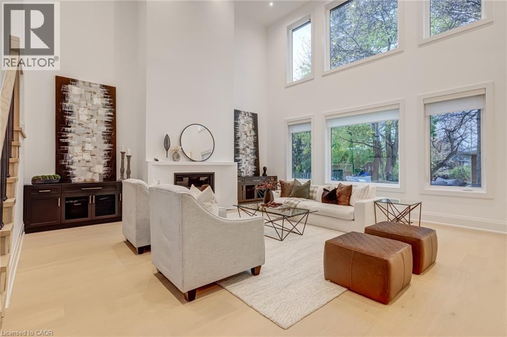 Crafted with exceptional attention to detail and completed in 2025 (Tarion warranty), this custom two-storey luxury home offers nearly 6,000 sqft. of finished living, 5+1 bedrooms, 6 total baths, and a contemporary transitional design blending sophistication with family-friendly functionality. Situated on a 75 x 105 ft lot in Ancaster’s Nakoma neighbourhood, it features striking curb appeal with a stone-and-stucco exterior and a 2.5-car triple tandem garage. Inside, soaring 9 ft ceilings on all three levels, wide-plank white oak hardwood, 8 ft solid core doors, 9 baseboards, and oversized windows create a sense of grandeur. The 19-ft great room showcases floor-to-ceiling windows and a 42 gas fireplace flanked by custom cabinetry. A main-floor office with built-ins, formal dining room, and powder room provide elegant, purposeful spaces, while the dining table converts into a pool table for dual-purpose entertaining. The gourmet kitchen features black cabinetry, a 9' x 5' waterfall quartz island, full-slab quartz backsplash, champagne and honey bronze fixtures, Bertazzoni appliances, and a walk-in pantry and servery with black stainless-steel sink. Adjacent are the mudroom/laundry with garage entry and a main-level bedroom with ensuite. Upstairs, four bedrooms each have ensuite access, including a primary retreat with 10 ft tray ceiling, oversized walk-in closet, linear fireplace, and spa-inspired 5-piece ensuite with heated floors. The finished lower level offers 9 ft ceilings, oversized windows, sixth bedroom, full bathroom, and endless possibilities. Additional features include radon mitigation, 200-amp service, hardwired security system, and DryCore subfloor. Outside, the back patio provides a starting point for a dream outdoor space, with a pre-approved building permit for an in-ground pool and gas lines for BBQ. Centrally located, this home offers walkability to schools, parks, shops, and quick access to Hwy 403. (See full list of features.) (id:4555)
