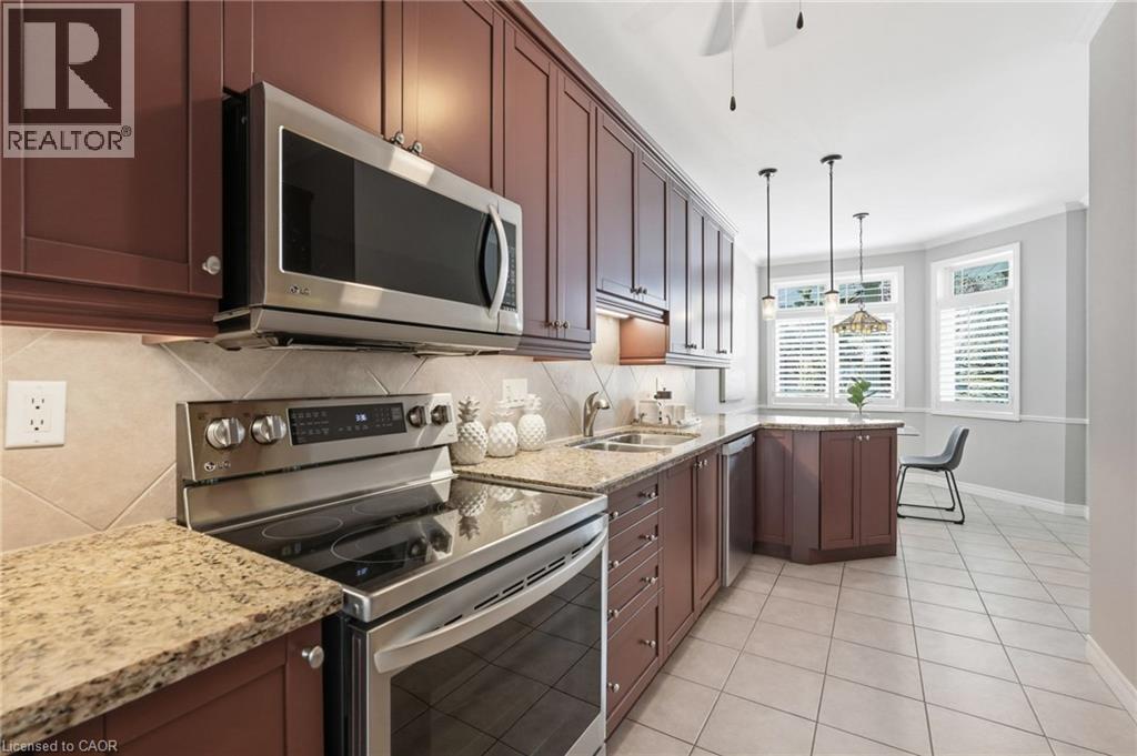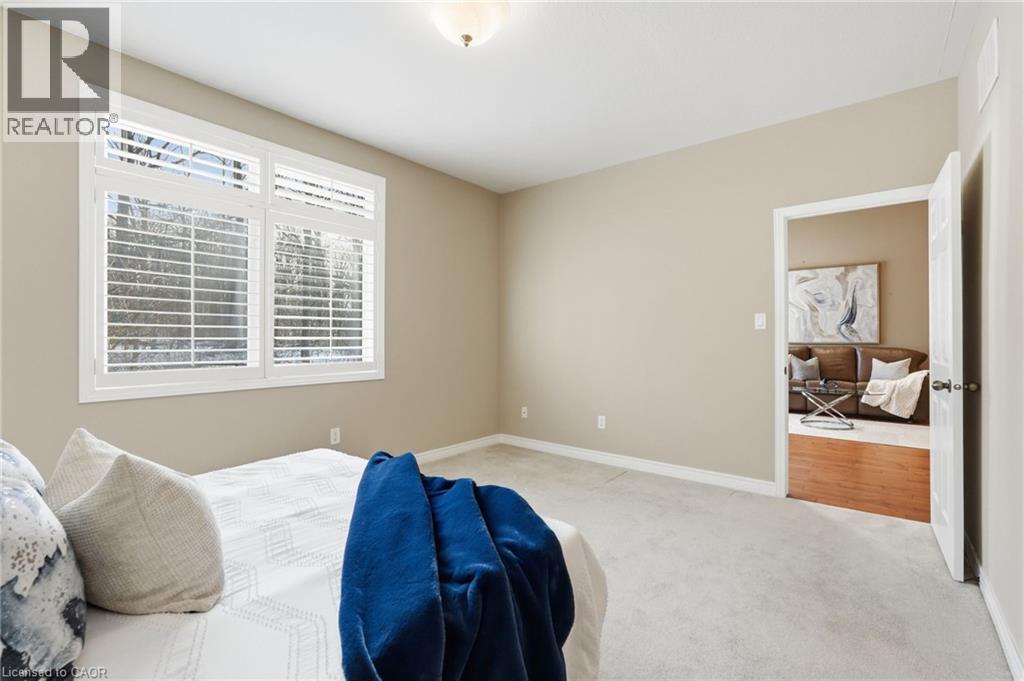 Welcome to this beautifully upgraded 2,733 sq. ft. luxury bungaloft townhouse in the highly sought-after Meadowlands community, ideally located close to shopping, dining, and everyday conveniences. Featuring a desirable primary bedroom on the main floor, this home offers the comfort of main-level living. Tucked away on a quiet road and backing onto a protected rear conservation area that will never be developed, it provides exceptional privacy and a true low-maintenance lifestyle within a well-managed complex known for strong capital planning and consistent upgrades. Featuring a rare 2-car garage and soaring 18-ft cathedral ceilings, the bright great room is anchored by a cozy gas fireplace and filled with natural light. Quality hardwood floors, California shutters, and pot lights enhance the main living areas. The modern kitchen with matching appliances and granite countertops overlooks the impressive great rom, with garden doors leading to a two-tiered deck, patio stone landscaping, and fenced yard. The family room offers a walk-out to the backyard for seamless indoor-outdoor living. The primary bedroom is conveniently located on the main floor, facing the ravine for added tranquility, and includes a walk-in closet and 5-piece ensuite, plus main-floor laundry. Upstairs features a loft, additional bedroom with shared ensuite, and a family room that can easily convert to a third bedroom. The professionally finished lower level includes a games room, rec room, bar area, 3-piece bath, and hobby room—ideal for guests. Recent upgrades include a new asphalt and concrete driveway (2025), $75,000 in patio stone landscaping, roof replacement (2023), approved window and door replacements (2027), and A/C and water heater renewed in 2024 with warranty. (id:4555)