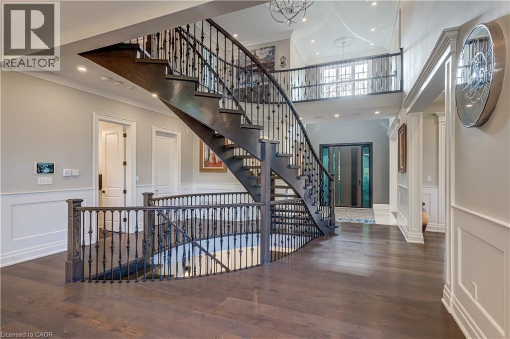 This architectural masterpiece offers 7,000 sq. ft. of luxurious living space with 4+2 bedrooms, 6 bathrooms, an incredible resort-style backyard oasis, and a fully finished basement with separate entrance. Set on an 85 x 135 ft. lot in a mature Ancaster neighbourhood, just one minute to highway access and all Power Centre amenities, this dream home impresses with striking curb appeal, professional landscaping, and an oversized triple garage with 14 ft. ceilings and two car lifts. The grand foyer with a soaring 21 ft. ceiling and curved staircase opens to a sophisticated interior featuring bold millwork, expansive porcelain, and wide-plank hardwood all illuminated by massive windows allowing plenty of natural light. The main level boasts formal living and dining rooms with 12 ft. ceilings, a private office, powder room, mudroom, and a gourmet eat-in kitchen with top-tier appliances. A 4-season sunroom with radiant in-floor heating and a family room with 11 ft. ceiling and stone fireplace create the perfect entertaining spaces. Upstairs, the sensational primary suite includes custom built-ins, spa-inspired 5-piece bath, private balcony, walk-in closet, and a custom dressing room fit for any wardrobe. Three additional bedrooms, all with ensuite baths (heated floors), and bedroom level laundry complete the upper level. The finished lower level offers a recreation area, home theatre, 2 bedrooms, full bath, second laundry, and kitchenette—ideal for family enjoyment or a multigenerational in-law suite. Step outside to a private resort-style retreat with heated saltwater pool (waterfalls, lights, fire features), sunken hot tub, outdoor kitchen with pizza oven, extensive hardscaping, artificial turf, storage shed, and an elite K-Array sound system. Upgrades include Control4 automation, integrated security with cameras, whole-home sound, and dual furnaces, A/Cs, and HRVs for comfort and efficiency. A rare opportunity to own one of Ancaster’s most extraordinary residences! (id:4555)