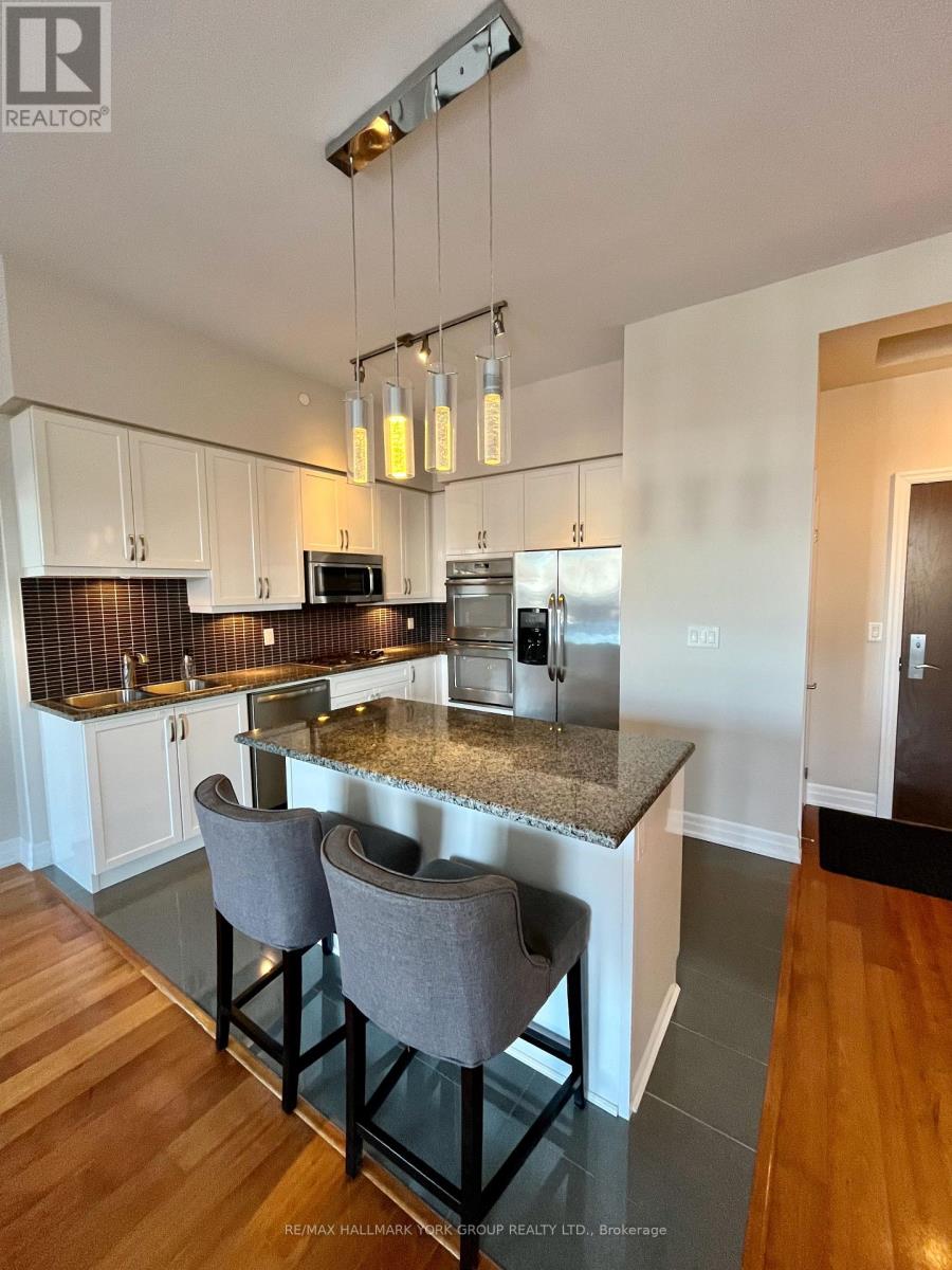 Spacious and stylish 2+1 bedroom, 2 bath unit offering 1,032 sqft of thoughtfully designed open-concept living. Featuring 10ft ceilings, hardwood flooring throughout, and a bright Western exposure opening up to a 357 sqft private balcony. The chef's kitchen is equipped with stainless steel appliances and seamlessly flows into the living and dining areas. Versatile den can be used for dining or your home office. Located in an upscale, amenity loaded building with an outdoor pool, gym, party room and concierge/security. A short walk to your choice of grocery stores, gyms, Aurora Senior Centre, walking trails and the Aurora Arboretum. (id:4555)