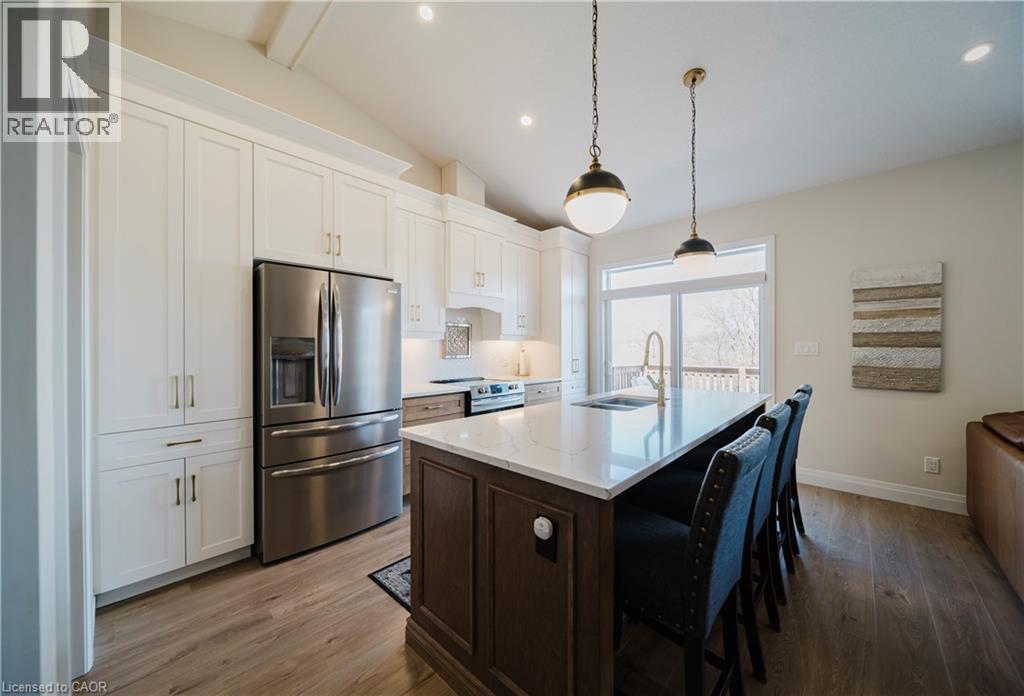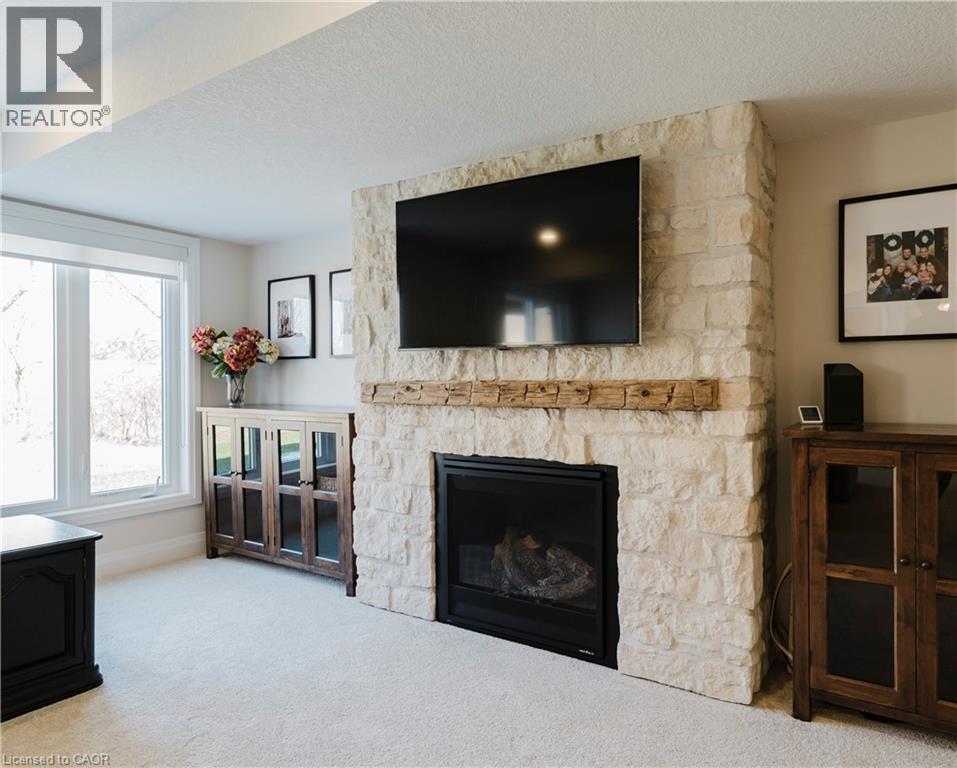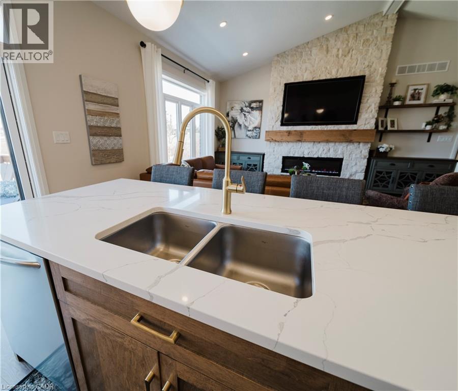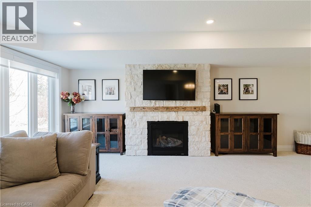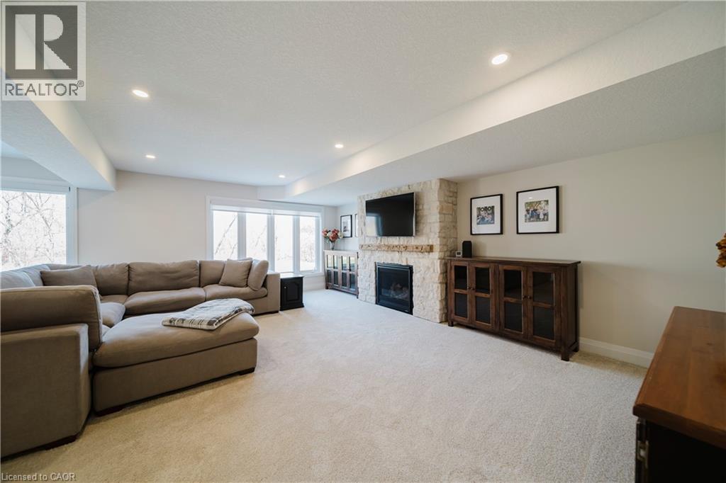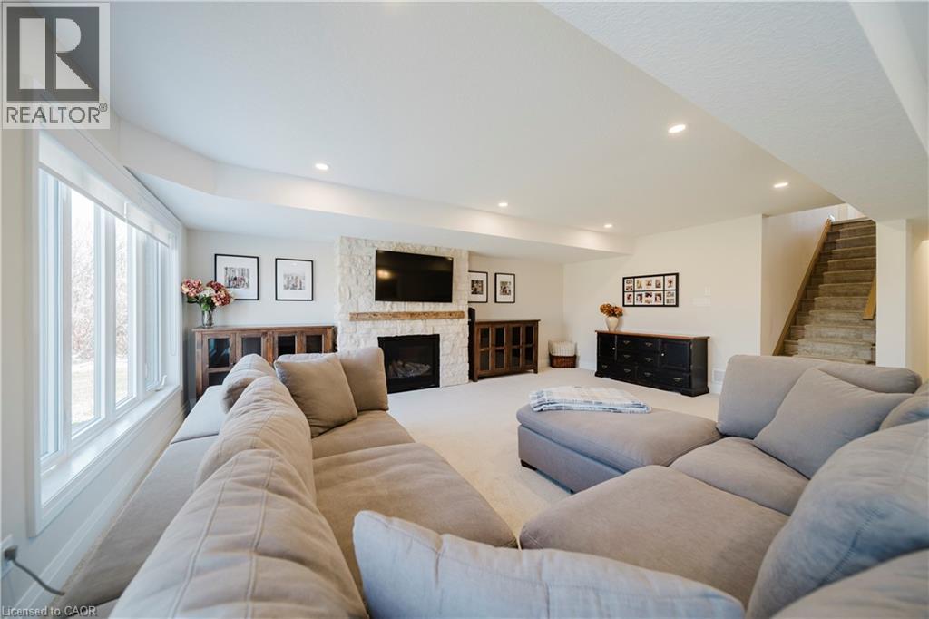 Welcome to Timberlane—an exclusive Baden community—where this exceptional end-unit bungalow townhome stands out with designer-inspired finishes and a premium greenspace setting that offers added privacy. The main level showcases a modern open-concept layout, anchored by a stunning custom stone fireplace that creates a warm and inviting focal point. Oversized windows flood the space with natural light, while the thoughtfully designed floorplan includes two spacious bedrooms and two bathrooms. At the heart of the home is the beautifully finished kitchen, featuring elevated finishes and designed with both style and functionality in mind—perfect for hosting. Convenient main floor laundry completes this level. The bright lower level offers oversized windows and a walkout to the private backyard, creating a seamless extension of the living space. Here, you’ll find a large bedroom with a cheater ensuite, a generous rec room with a second custom stone fireplace, and an oversized storage room ideal for hobbyists or additional organization. Step outside to enjoy a private deck overlooking serene greenspace—an ideal setting to relax or entertain. Additional highlights include a double car garage, parking for two more vehicles, and convenient access to nearby visitor parking. Perfectly located just 10 minutes from Kitchener-Waterloo, this home offers the best of both worlds—peaceful community living with easy access to city amenities. With tennis courts across the street, a nearby recreation centre, and scenic trails to enjoy, it’s an ideal setting for an active lifestyle. A beautifully finished home in one of Baden’s most sought-after communities. (id:4555)