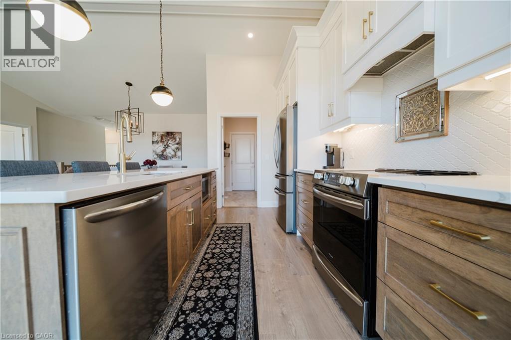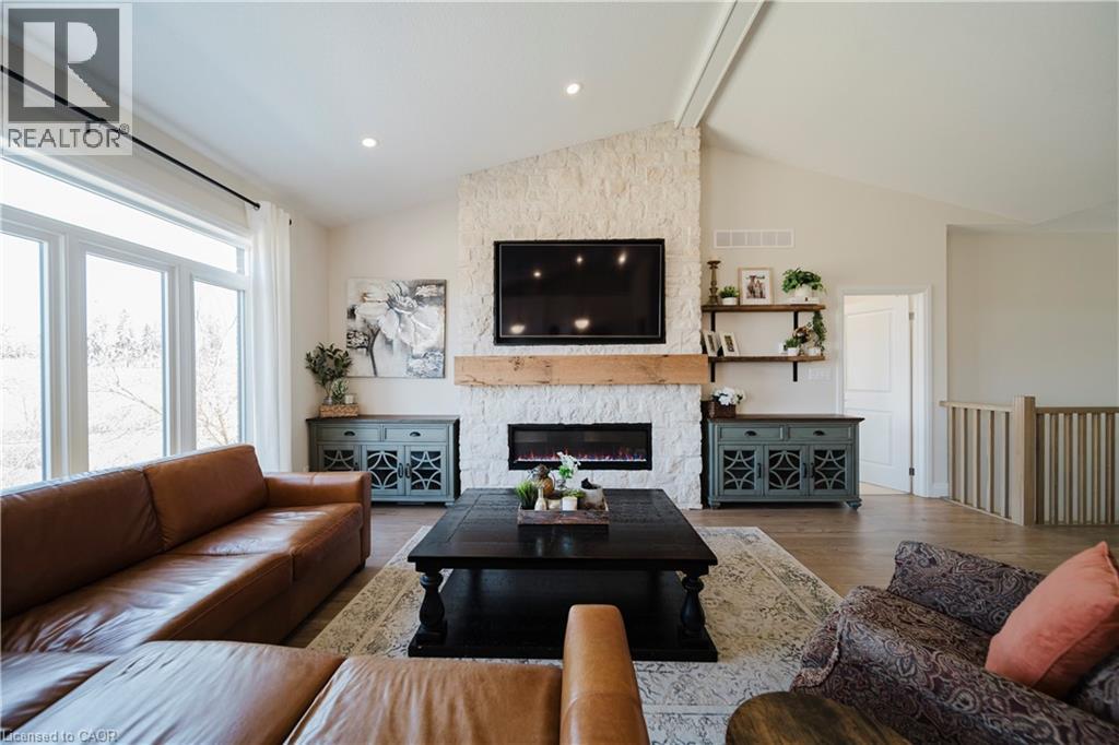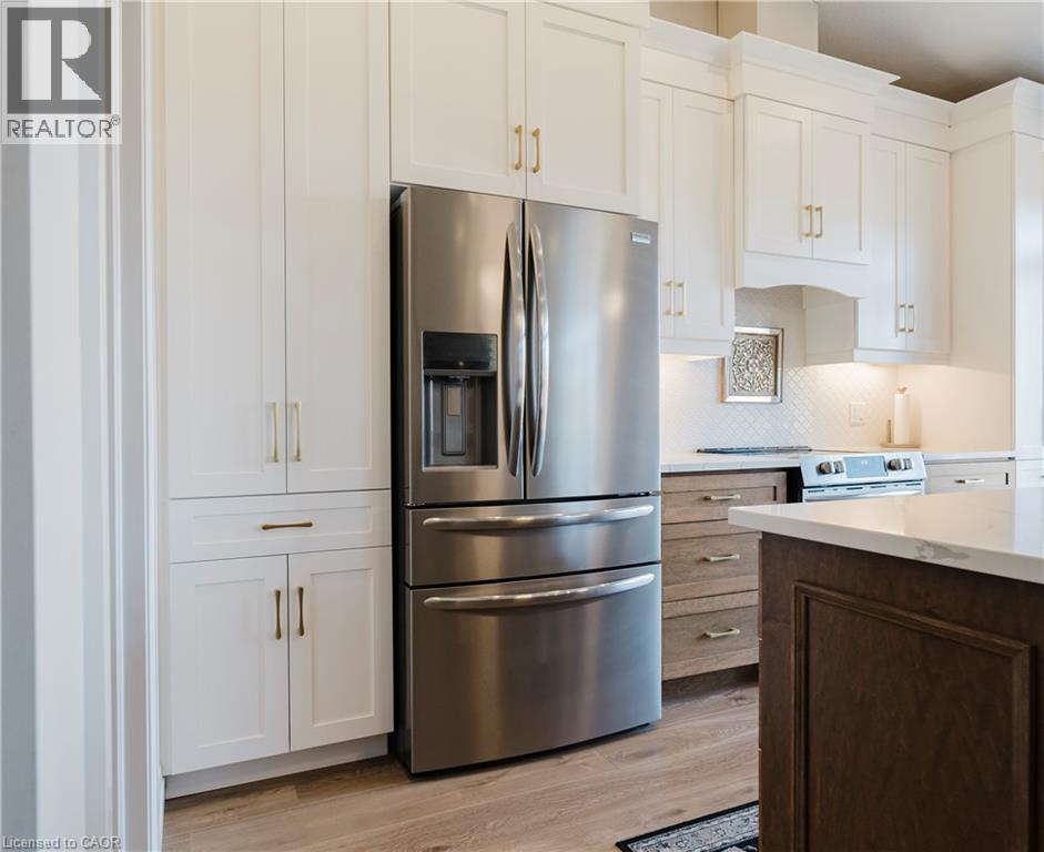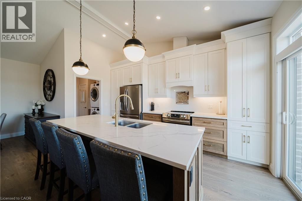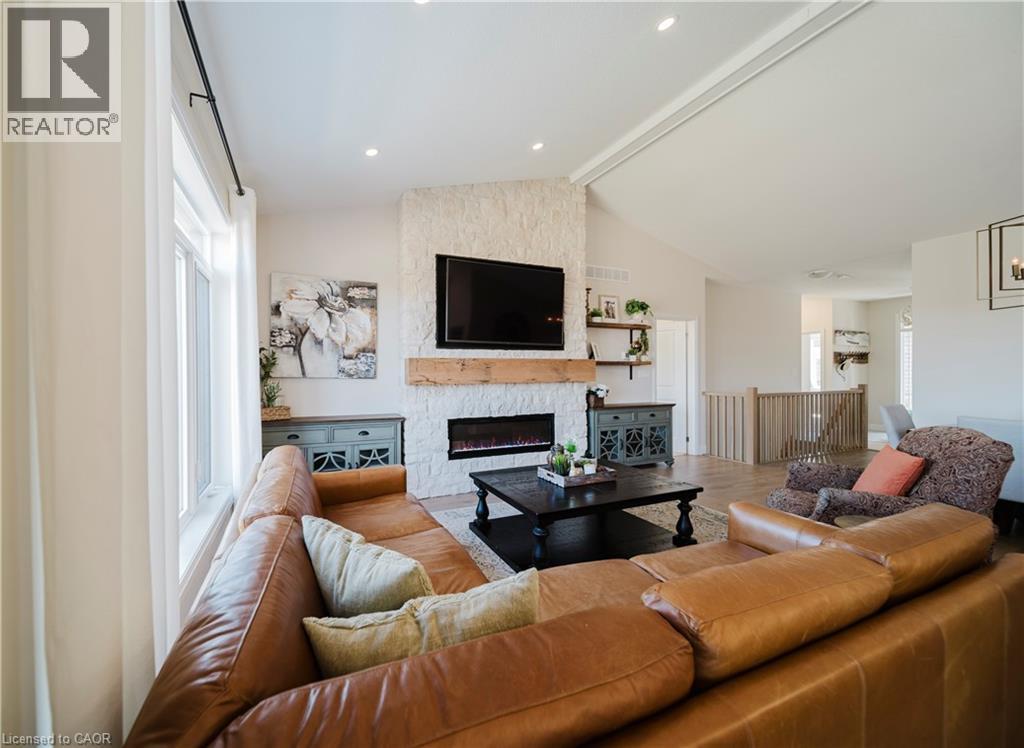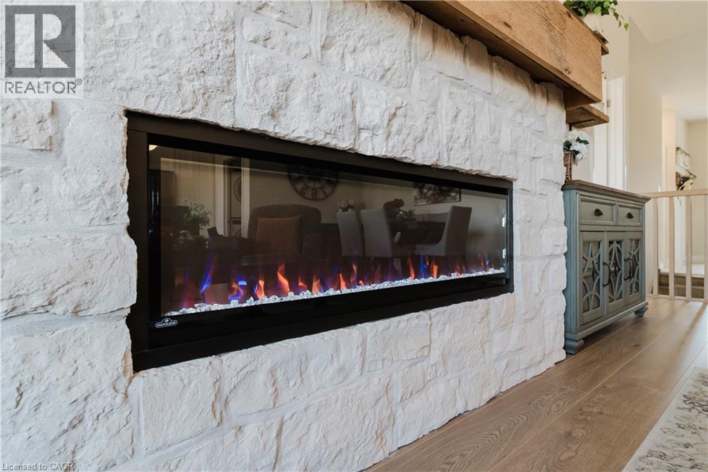 Welcome to Timberlane—an exclusive Baden community—where this exceptional end-unit bungalow townhome stands out with designer-inspired finishes and a premium greenspace setting that offers added privacy. The main level showcases a modern open-concept layout, anchored by a stunning custom stone fireplace that creates a warm and inviting focal point. Oversized windows flood the space with natural light, while the thoughtfully designed floorplan includes two spacious bedrooms and two bathrooms. At the heart of the home is the beautifully finished kitchen, featuring elevated finishes and designed with both style and functionality in mind—perfect for hosting. Convenient main floor laundry completes this level. The bright lower level offers oversized windows and a walkout to the private backyard, creating a seamless extension of the living space. Here, you’ll find a large bedroom with a cheater ensuite, a generous rec room with a second custom stone fireplace, and an oversized storage room ideal for hobbyists or additional organization. Step outside to enjoy a private deck overlooking serene greenspace—an ideal setting to relax or entertain. Additional highlights include a double car garage, parking for two more vehicles, and convenient access to nearby visitor parking. Perfectly located just 10 minutes from Kitchener-Waterloo, this home offers the best of both worlds—peaceful community living with easy access to city amenities. With tennis courts across the street, a nearby recreation centre, and scenic trails to enjoy, it’s an ideal setting for an active lifestyle. A beautifully finished home in one of Baden’s most sought-after communities. (id:4555)