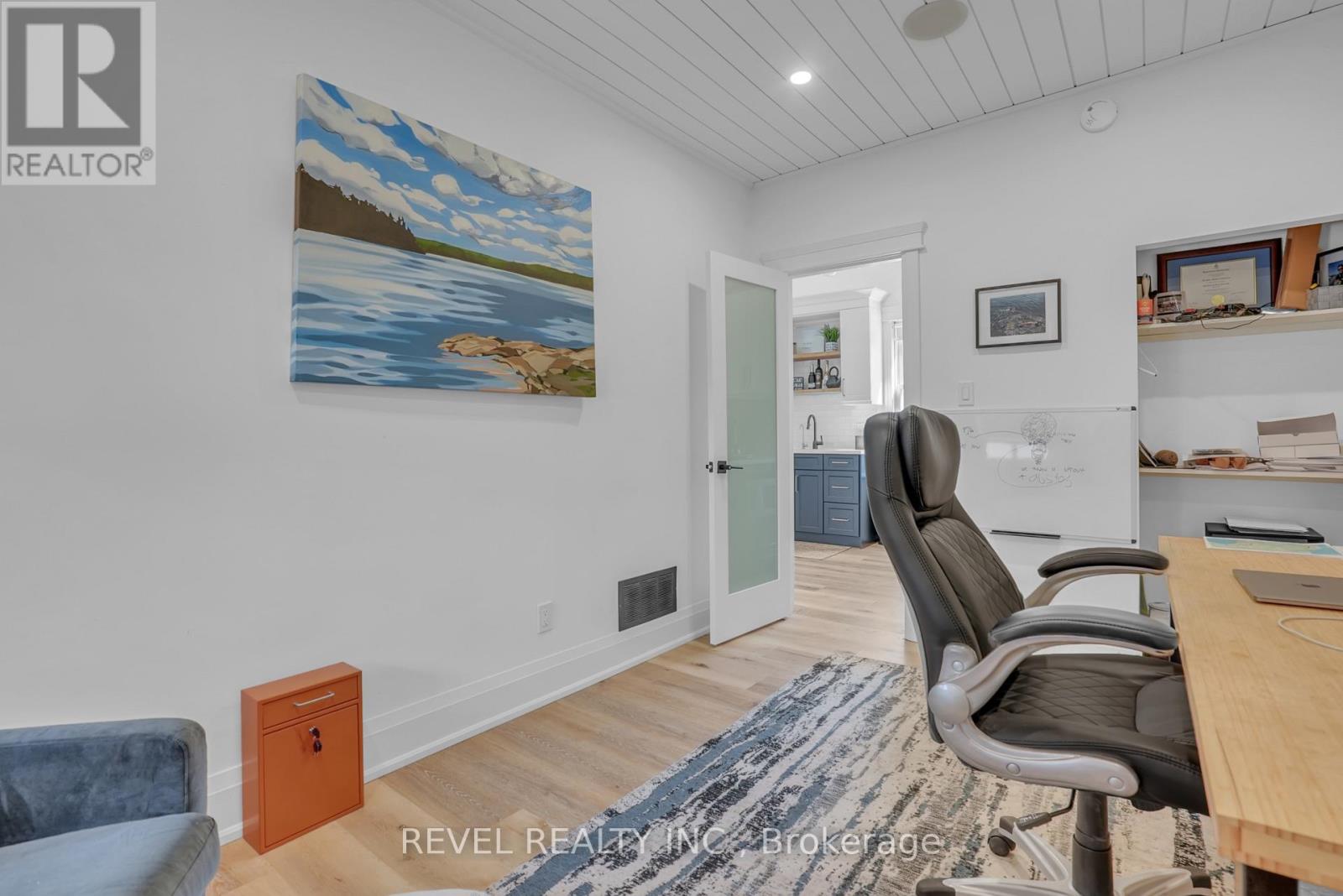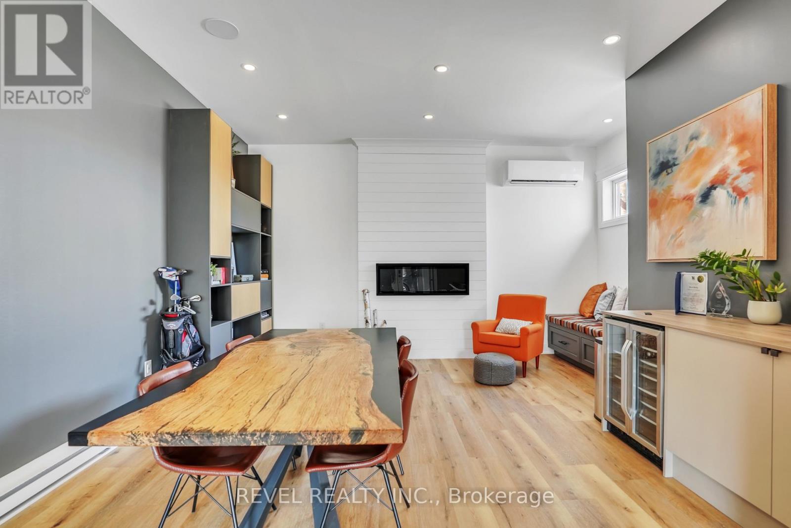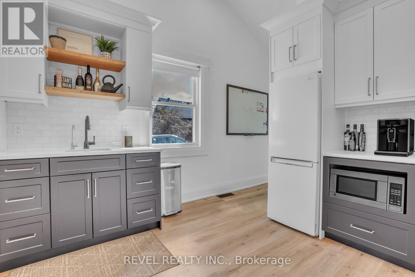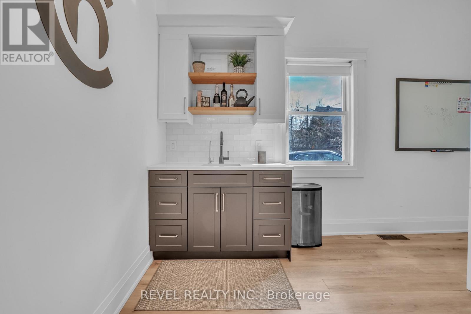 Exceptional Commercial Space | Designed to Impress, Situated to Succeed. Welcome to a beautifully appointed commercial property that blends functionality with sophisticated design, located in a highly sought-after location that ensures maximum visibility & convenience. Located just steps away from Barrie's waterfront, the flexible C4 zoning allows for several potential uses including: Office, Retail, Service, Veterinary, etc. From the moment you arrive, the professionally landscaped grounds, complete with elegant hardscaping & vibrant plantings, set the tone for this standout space. The attractive front signage offers excellent curb appeal & can be easily customized to reflect your brands identity. Step inside through the new front & side entrances (2021) and youre greeted by a stunning large conference room and welcoming seating area, anchored by a modern electric fireplace and a sleek dry bar/coffee stationthe perfect environment to host clients and team meetings. The main level also features two private offices, a well-equipped kitchen area, 1.5 tastefully updated bathrooms, and a secondary meeting area and waiting room, all adorned with durable laminate flooring and tile in the bathroomsa seamless blend of style and practicality. Upstairs, discover an airy, open-concept workspace designed to inspire productivity, complete with another private office featuring four custom-built workstations. Every detail speaks to quality, from the upgraded light fixtures and tilework to the integrated stereo system and wiring for a full security setup. With 10 private parking spaces across two driveways, this property offers rare convenience for both staff and clients. Nearly all windows were replaced in 2021, maximizing natural light and energy efficiency. Whether youre establishing a new business or relocating to a more refined space, this property offers an unbeatable combination of design-forward interiors and a premium locationtruly a place where business can thrive. (id:4555)