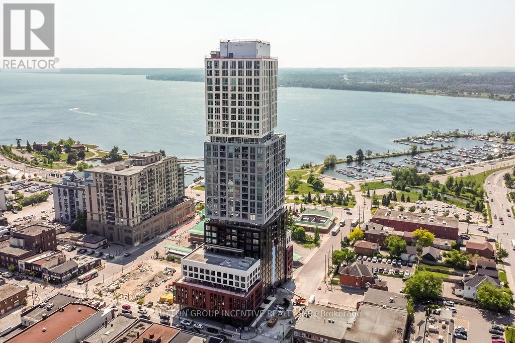 Best price in building for Size!!! Need a Mortgage? Seller would consider a VTB!! Debut Condos where luxury waterfront living meets an urban lifestyle! Upscale lakeside living in this brand-new, never-lived-in 1-bedroom plus den (could be used as 2nd Bedroom), 2-bathroom corner suite perfectly situated in the heart of downtown Barrie. Modern design, 9-ft ceilings, smooth ceilings, floor-to-ceiling windows, and wide-plank laminate flooring. The gourmet kitchen features custom cabinetry, integrated appliances, a movable island, and solid surface countertops. Enjoy two elegant bathrooms with contemporary vanities, frameless glass showers, and porcelain tile flooring. North & West Views breathtaking city views, with natural light streaming through oversized windows that wrap around the entire suite. Blinds installed on all windows. The generously sized den provides exceptional flexibility - ideal as a second bedroom, home office, or inviting guest space. Step outside your door and enjoy Barrie's vibrant waterfront, trendy restaurants, and exciting nightlife along Dunlop Street, with the Central Bus Terminal conveniently located right next to the building. This suite includes one owned underground parking space. Residents will enjoy premium amenities, including a state-of-the-art fitness center, expansive recreational terrace with a BBQ area, and a spectacular 360 outdoor heated pool overlooking Kempenfelt Bay offering the ultimate Nordic spa-like experience. Don't miss your chance to own this remarkable lakeside retreat in Barrie's newest and much anticipated high-rise condo by the lake. Including built-in refrigerator, built-in dishwasher, built-in oven, stove top, microwave, stacked laundry washer & dryer. 3 First pictures Inside are virtually rendered to show furniture. (id:4555)