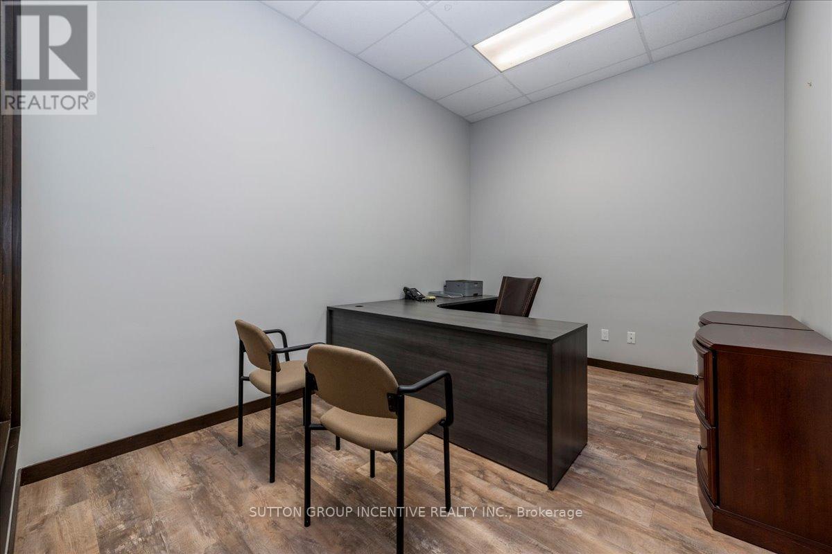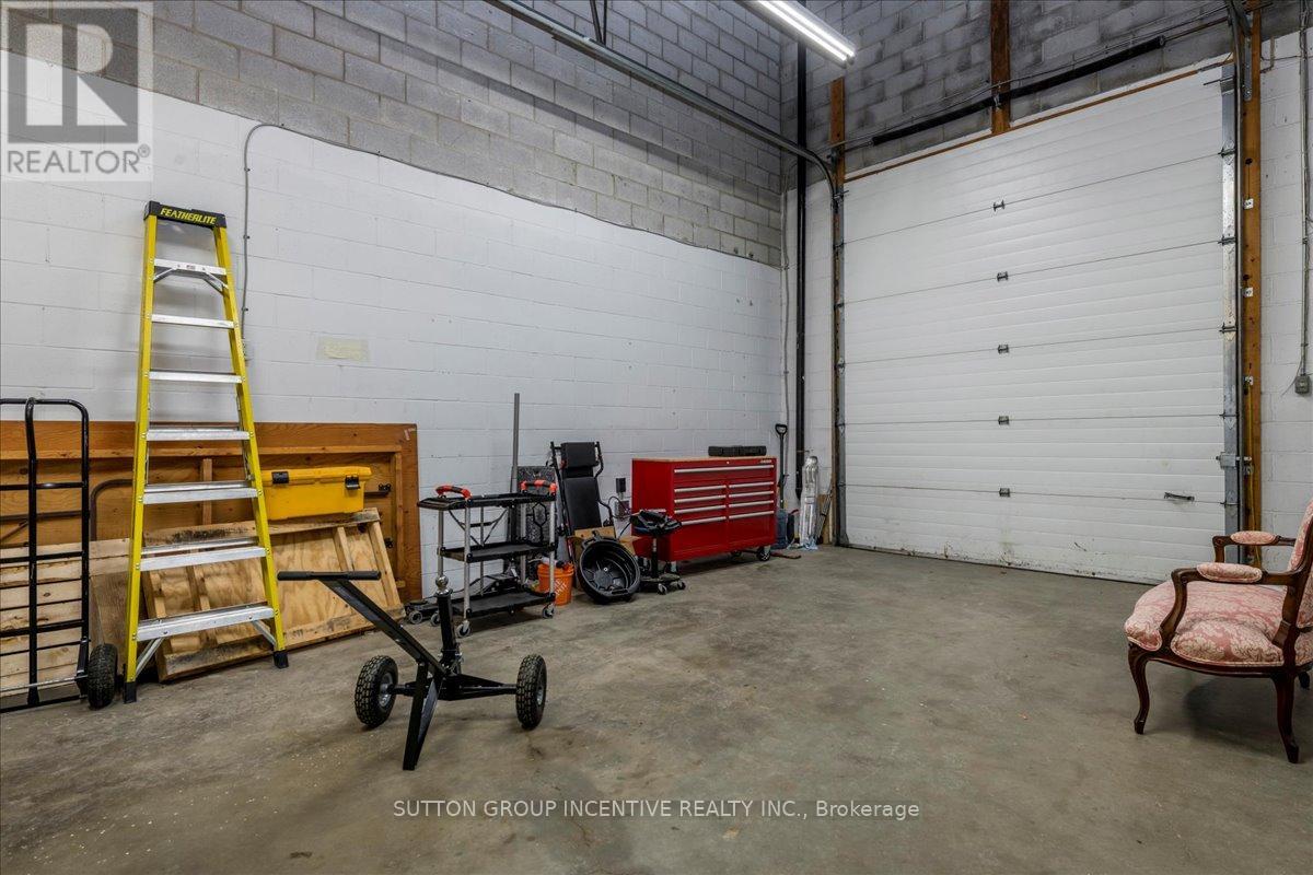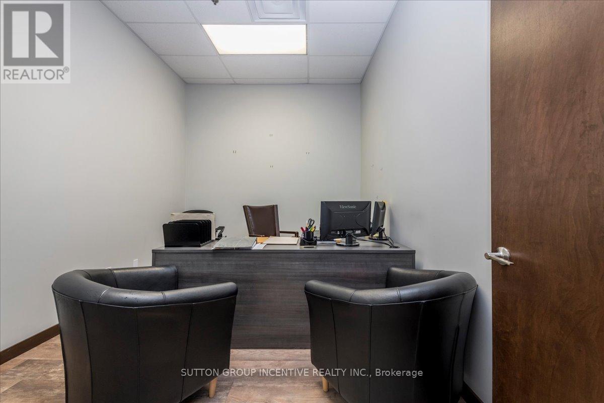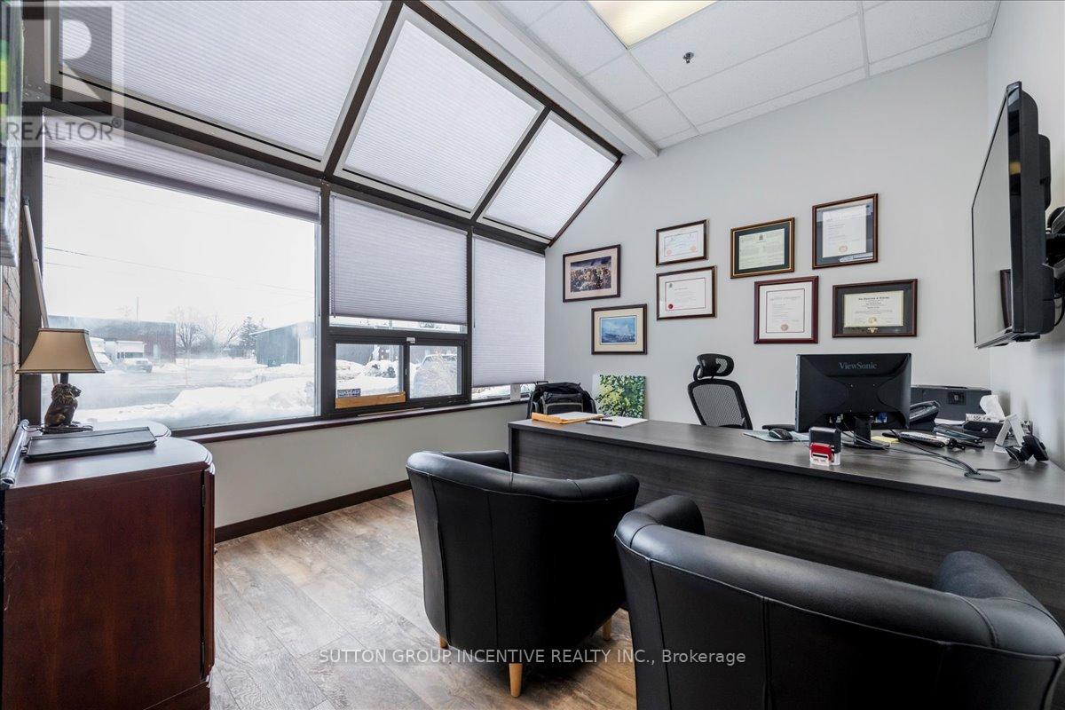 Stop paying someone else's mortgage -- own your workspace in the heart of Barrie, just minutes from downtown and Hwy 400. This professionally finished office spans two commercial condo units and was fully renovated in 2019. The front office area features a welcoming reception, waiting area, bright boardroom with custom glass doors, staff/lunch room, four private offices, open work area, and two washrooms -- ideal for a wide range of professional users. At the rear, utilize an approximate 740 SF of warehouse space with a 19' clear height and a 10' x 12' roll-up door, plus an additional 182 SF mezzanine for extra storage. Comfort and efficiency are covered with ductless heat pumps in the front offices for added cooling (2020), updated central air (2020), and a new forced-air natural gas furnace (2023).Included are a built-in custom desk and hutch in the angled office, custom blinds throughout, fridge, dishwasher, microwave, HWT (owned) and boardroom table. Additional furnishings (including copier) may be available, subject to negotiation. Flexible possession. Monthly condo fees of $775.93 include water/sewer, snow removal, landscaping, insurance, management, non-exclusive parking, and building envelope maintenance. (id:4555)
