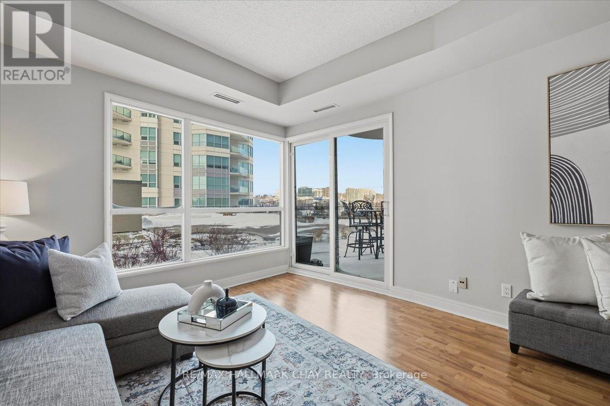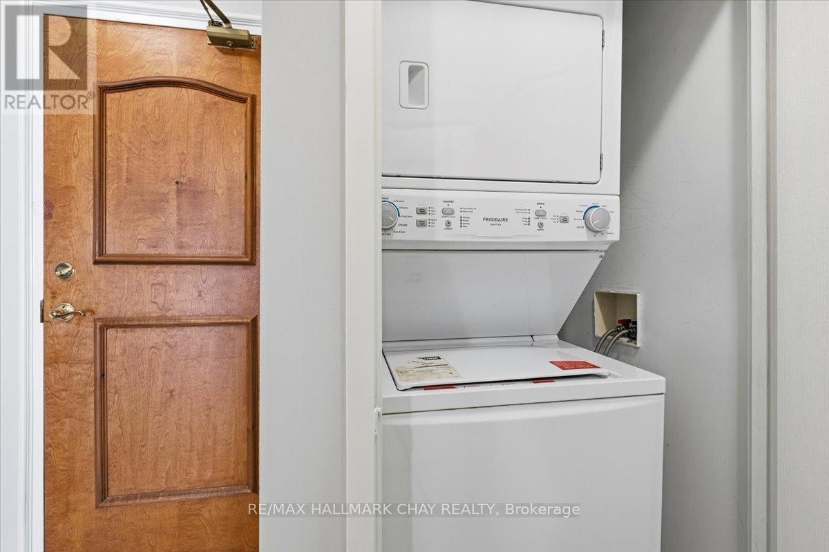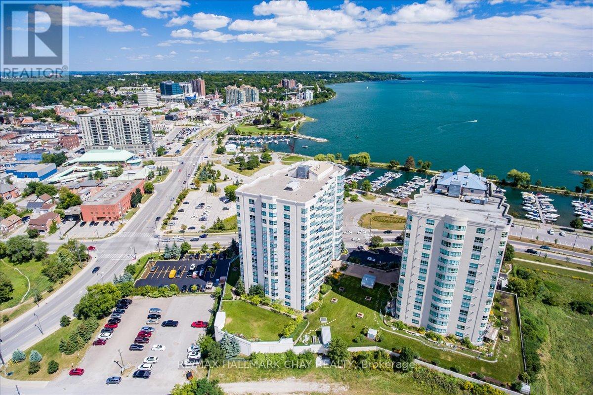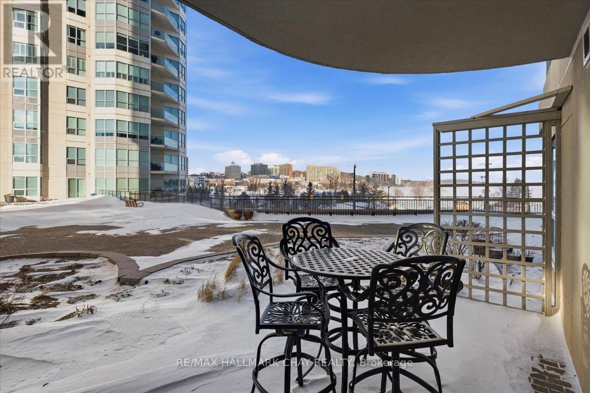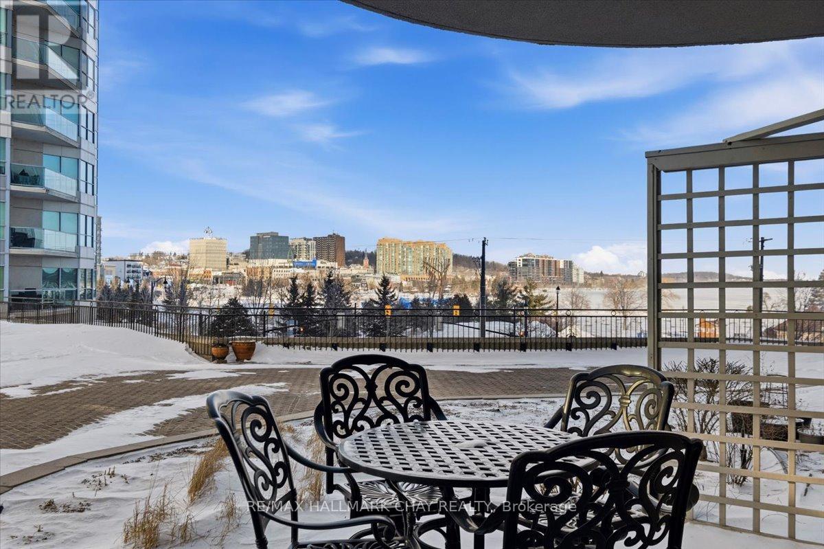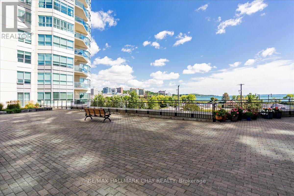 Welcome to the beautiful Grand Harbour. Wonderful 1 bedroom, 2 bath 836 sq foot suite. Located along Barrie's waterfront overlooking Kempenfelt Bay. Rare terrace level garden suite, forward facing terrace providing spectacular lake views and spacious patio trimmed with gardens and community benches perfect to enjoy the view and extend your outdoor entertaining area. Spacious Windward model provides a functional living space, only a few of these models are available in the building. Neutral decor throughout, 9' ceilings, carpet free, ready for you to customize this space and make it your own. Open kitchen, stainless appliances, breakfast bar, ample workspace and abundance of cabinets for storage. Breakfast bar overlooks living and dining room. Bright open space with sliding doors and large windows. Large primary bedroom with walk in closet and private ensuite bath with tub and separate walk-in shower. Convenient in-suite laundry and double front hall closet complete the foyer. Amazing friendly condo community offering fantastic amenities including an indoor pool, hot tub and sauna, party room, games room, library, gym/exercise room, guest suites, visitor parking and more! Pet friendly building, underground parking, exclusive locker, it is perfect for a retired couple, or young professionals. Take a leisurely stroll along the boardwalk, enjoy the beach, go for a bike ride along the waterfront paths. Enjoy all that Barrie has to offer, shopping, restaurants, entertainment, festivals and more. Short drive to local golf courses, skiing, Hwy 400 or go north to cottage country. Easy access to public transit, GO train service. Fantastic opportunity you don't want to miss. (id:4555)