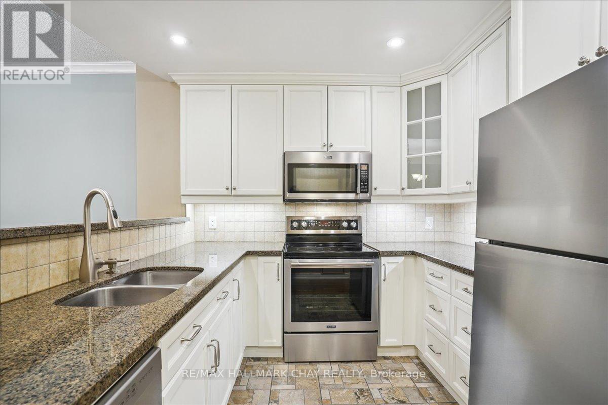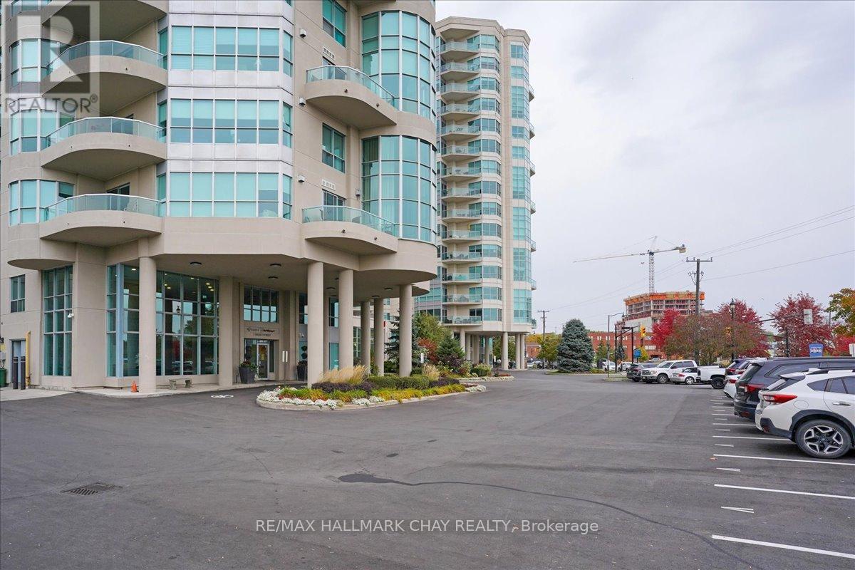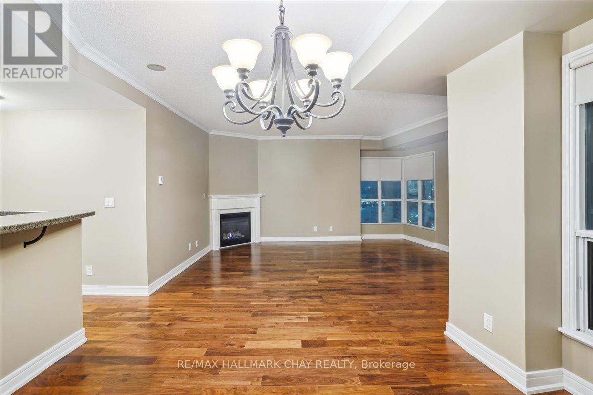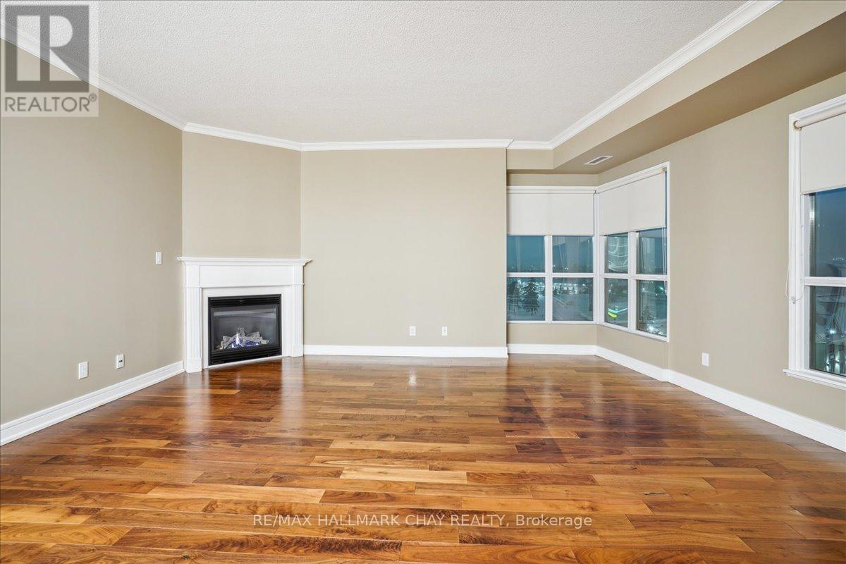 Wake up every day to breathtaking views of Kempenfelt Bay in this beautifully bright and spacious 2-bedroom, 2-bath suite at the highly sought-after Grand Harbour. Offering approximately 1,340 sq ft of thoughtfully designed living space, this home delivers comfort, style, and an unbeatable waterfront setting.The expansive living room features a cozy gas fireplace, walls of windows, and a walk-out to a balcony where you can soak in panoramic views of the bay, and city skyline. A separate dining room makes entertaining effortless and flows seamlessly into the kitchen, complete with raised granite counters, full-height white cabinetry, stainless steel appliances, under-mount double sink, modern backsplash, pot lighting, and a breakfast bar overlooking the dining area.The primary bedroom is a true retreat with space for a king-size bed, large windows, a walk-in closet, and a private 4-piece ensuite with a separate glass shower. The second bedroom is ideal for guests, a home office, or den and is conveniently located across from the main 4-piece bath.Hardwood floors, tile in the kitchen and baths, crown molding, 9-foot ceilings, roller blinds, and a neutral colour palette add to the home's polished feel. In-suite laundry with stacked washer and dryer, recently updated toilets in both bathrooms, one indoor parking space, and a locker complete the package.Grand Harbour is a well-managed, amenity-rich building offering an indoor pool, gym, sauna, hot tub, party room, games room, guest suites, and an active social community. Walk to the GO Station, stroll to the beach, and enjoy waterfront living at its finest. Rare opportunity to become a part of such a wonderful building. (id:4555)