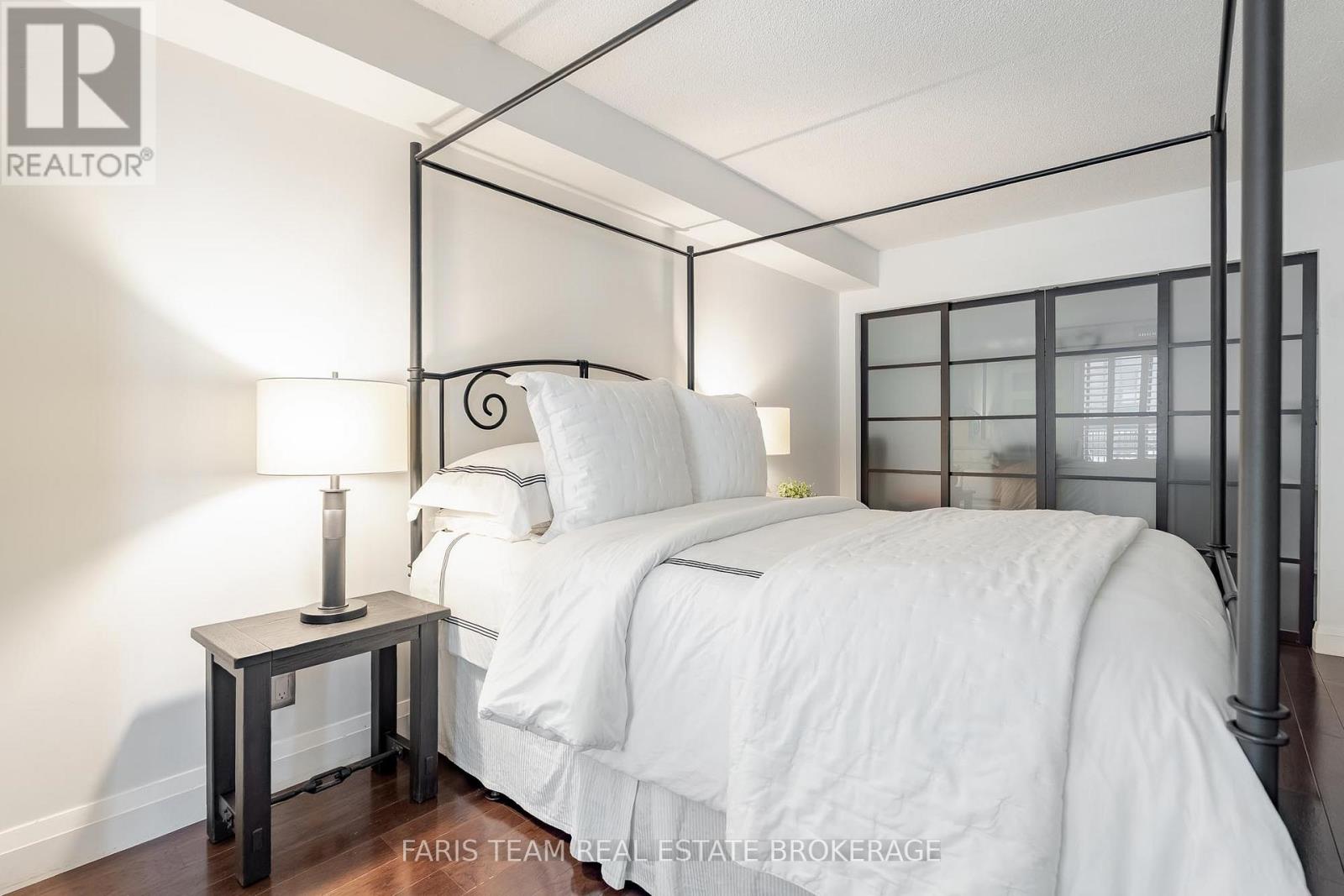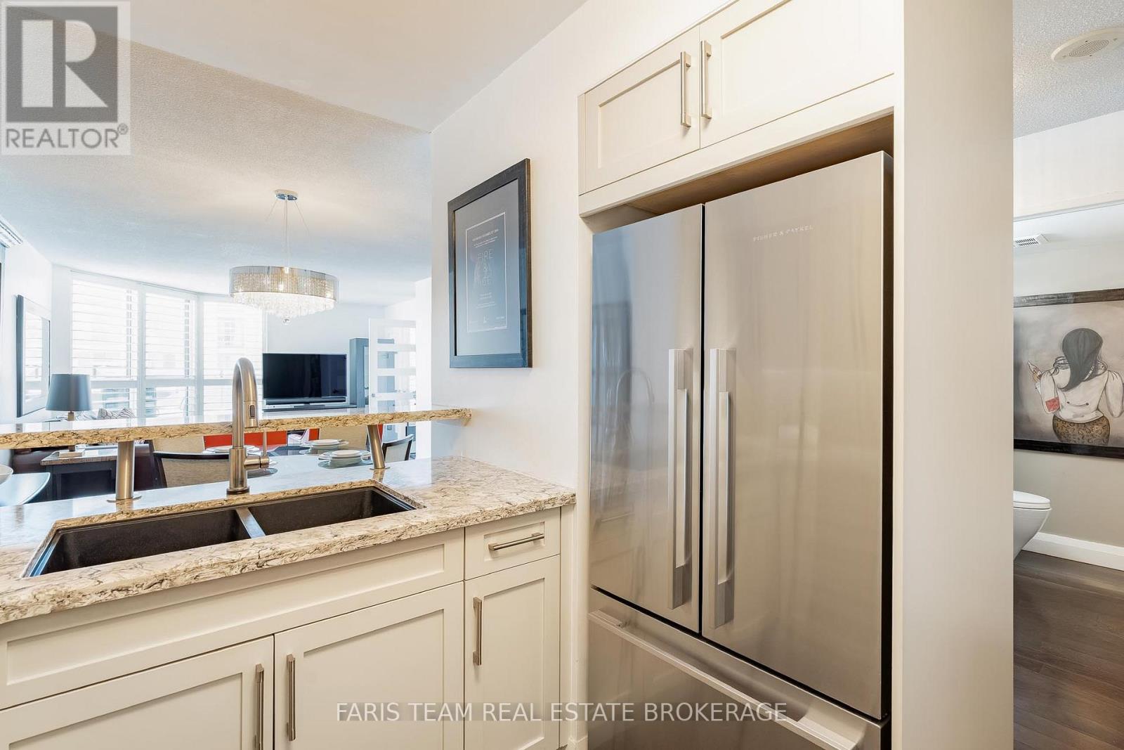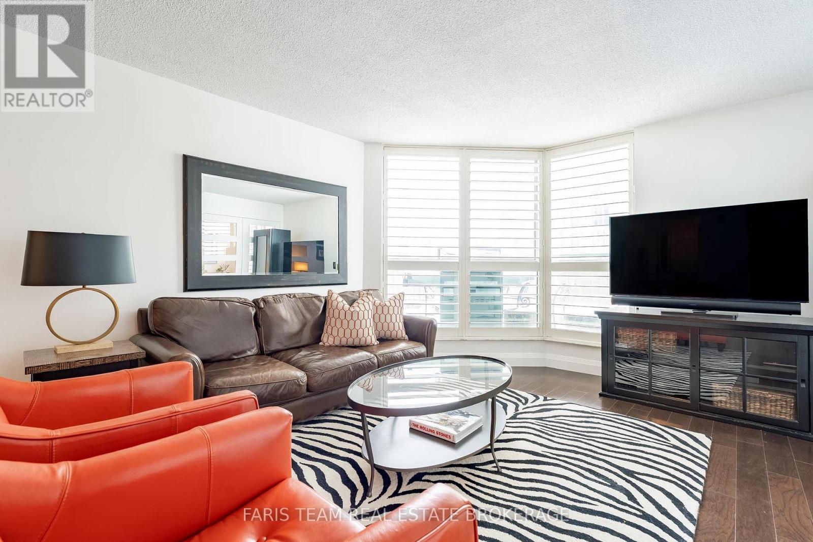 Top 5 Reasons You Will Love This Home: 1) One of the most coveted suites in the building, this residence is positioned on the preferred side of the East Tower and enjoys a permanently protected view, offering rare peace of mind with no future development planned directly in front of the unit 2) Extensively customized beyond builder finishes, the suite showcases engineered hardwood flooring throughout, tall baseboards, and bespoke interior doors, creating a polished, elevated atmosphere from the moment you step inside 3) The kitchen is designed to impress both home chefs and entertainers, featuring quartz countertops, premium custom cabinetry, a brand-new full-size refrigerator, and a professional-grade Fisher & Paykel stove valued at over $10,000, a standout upgrade rarely found in condo living 4) Everyday comfort is elevated with thoughtful upgrades, including a spa-inspired bathroom with a modern TOTO toilet, California shutters on every window, and a built-in sound system throughout, while the spacious bedroom and versatile den offer flexibility for a home office, guest space, or additional living area 5) Outdoor living is equally well considered, with a private balcony complete with a barbeque and patio furniture, ideal for relaxing or entertaining while taking in the view, along with one owned parking space and the option to rent a second, condo fees that include heat, hydro, and water, and access to premium amenities such as an indoor pool, hot tub, sauna, gym, and party room, all just steps from Barrie's waterfront, trails, shops, and restaurants. 843 sq.ft. (id:4555)