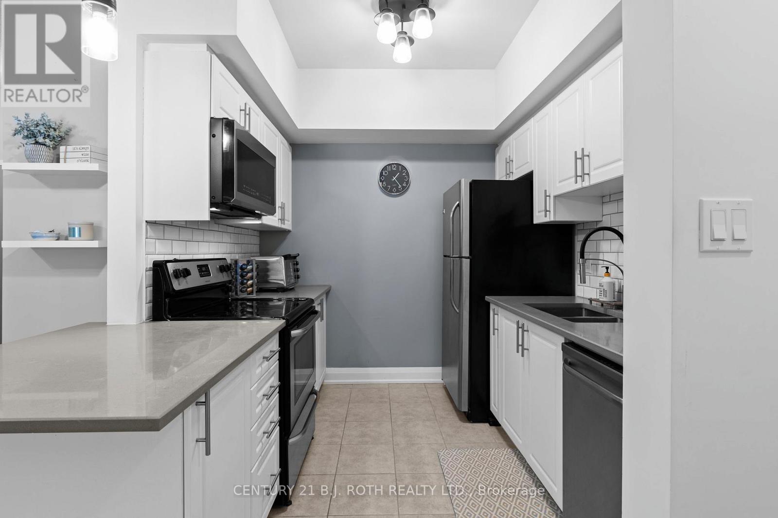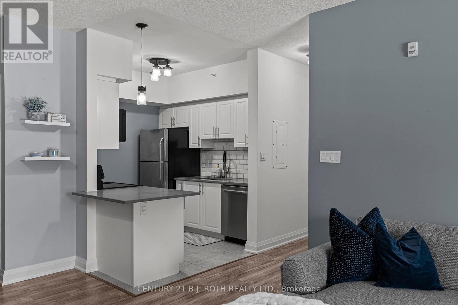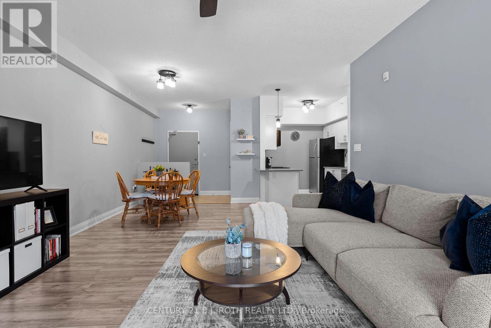 Presenting 7 Greenwich Street, Suite 108 at Greenwich Village Barrie, a desirable main-floor residence overlooking the Eco-Park that offers a rare sense of calm and privacy. This thoughtfully designed suite features approximately 1,000 sq. ft. of living space with two bedrooms and one bathroom, complemented by one underground parking, one surface parking spot, a storage locker, and a spacious balcony ideal for relaxing or enjoying a barbecued meal. Inside, the home is finished with airy 9-foot ceilings, elegant trim and door casings, high-end laminate flooring throughout, and designer light fixtures. The kitchen showcases white shaker cabinetry, beveled-edge quartz countertops, a tiled backsplash, stainless steel appliances, and a convenient microwave above the range. The bathroom continues the upscale feel with a quartz vanity and a glass-tiled shower. Additional highlights include in-suite laundry and a highly efficient 2-in-1 Napoleon gas furnace and air conditioning system. Residents also enjoy access to a games room, a small parkette, and picnic benches tucked behind the building and surrounded by mature trees. Greenwich Village is proudly maintained and predominantly owner-occupied, making it one of Barrie's most sought-after and well-respected condo communities, a truly exceptional place to call home. (id:4555)