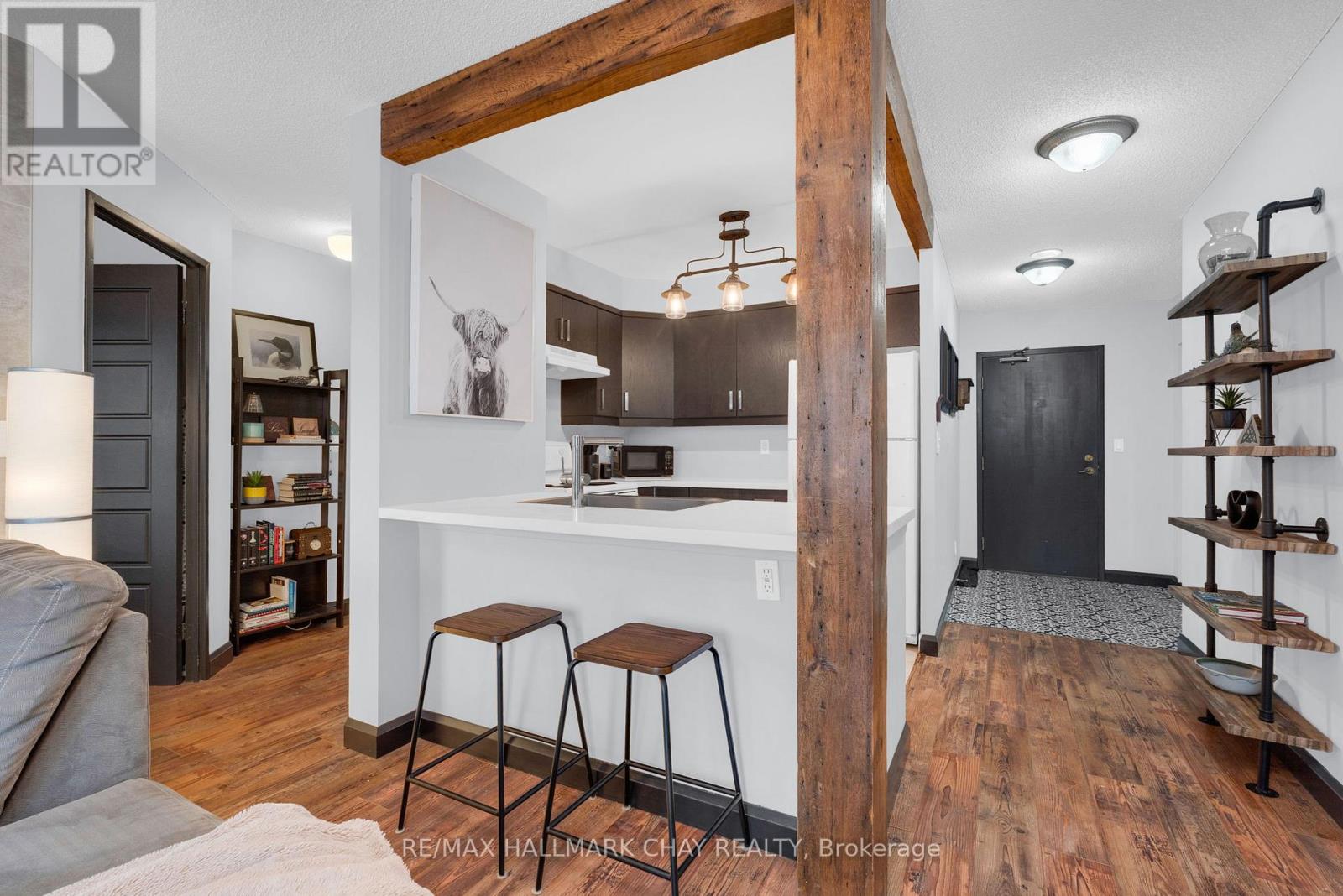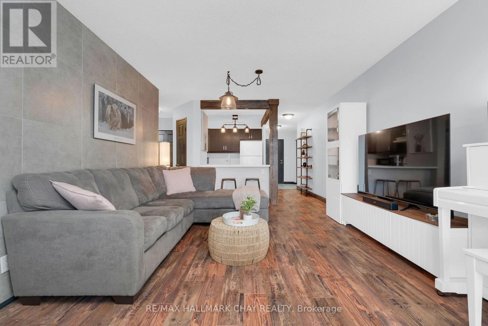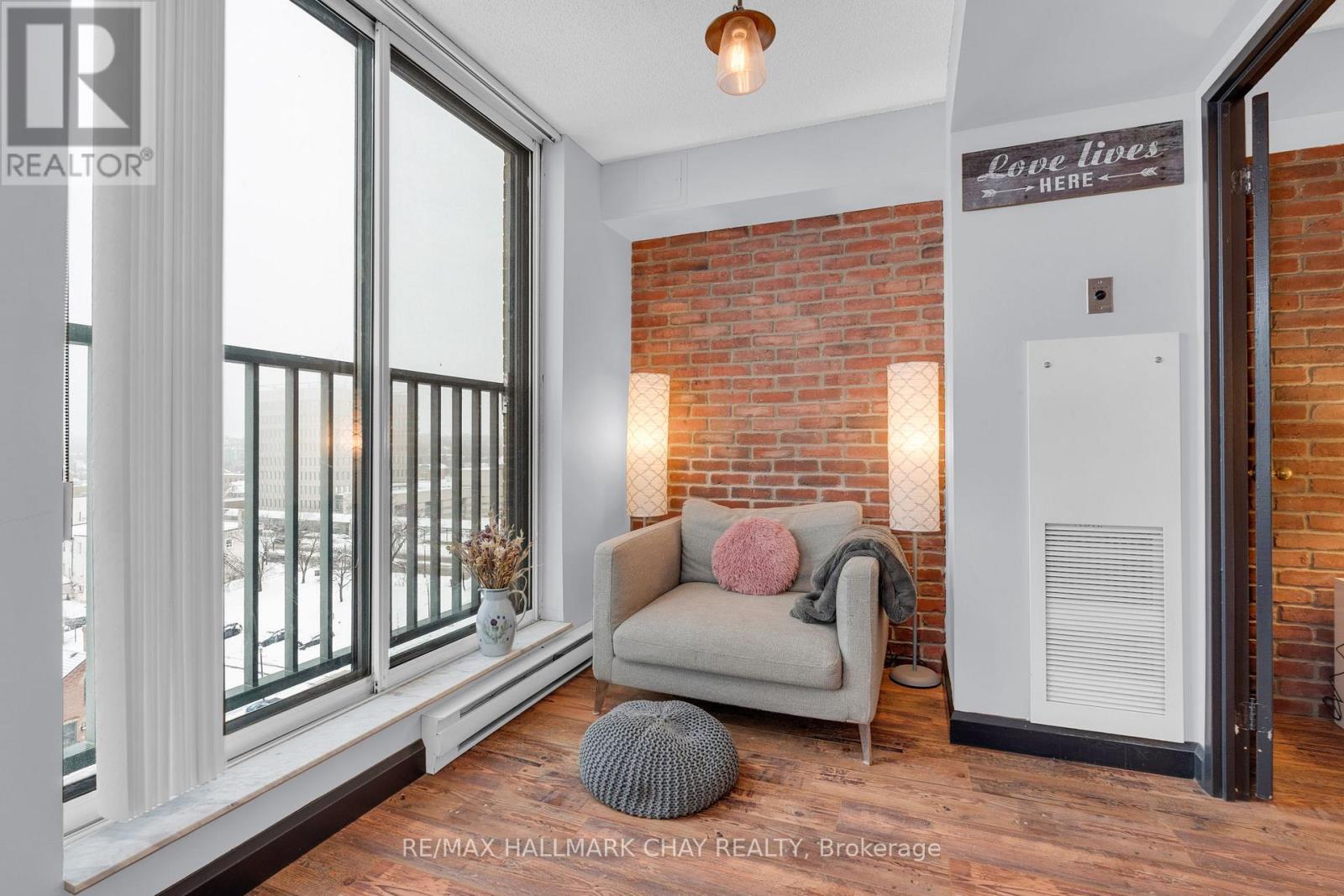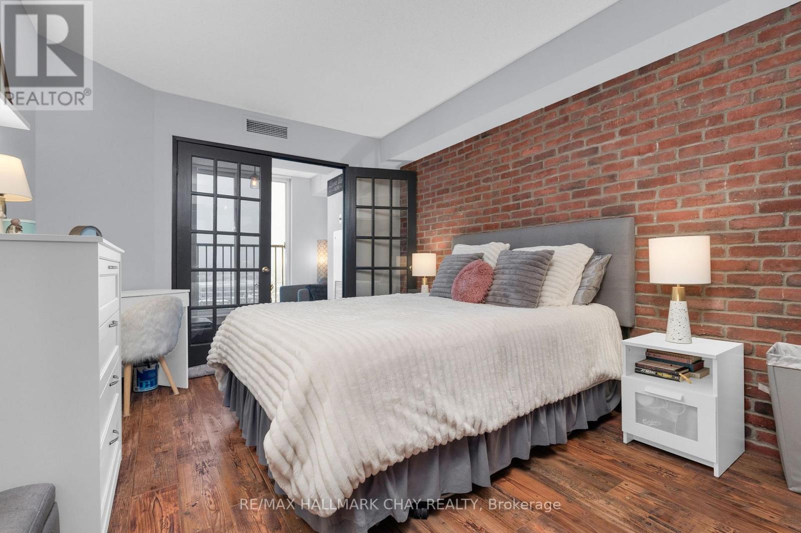 Welcome to Suite 1003 at Bayshore Landing, where waterfront living meets vibrant downtown convenience. This beautifully updated 1-bedroom and den condo offers breathtaking, unobstructed views of Kempenfelt Bay and the Barrie skyline, creating a stunning backdrop in the afternoon sun and for unforgettable sunsets. The thoughtfully designed interior features warm hardwood flooring, complemented by a striking wood beam accent that adds character and charm throughout the main living space. The open-concept layout is enhanced by custom feature walls, including a modern tile design in the living room and a stylish exposed brick wall in the bedroom, giving the home a unique, upscale feel. Large windows flood the space with natural light while perfectly framing the premium lake and city views. The added convenience of in-suite laundry makes everyday living effortless. The versatile den space features a charming Juliet balcony and offers flexibility with access from both the living area and the bedroom. This adaptable space is perfect for a large walk-in closet, additional living area, or the ideal home office for today's remote or hybrid lifestyle. Step outside and enjoy one of Barrie's most sought-after locations. Walk along the North Shore Trail, relax at nearby beaches, or explore the many local restaurants, cafés, and shops just steps from your door. Whether you enjoy an active lifestyle or quiet waterfront evenings, this location truly has it all. Residents of Bayshore Landing enjoy exceptional amenities including an indoor pool, hot tub, sauna, fitness centre, and secure indoor parking. This unit also includes underground parking and a rare, double-sized indoor locker, offering valuable additional storage. Ideal for professionals, downsizers, or anyone looking to embrace a low-maintenance waterfront lifestyle, this is your opportunity to own in one of Barrie's most desirable condo communities. (id:4555)