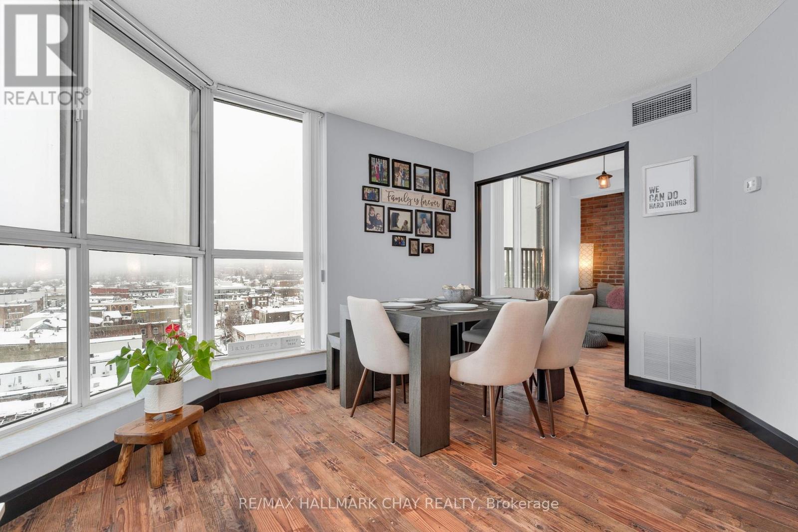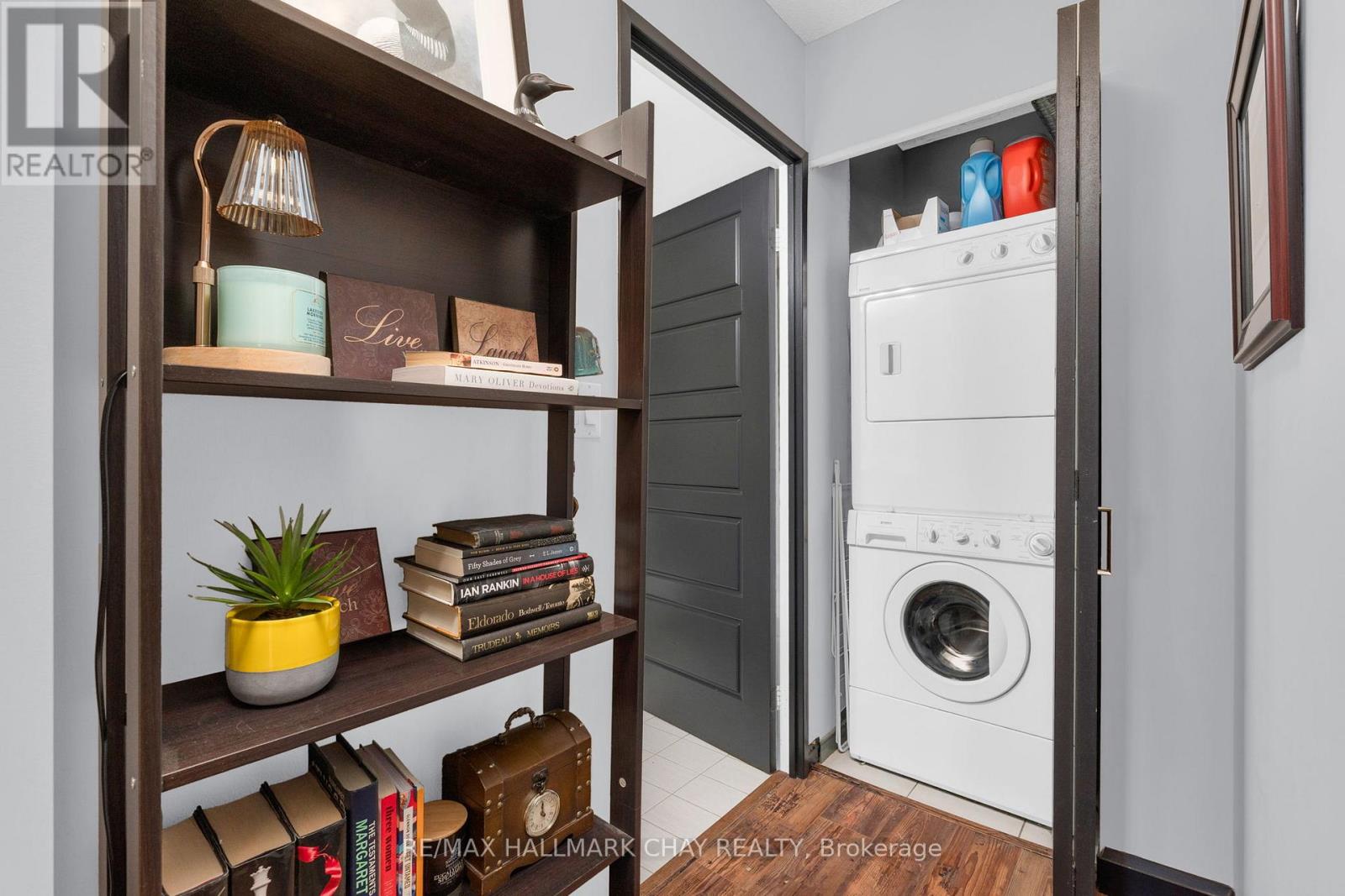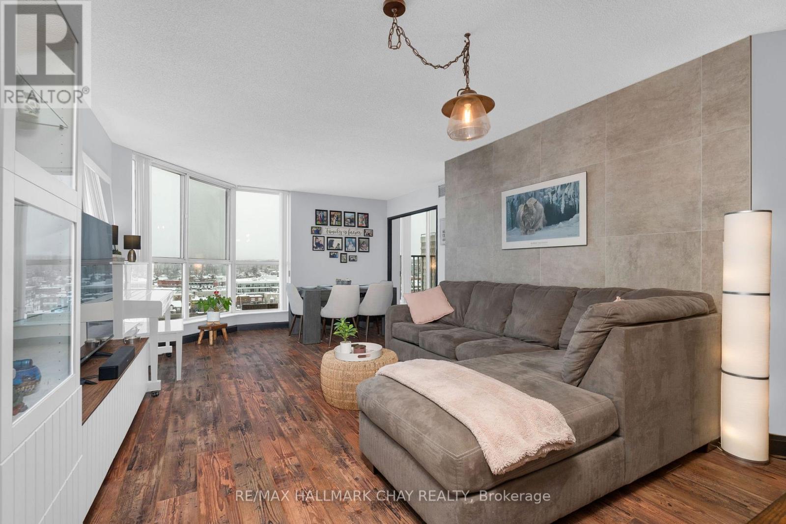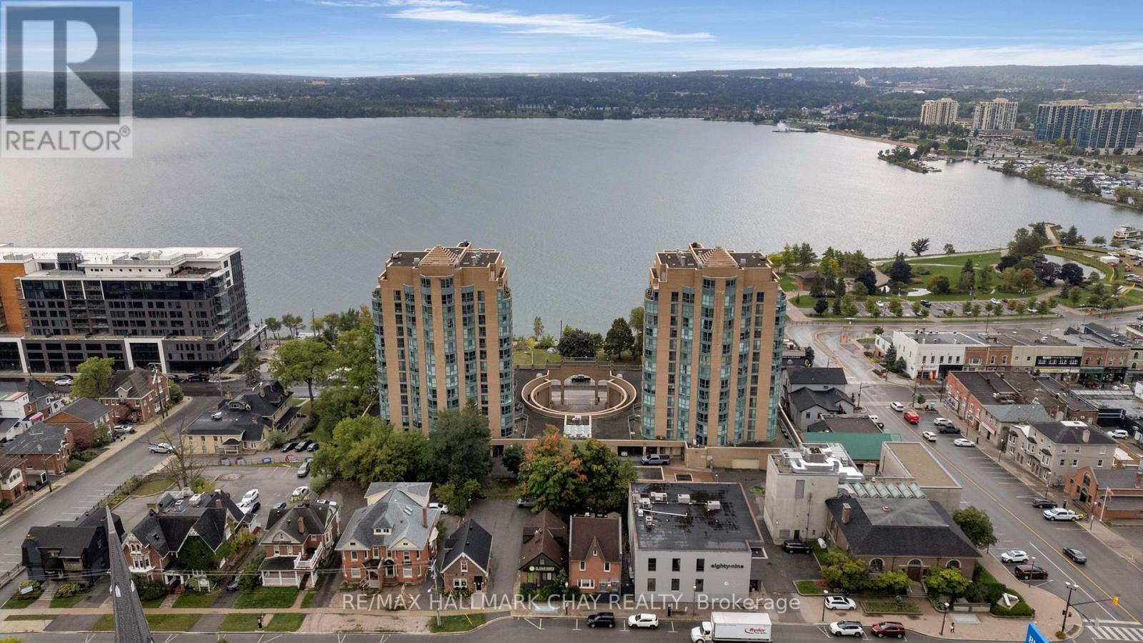 Welcome to Suite 1003 at Bayshore Landing, where waterfront living meets vibrant downtown convenience. This beautifully updated 1-bedroom and den condo offers breathtaking, unobstructed views of Kempenfelt Bay and the Barrie skyline, creating a stunning backdrop in the afternoon sun and for unforgettable sunsets. The thoughtfully designed interior features warm hardwood flooring, complemented by a striking wood beam accent that adds character and charm throughout the main living space. The open-concept layout is enhanced by custom feature walls, including a modern tile design in the living room and a stylish exposed brick wall in the bedroom, giving the home a unique, upscale feel. Large windows flood the space with natural light while perfectly framing the premium lake and city views. The added convenience of in-suite laundry makes everyday living effortless. The versatile den space features a charming Juliet balcony and offers flexibility with access from both the living area and the bedroom. This adaptable space is perfect for a large walk-in closet, additional living area, or the ideal home office for today's remote or hybrid lifestyle. Step outside and enjoy one of Barrie's most sought-after locations. Walk along the North Shore Trail, relax at nearby beaches, or explore the many local restaurants, cafés, and shops just steps from your door. Whether you enjoy an active lifestyle or quiet waterfront evenings, this location truly has it all. Residents of Bayshore Landing enjoy exceptional amenities including an indoor pool, hot tub, sauna, fitness centre, and secure indoor parking. This unit also includes underground parking and a rare, double-sized indoor locker, offering valuable additional storage. Ideal for professionals, downsizers, or anyone looking to embrace a low-maintenance waterfront lifestyle, this is your opportunity to own in one of Barrie's most desirable condo communities. (id:4555)