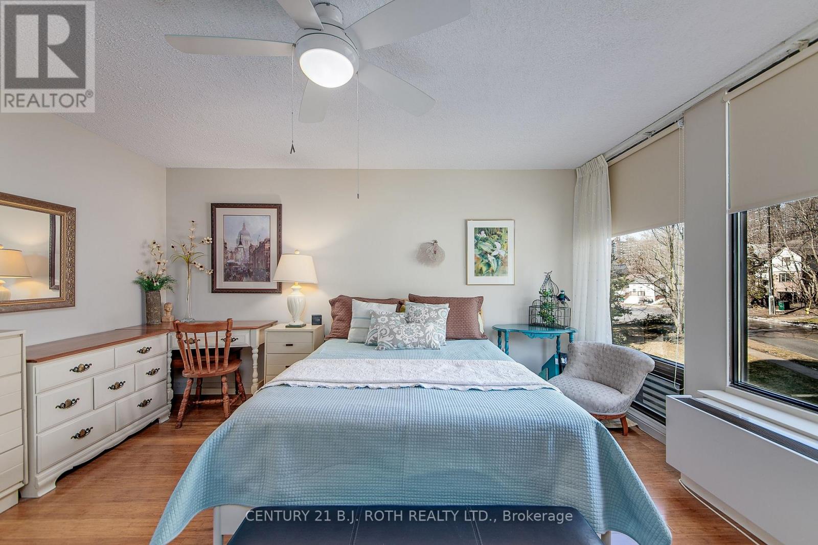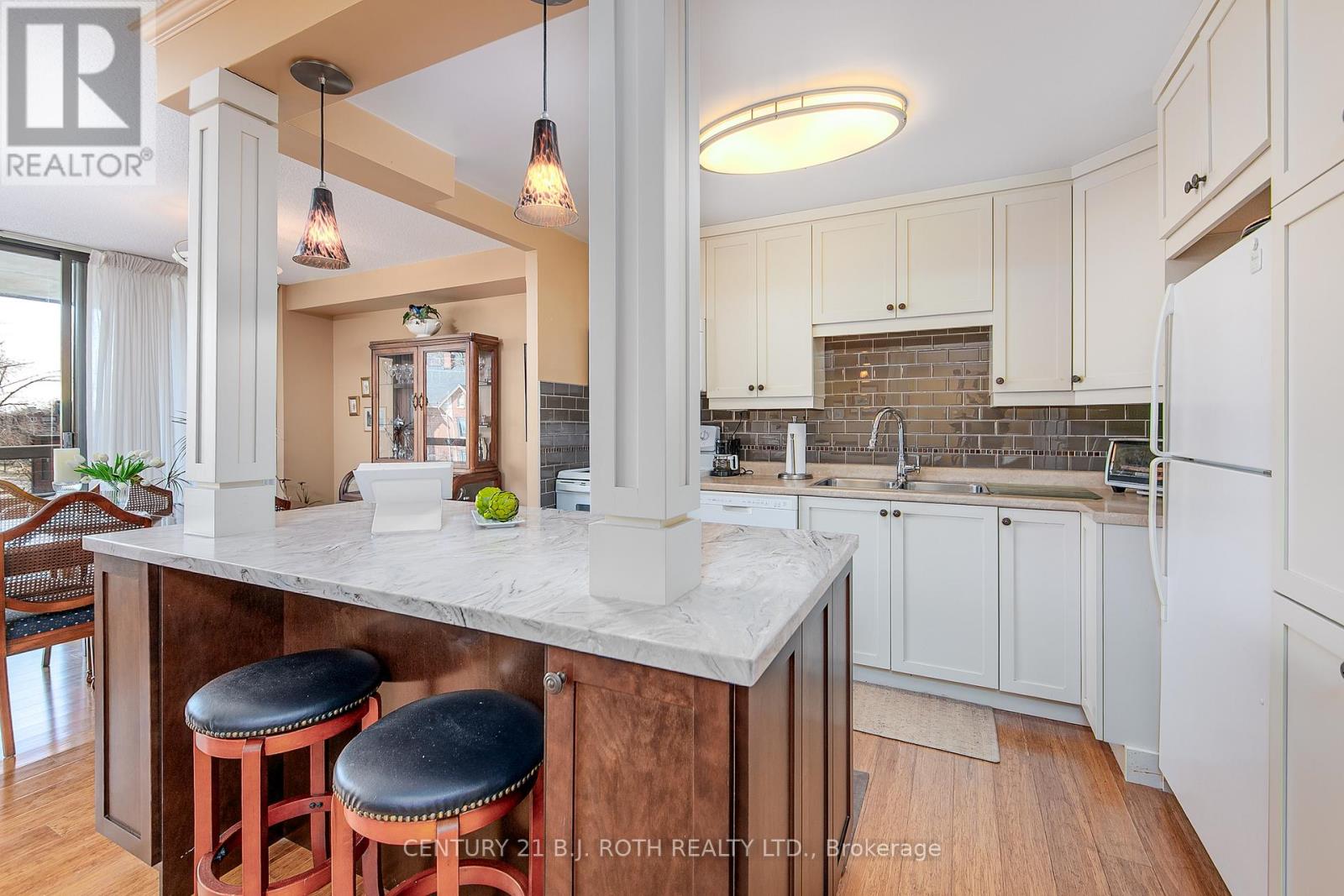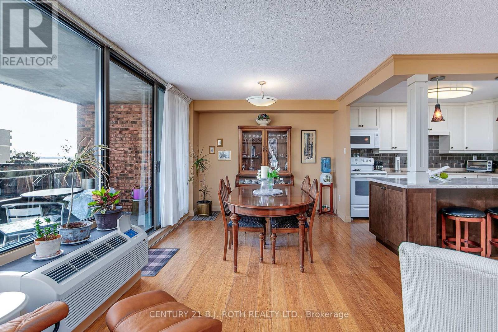 Welcome to an attractively priced opportunity at The Bay Club, known for its incredible amenities and location. This professionally updated home has an open concept layout with expansive windows. The eastern exposure provides morning sun and afternoon shade which makes the open air balcony pleasant all day. This bright and cheerful unit offers 1,324 square feet of living space. This 3 bedroom, 2 bath home is highlighted by bamboo floors and rich ceramics throughout resulting in a seamless flow from one room to the other. The updated kitchen will delight any chef; it has tons of cupboards and counter space and offers a huge island which works well as a breakfast bar or servery and is complimented by additional storage. The living room, dining room, kitchen and den are open concept making it a breeze to entertain. The bedrooms are generous size with large closets. One bedroom has been opened up and is a sitting room however, it could easily be reversed should the third bedroom be required. The two bathrooms are updated and lovely. There is ensuite laundry and a really handy utility room with shelves. This unit has 3 heat pumps which provides warmth in the winter and cooling in the summer. They are economical to run and keep the expenses down. To complete this package, there is an exclusive underground parking space and locker. The incredible facilities include an indoor pool, sauna, hot tub, fitness center, party room, billiards room, tennis/pickleball court, squash/ping pong room, woodworking shop, potting room where you can leave your plants when you are away, puzzle room, library, and to top it off, a wonderful guest suite with kitchenette. The Club is located just outside the downtown core; it is a short walk to restaurants, groceries, art gallery, churches, shops, public transportation and the waterfront walking trails. Condo fees covers hot and cold water, parking, cable, internet, common elements, and management fees. Hydro costs are approximately $74 per month (id:4555)