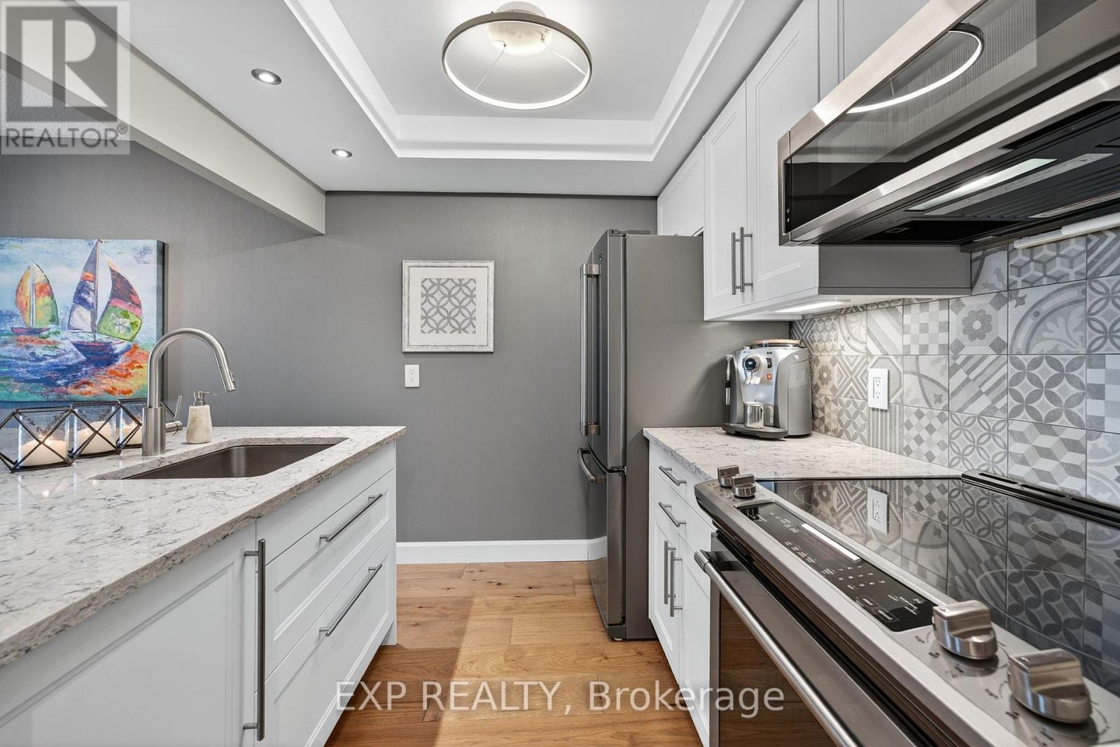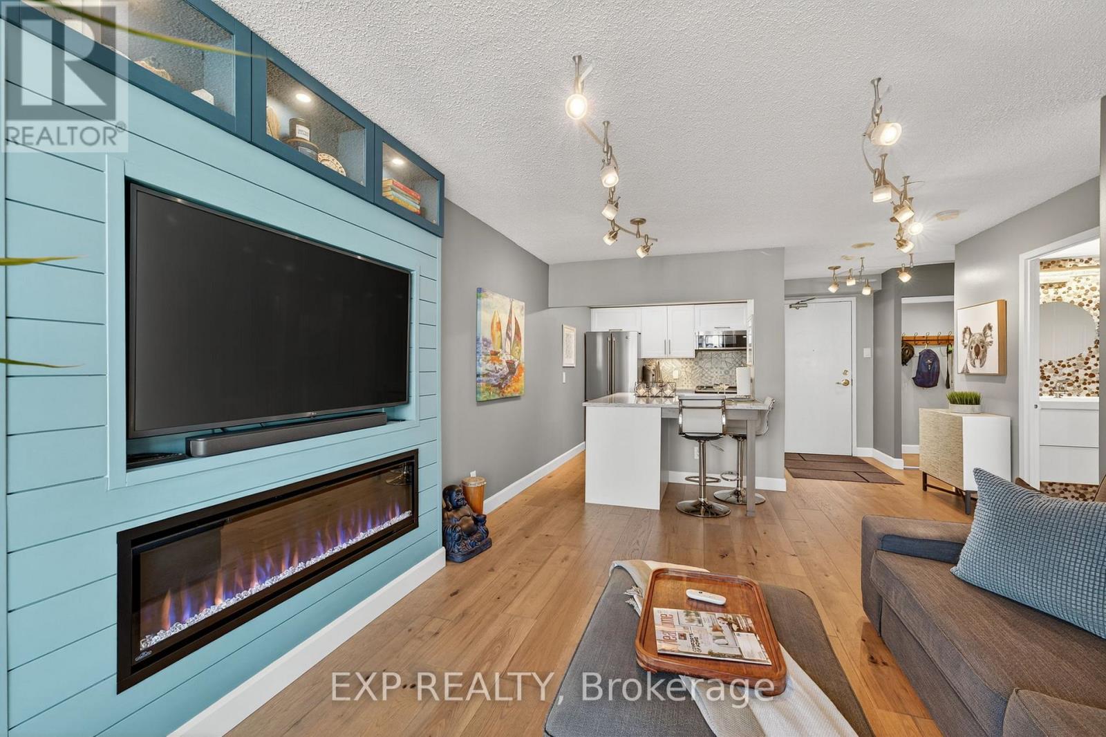 WATER VIEW : This is truly a lifestyle! Custom Design and Stunning Views. Make your dream of living on the waterfront a reality. The Regatta and the Marina Bay towers are established on the largest property right across from Barrie's Centennial Beach. This gated enclave is offering plenty of green space with beautifully landscaped grounds and an abundance of PARKING for your visitors, features that you will hardly find at any downtown condo buildings. FULLY RENOVATED unit with quality finishes and functionality, you will feel at home the moment you cross the door step! From the warmth and richness of its hickory wide plank flooring to the elegant "Silestone" quartz counter tops, you will enjoy the flow and feel of the space. All appliances are FULL SIZE for your convenience and enjoyment. Be the witness of marvellous sunrises over Kempenfelt Bay and take advantage of the waterfront trails for an easy walk to downtown. Steps to GO Train and public transit. New Furnace & A/C installed in 2022. Napoleon fireplace 2021. All appliances replaced in 2020. Water and Hot Water are included in Condo fees. Low electricity bill (including heating/cooling) averaging approx. $75/month, no gas. Unit size is 640 sqft. (id:4555)