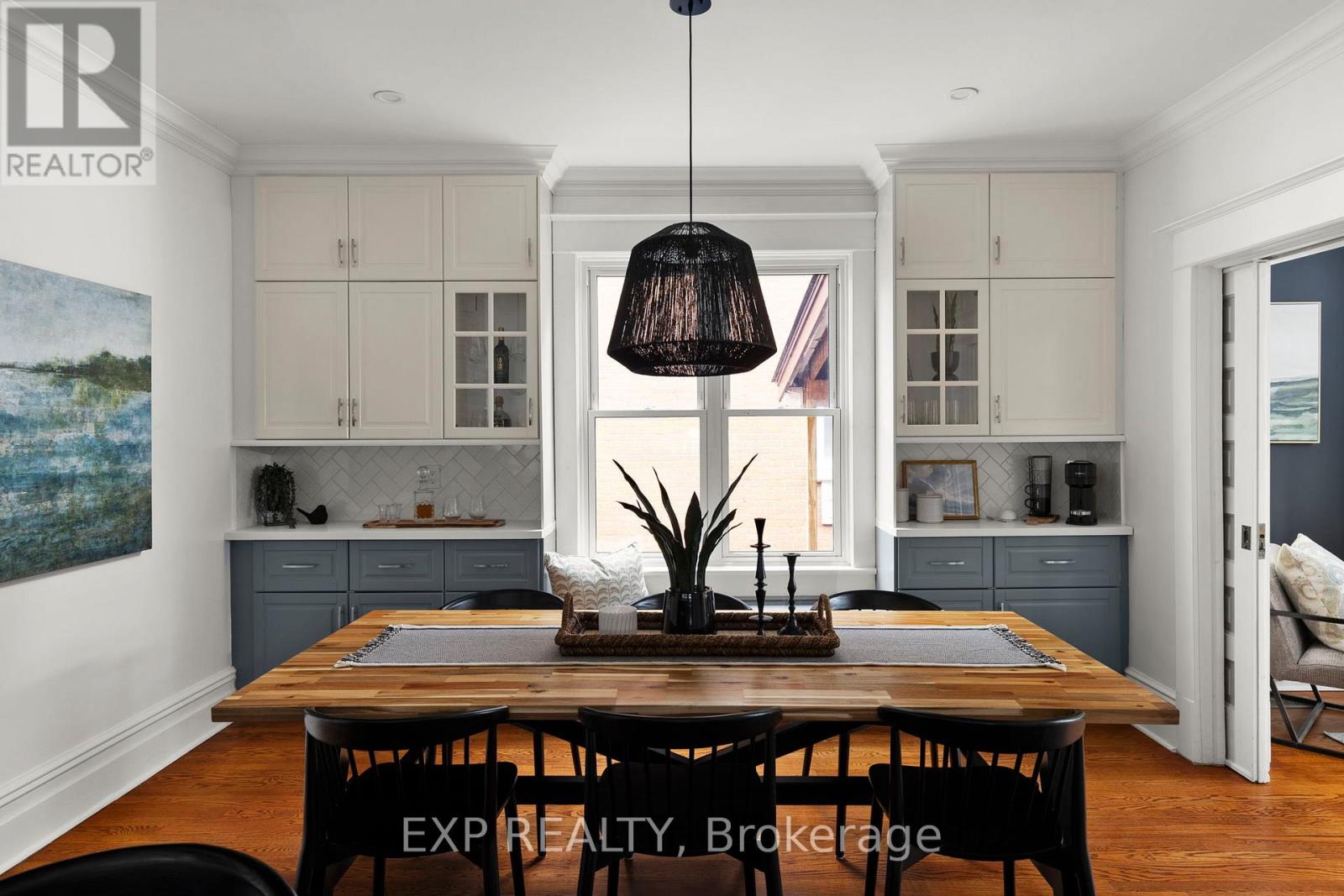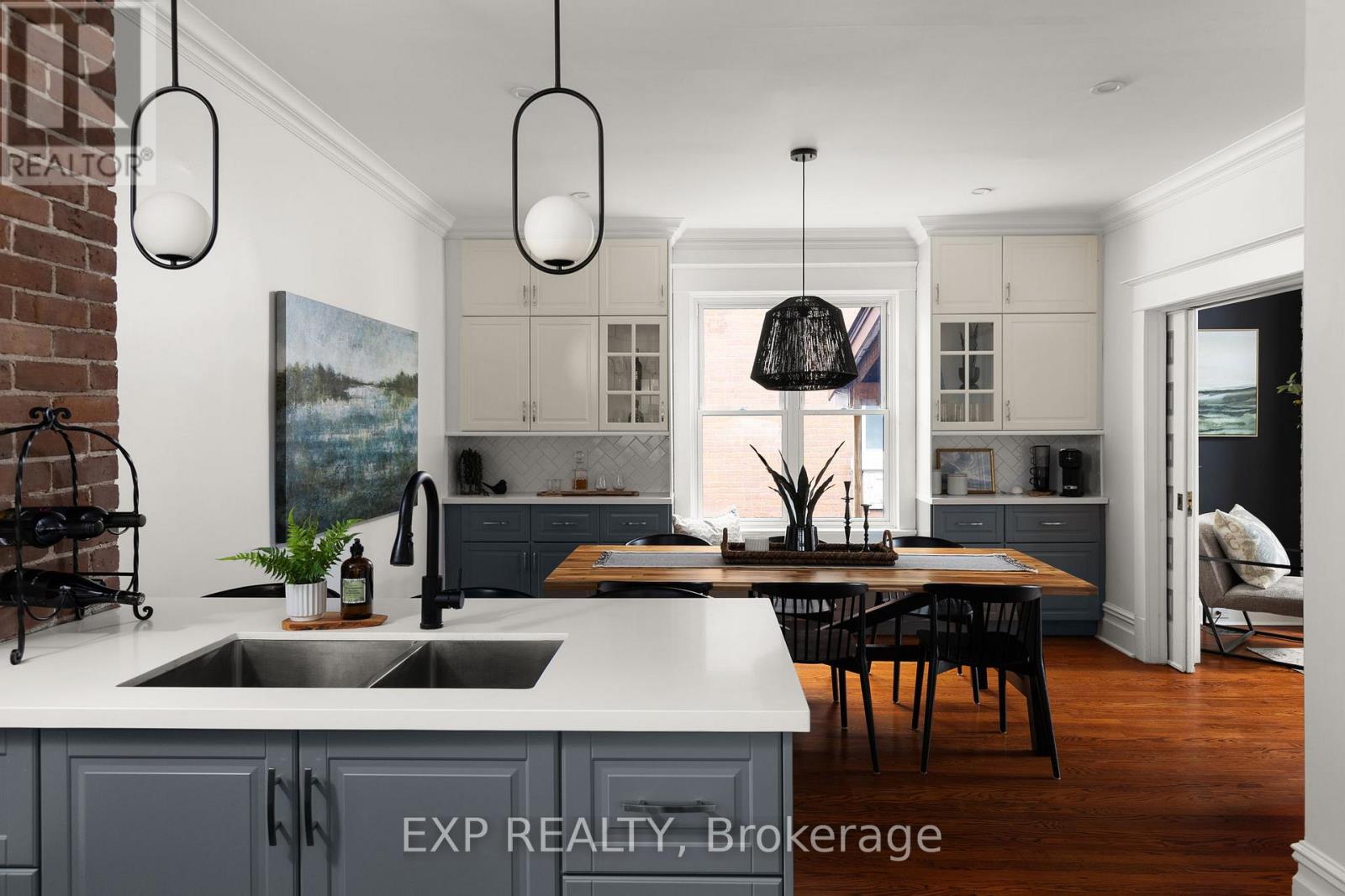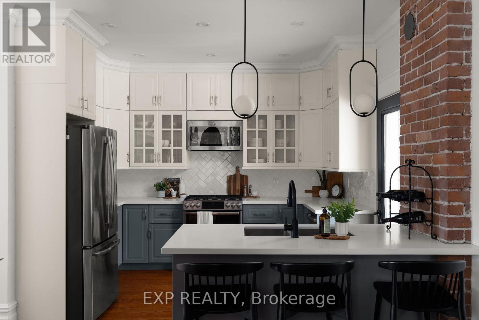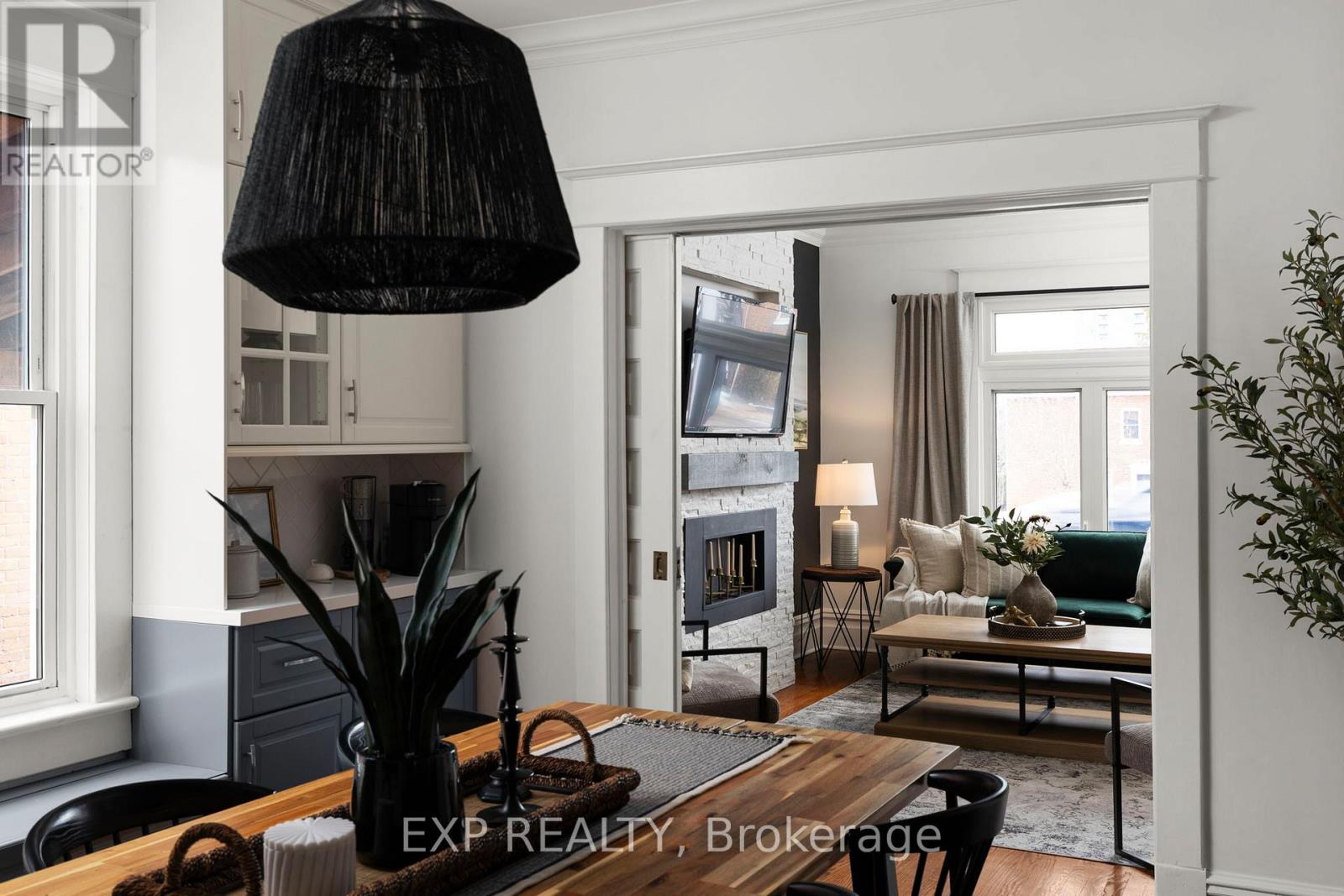 Set in the heart of Barrie, 36 Sophia Street West is a beautifully updated century home that blends historic character with thoughtful modern upgrades. Inside, hardwood floors run throughout the main living spaces, complemented by original trim, custom trim detailing around the windows and doors, detailed mouldings, and charming sliding doors that add warmth and architectural character. A custom finished entry wall adds another layer of character and polish. The living room is anchored by a fireplace feature, creating a cozy setting for evenings at home, while the two-tone eat-in kitchen features stainless steel appliances, quartz countertops, full-height cabinetry, and exposed brick accents that highlight the home's historic roots. A walkout extends the living space outdoors, and a bright main floor powder room adds everyday convenience. The upper level offers four bedrooms and a 4-piece bathroom, including a bedroom with a walkout patio that overlooks Lake Simcoe, a unique vantage point for watching the downtown fireworks or the summer air show. The third-floor primary suite is a standout retreat with vaulted ceilings, built-in storage, and a spa-like ensuite. The finished basement provides additional flexible living space ideal for recreation, work-from-home needs, or hosting guests. Notable updates include a roof (2019), central air conditioning (2019), furnace (2017), a new owned hot water heater (2026), main-level paint (2024), and fresh basement paint (2026). Outside, the fully fenced backyard offers an unusually large outdoor space for a downtown property, complemented by a new partially covered deck that creates the perfect setting for entertaining. Located just a five-minute walk to Barrie's waterfront, downtown restaurants, cafés, and nightlife, with Highway 400 only a two-minute drive away, this home offers the rare opportunity to enjoy historic charm, modern comfort, and exceptional walkability in one of the city's most convenient locations. (id:4555)