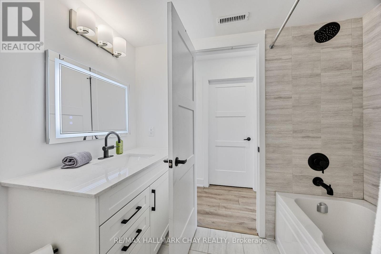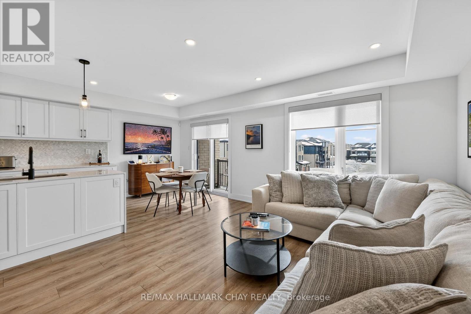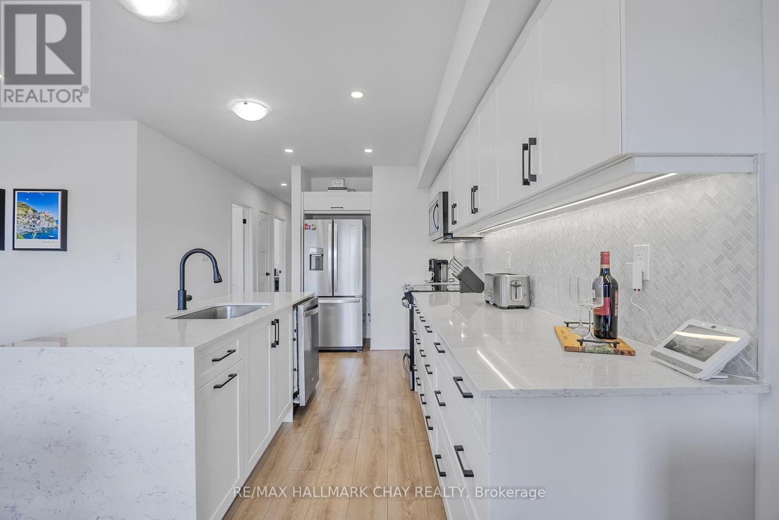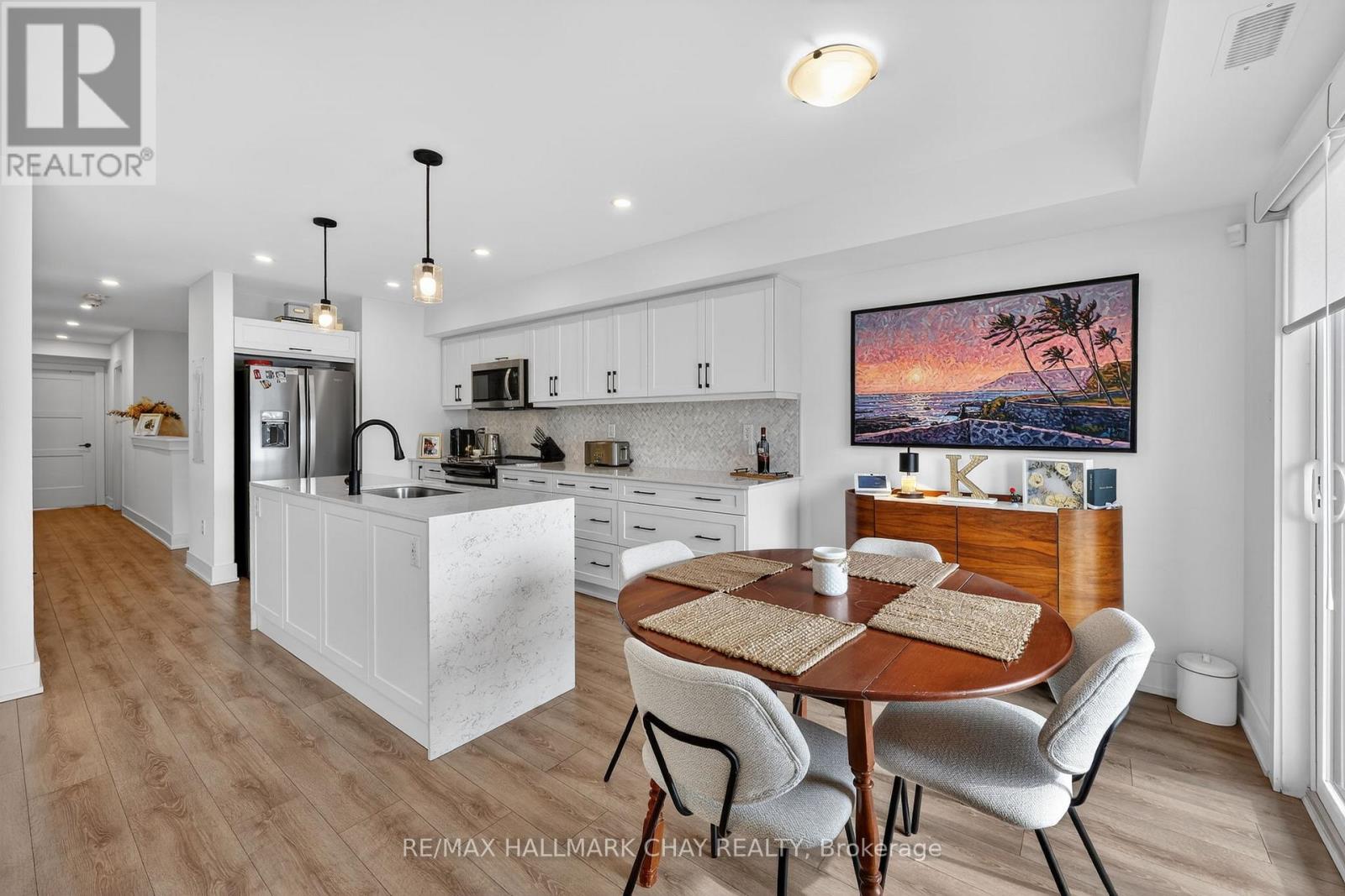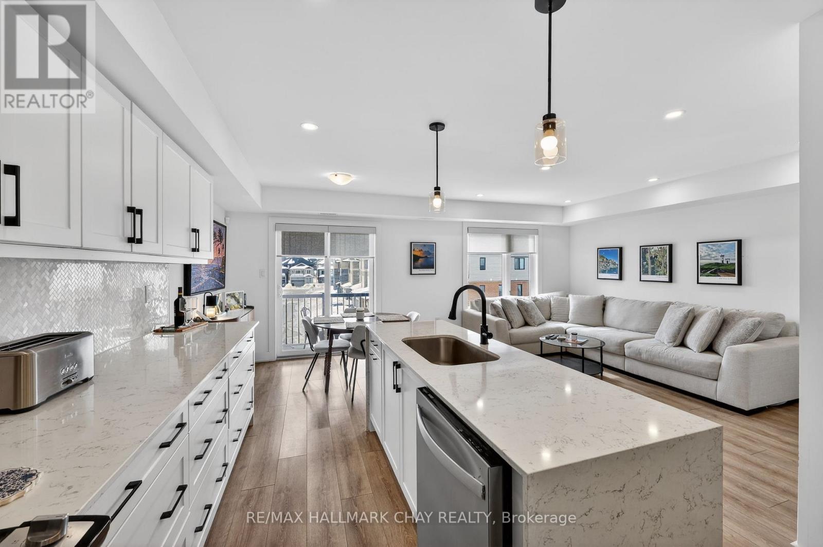 Stylishly Upgraded Condo Townhome In Barrie's Desirable Southeast End. Step Into This Beautifully Upgraded Condo-Townhome That Seamlessly Blends Modern Design With Practical Living. No Detail Was Overlooked & No Expense Sparred Featuring An Oversized Kitchen Outfitted With White Shaker-Style Cabinetry, Soft-Close Doors, Sleek Black Hardware, Upgraded Black Faucets, Under-Cabinet Lighting, And A Premium Stainless Steel Appliance Package. The Show stopping Oversized Island Boasts Quartz Waterfall Countertops, Perfect For Entertaining. Enjoy Open-Concept Living With Pot Lights And High-End Vinyl Flooring Throughout. The Spacious Living Room Is Flooded With Natural Light From Large South-Facing Windows, Complemented By 'Hunter-Douglas' Automatic Blinds And A Generous Balcony Ideal For BBQs And Soaking In The Sunshine. You'll Find Three Spacious Bedrooms, All With Upgraded Closet Doors, Black Hardware, And Continued Vinyl Flooring. The Primary Retreat Includes A Walk-In Closet And A Beautifully Finished 3-Piece Ensuite With A Glass Walk-In Shower And Quartz Vanity. The Two Additional Bedrooms Share A Modern 4-Piece Bathroom, Also With Quartz Countertops. Additional Highlights Include A 1-Car Garage With Inside Entry And An Automatic Door Opener, A Dedicated Outdoor Area With Potential For A Private Fenced Yard, And Visitor Parking For Guests. Conveniently Located Near Park Place, Friday Harbour, Beaches, Top-Rated Schools, Golf Courses, And Everyday Amenities. Also Easy Access To Go-Train & Highway 400 For Commuters Or Going To The GTA For More Entertainment. (id:4555)