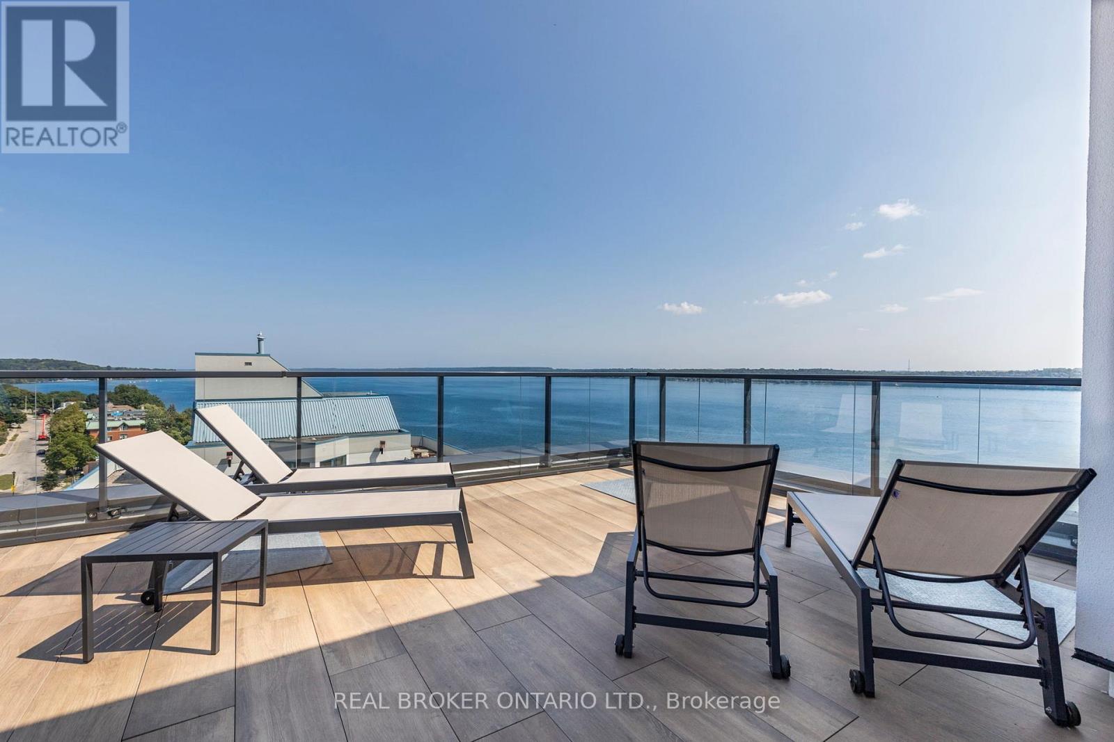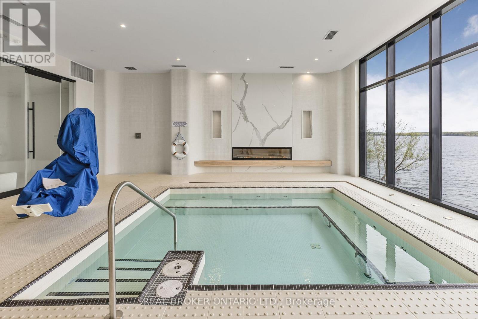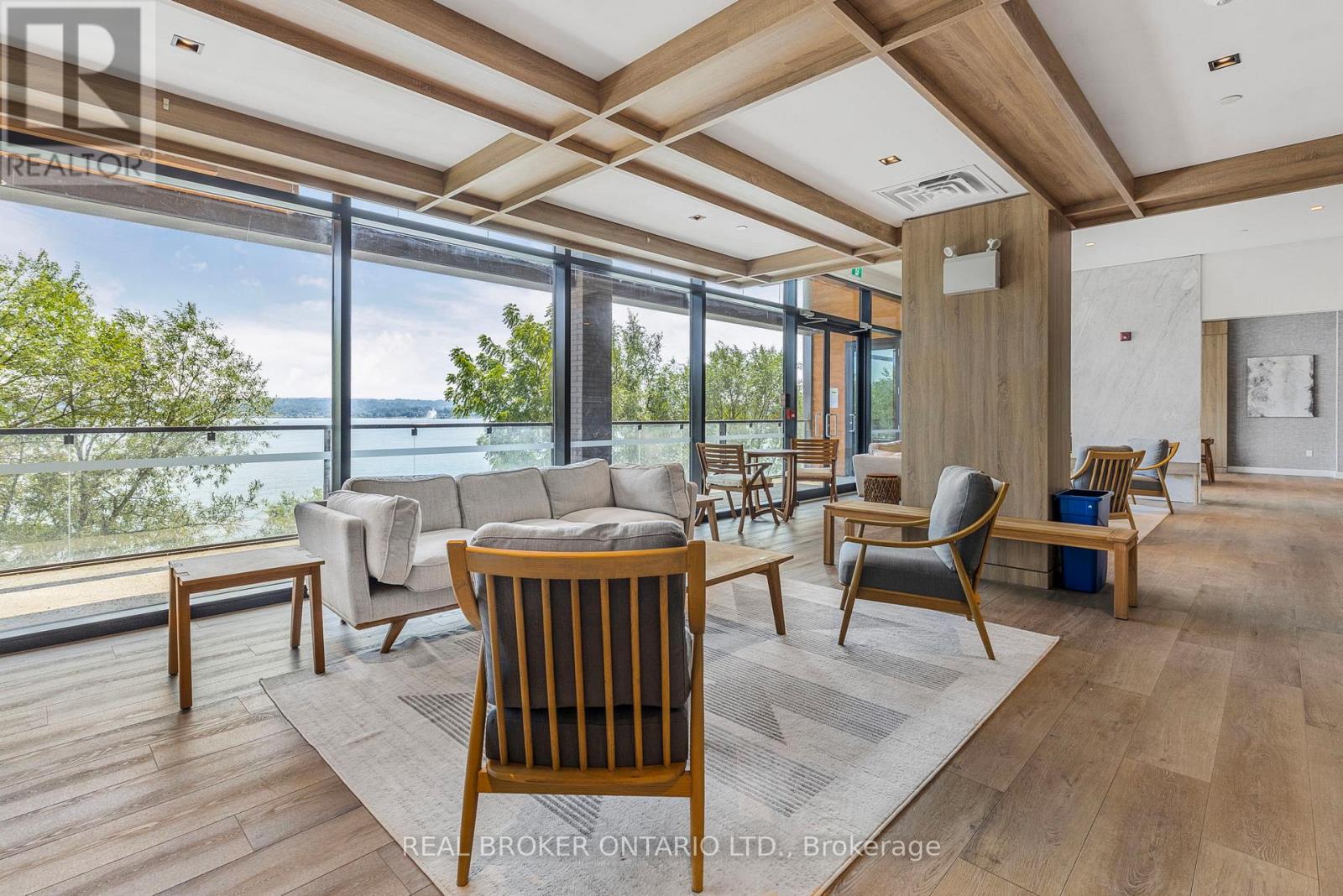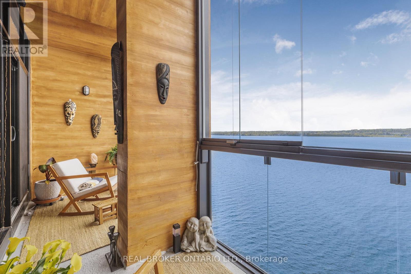 Welcome to Penthouse 3 at Lakhouse, Barrie's premier lakefront luxury condominium on the shores of Lake Simcoe. This exceptional penthouse offers a rare blend of modern design, upgraded finishes, and breathtaking views for a truly elevated lifestyle. Step inside to discover soaring ceilings and a thoughtfully customized interior of almost 1300 square feet. The stunning kitchen has all upgraded appliances and an extended breakfast bar with a built in beverage fridge making it perfect for entertaining. The living room features a custom built shiplap wall with a six foot electric fireplace, and a built in bench for extra seating and storage. Oversized windows flood the entire space with natural light. The primary bedroom is a true retreat with a spacious double vanity ensuite and a custom closet that reaches almost to the ceiling with extra deep hanging spaces, shelves and drawers on both sides. Enjoy stunning, unobstructed views of Kempenfelt Bay year round on the large private balcony with a unique railing-to-roof glass enclosure that opens fully. Use the spacious den for a second bedroom, a guest room or a flexible work space. En-suite laundry has been upgraded to include full sized machines. Building amenities include: two rooftop terraces with BBQs, kitchens, fire features, and panoramic lake views. A beautifully appointed party room, with a bar, meeting space, caterers kitchen and and indoor lounge areas with terrace access. A full-service fitness studio with locker rooms, whirlpool, sauna, and steam room. Pet spa, guest suites, indoor storage for paddle boards, kayaks and bikes, and two floating docks for easy lake access. On-site bakery café and pharmacy for added convenience. 24-hour concierge and security for peace of mind. Storage locker located on the same level as the unit. Includes two indoor parking spaces. This is a rare opportunity to own a signature penthouse suite in one of Barrie's most desirable luxury residences. (id:4555)