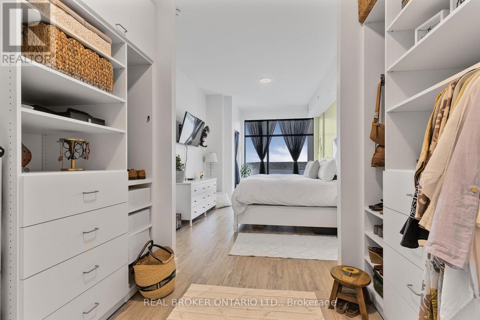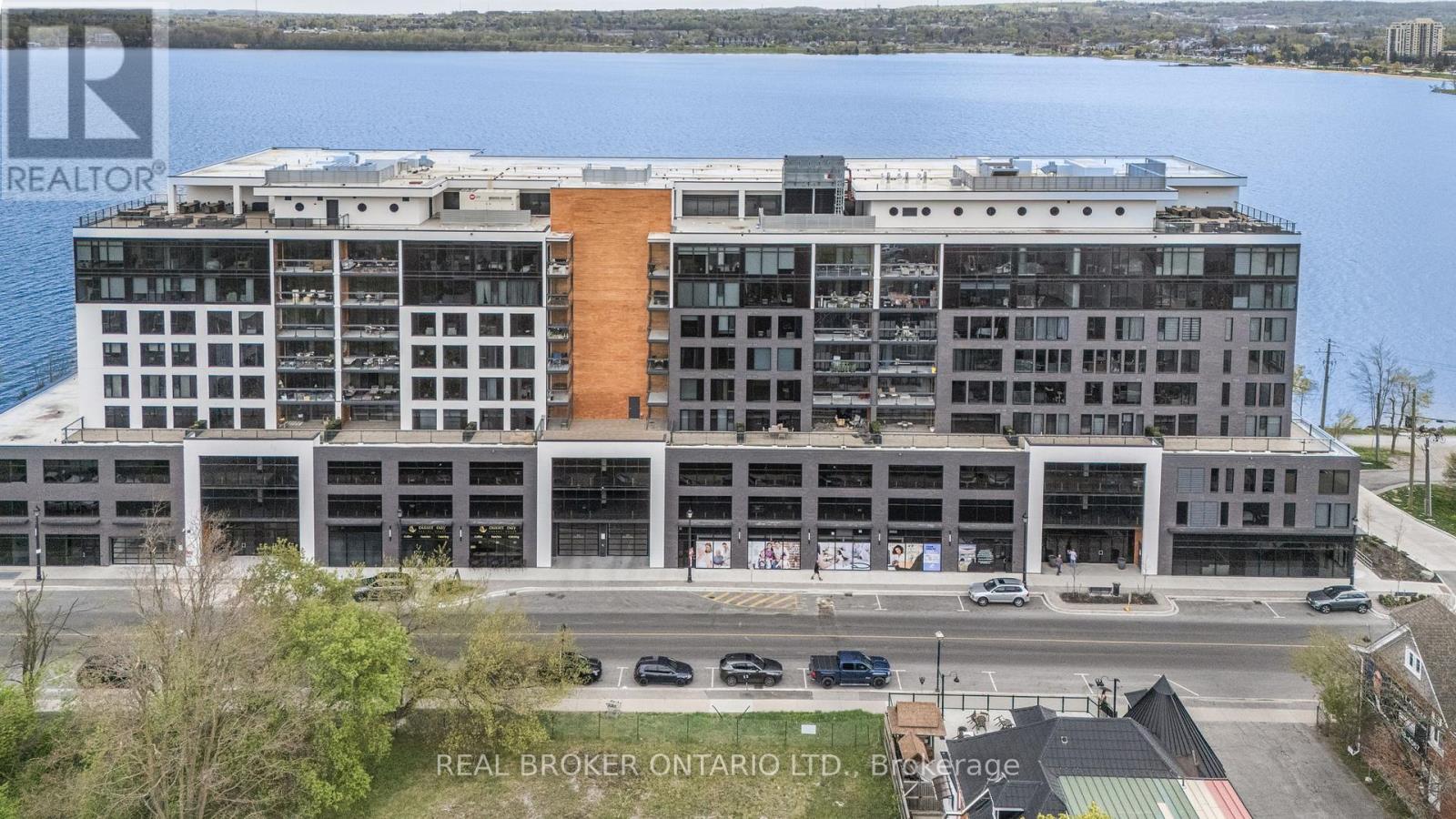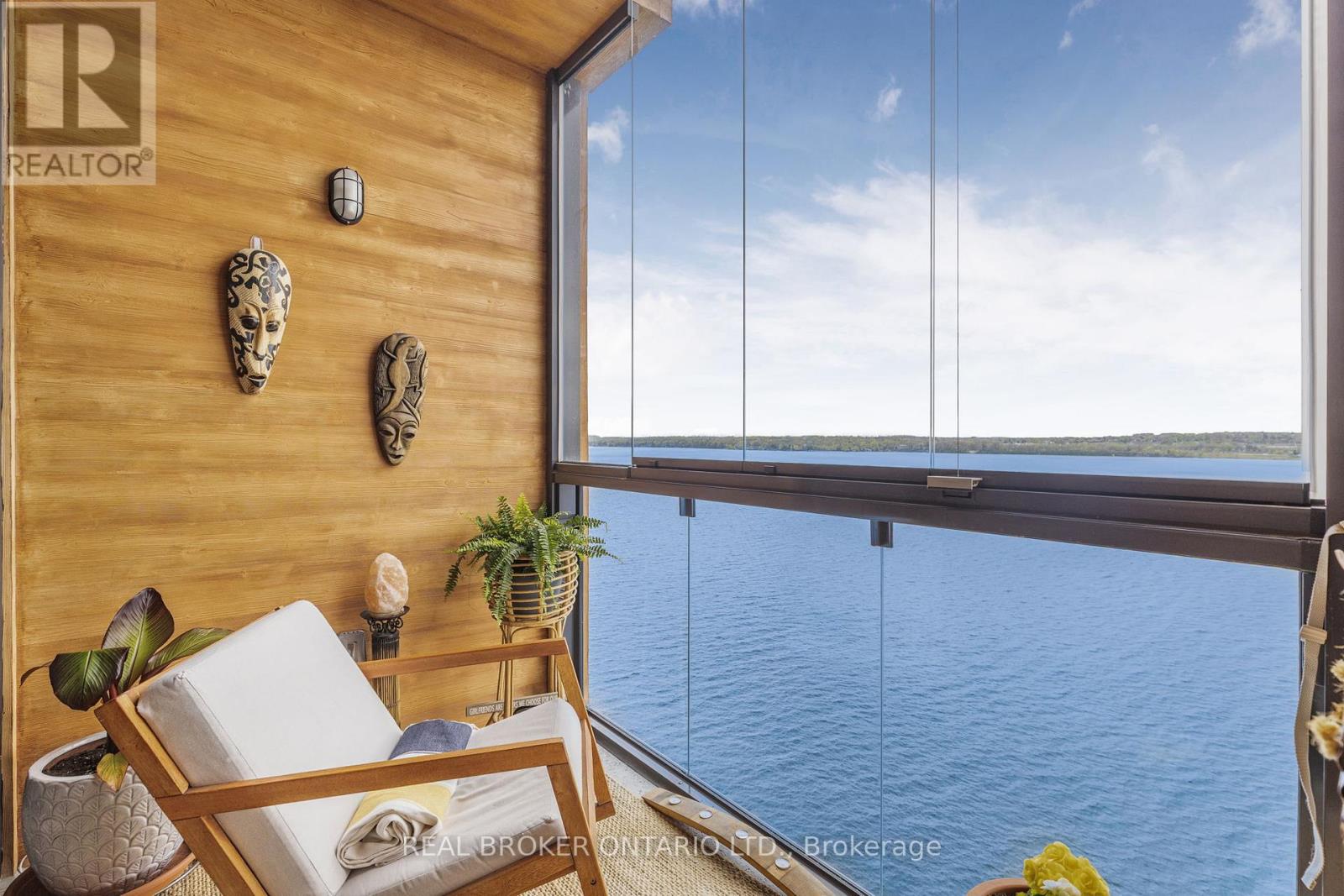 Welcome to Penthouse 3 at Lakhouse, Barrie's premier lakefront luxury condominium on the shores of Lake Simcoe. This exceptional penthouse offers a rare blend of modern design, upgraded finishes, and breathtaking views for a truly elevated lifestyle. Step inside to discover soaring ceilings and a thoughtfully customized interior of almost 1300 square feet. The stunning kitchen has all upgraded appliances and an extended breakfast bar with a built in beverage fridge making it perfect for entertaining. The living room features a custom built shiplap wall with a six foot electric fireplace, and a built in bench for extra seating and storage. Oversized windows flood the entire space with natural light. The primary bedroom is a true retreat with a spacious double vanity ensuite and a custom closet that reaches almost to the ceiling with extra deep hanging spaces, shelves and drawers on both sides. Enjoy stunning, unobstructed views of Kempenfelt Bay year round on the large private balcony with a unique railing-to-roof glass enclosure that opens fully. Use the spacious den for a second bedroom, a guest room or a flexible work space. En-suite laundry has been upgraded to include full sized machines. Building amenities include: two rooftop terraces with BBQs, kitchens, fire features, and panoramic lake views. A beautifully appointed party room, with a bar, meeting space, caterers kitchen and and indoor lounge areas with terrace access. A full-service fitness studio with locker rooms, whirlpool, sauna, and steam room. Pet spa, guest suites, indoor storage for paddle boards, kayaks and bikes, and two floating docks for easy lake access. On-site bakery café and pharmacy for added convenience. 24-hour concierge and security for peace of mind. Storage locker located on the same level as the unit. Includes two indoor parking spaces. This is a rare opportunity to own a signature penthouse suite in one of Barrie's most desirable luxury residences. (id:4555)