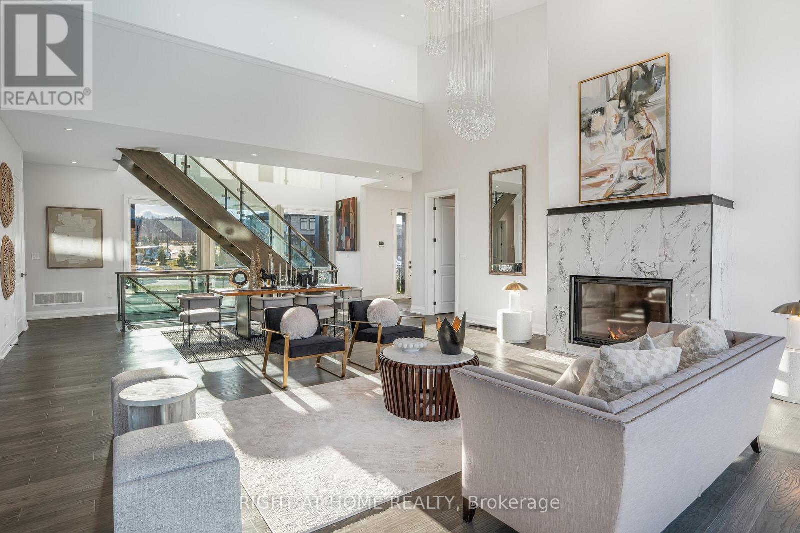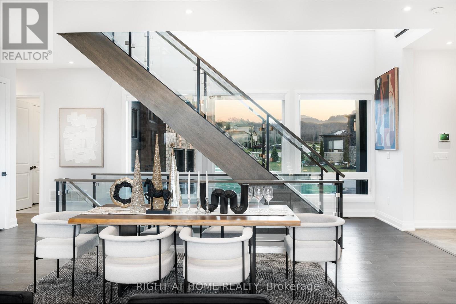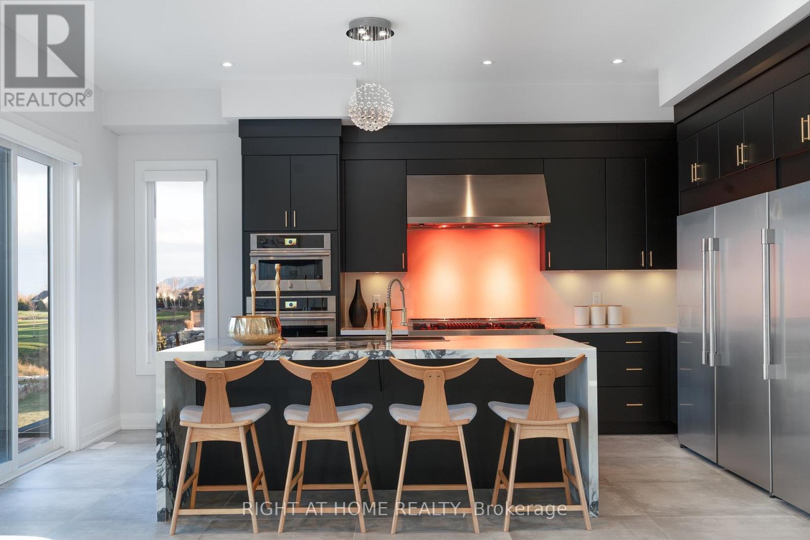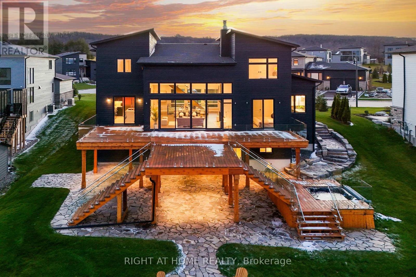 Welcome Home! An extraordinary residence perfectly positioned on one of Lora Bay's most prestigious and private lots. Overlooking the 13th hole, with sweeping views of Georgian Bay and the Niagara Escarpment, this architectural masterpiece offers an unparalleled lifestyle of elegance and serenity. Showcasing 5,337 sq. ft. of refined living space, this home impresses from the moment you step inside. The grand great room features 25 ft. cathedral ceilings, floor-to-ceiling windows, and seamless access to an expansive InvisiRail deck-a truly spectacular vantage point for sunrise, sunset, and year-round fairway vistas.The chef's kitchen is designed for both culinary excellence and entertaining, complete with a commercial-grade gas range, built-in convection microwave, stainless steel triple refrigerator/freezer, oversized island, and automated main-floor blinds for effortless comfort and privacy.The luxurious primary suite offers a private retreat with a gas fireplace, walkout to the deck, walk-in closet, and spa-inspired ensuite with a deep soaker tub and glass shower. The main level also includes an additional bedroom, a four-piece bath, and a convenient laundry room.The second-floor mezzanine overlooks the great room and leads to a bright office with bay views, two generous bedrooms, and a stylish wet bar with dishwasher-ideal for relaxation or hosting.The walkout lower level features a 1,700 sq. ft. approved apartment, perfect for extended family or guests, offering a roughed-in kitchen, two bedrooms, and direct access to the luxury hot tub and fire-pit lounge. An elegant paved driveway, curtain-style windows, and a double-car garage enhance the already striking curb appeal of this exceptional property. This is more than a home-it's a lifestyle of distinction in one of Georgian Bay's most desirable communities. (id:4555)