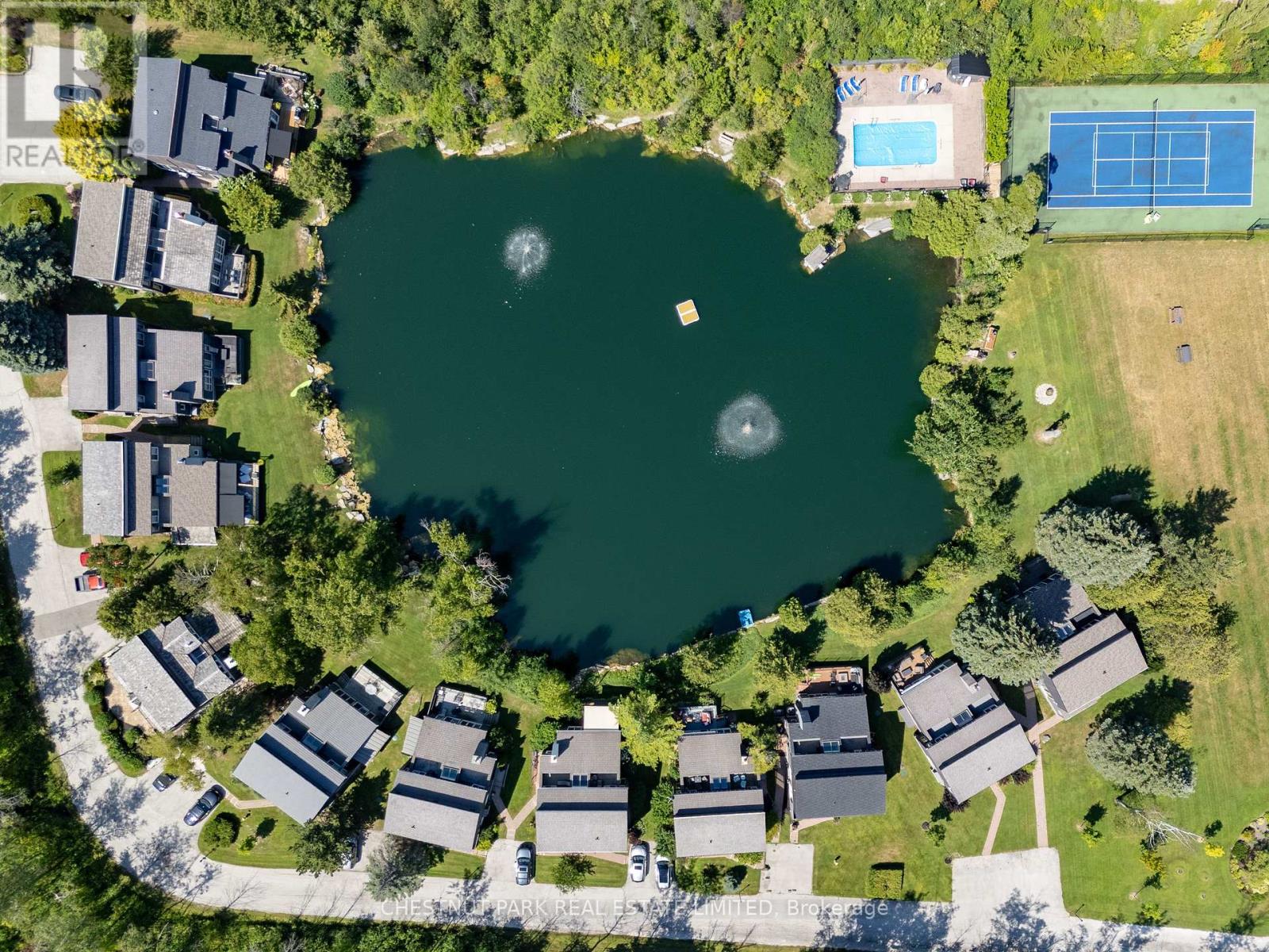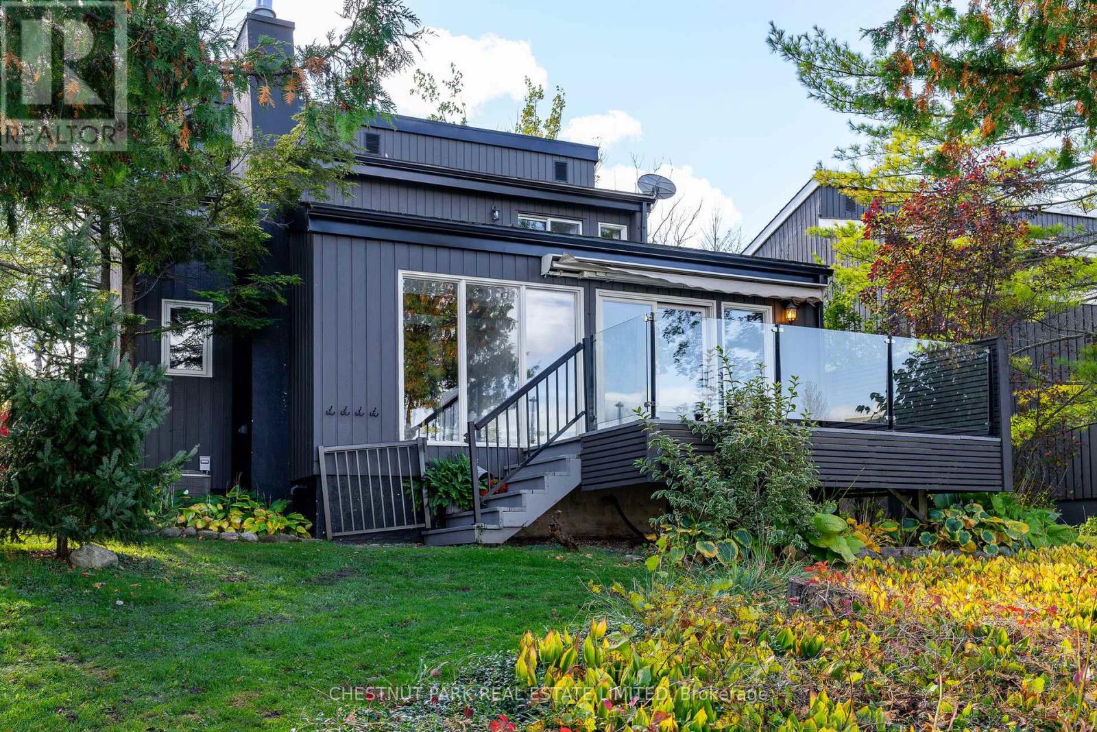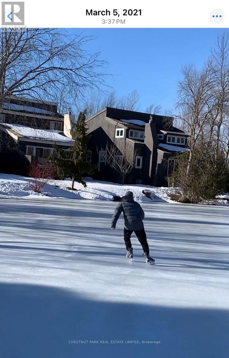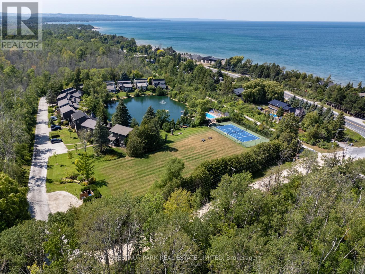 Set within the natural beauty of the Town of The Blue Mountains, and nestled between the ski hills and Georgian Bay, the private 12-home enclave of Hidden Lake is a sought-after haven for those who value peace, recreation, and elegant living. Residents enjoy an exclusive tennis and pickleball court, a sun-filled pool, a wide-open playing field, and a serene swimming pond, complete with a floating dock and diving tower - the perfect setting for four-season enjoyment. A private gate provides direct access to the Georgian Trail, perfect for biking, hiking, & x-country skiing, with a short stroll to the Bay. Chalet 9 offers almost 3000 sq ft of living space over 3 levels, 4 beds & 4 baths. Inside, the sunken great room showcases soaring ceilings, solid Fir beams, and views over the private 1-acre lake. A large kitchen with custom counters & breakfast bar opens seamlessly to the main living area - perfect for hosting family and friends. There is also a versatile main floor bedroom/ office tucked away, with a powder room across the hall. Two of three upstairs bedrooms feature sliding doors to private porches, offering peaceful views of Hidden Lake and peekaboo glimpses of Georgian Bay. The bright lower level offers a rec room, wet bar, media room, and bunk room. Outside, enjoy beautiful gardens, a front deck with a gas BBQ, and a back deck with pond views and a retractable awning. Homeowners share costs for grounds and amenities as a common elements condo. Close to Thornbury's renowned cideries, restaurants, bakeries, & shops, Scandinave Spa, & Blue Mountain resort - this is an exceptional location and a rare opportunity. This property is attractively priced for immediate sale - come play this winter! (id:4555)