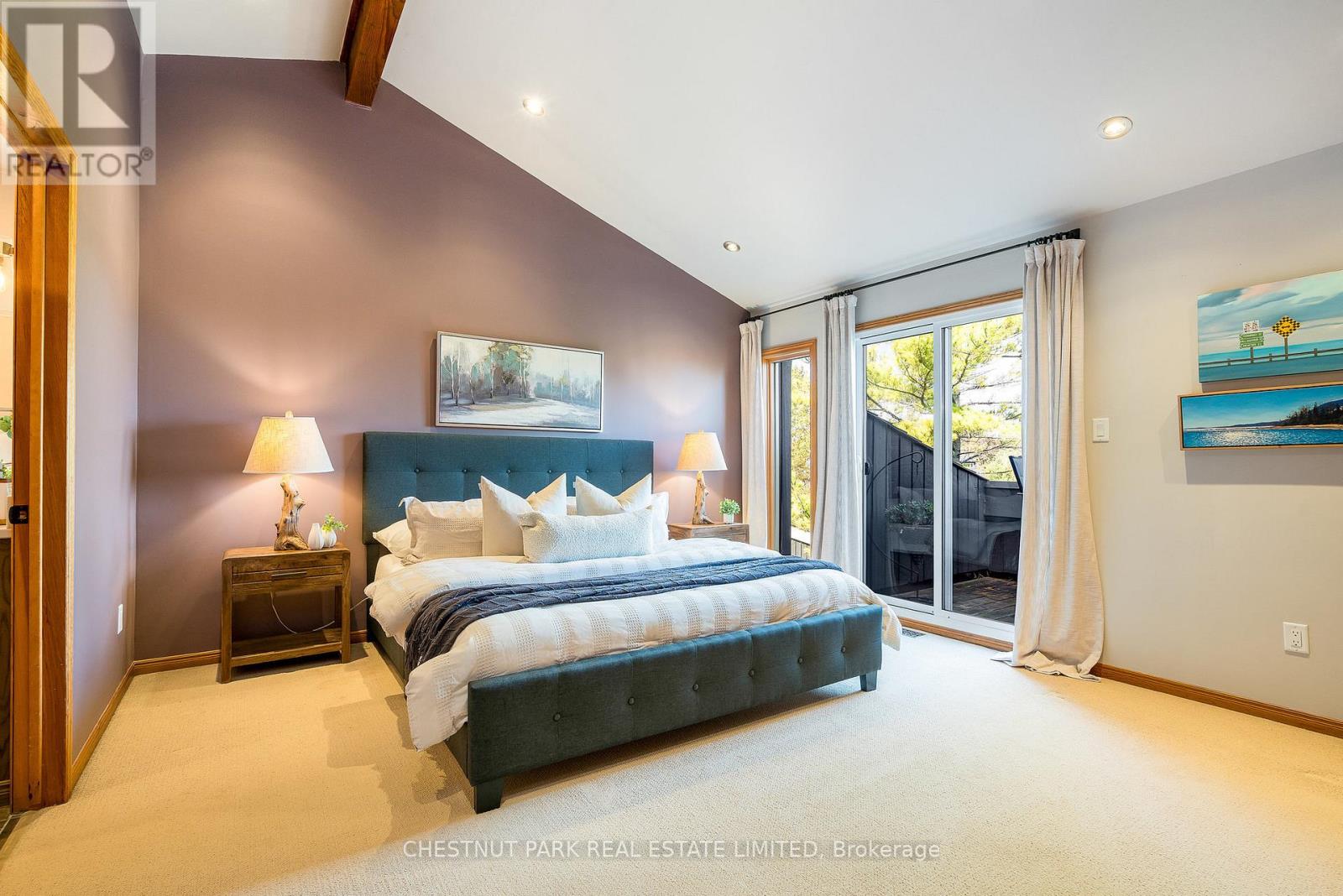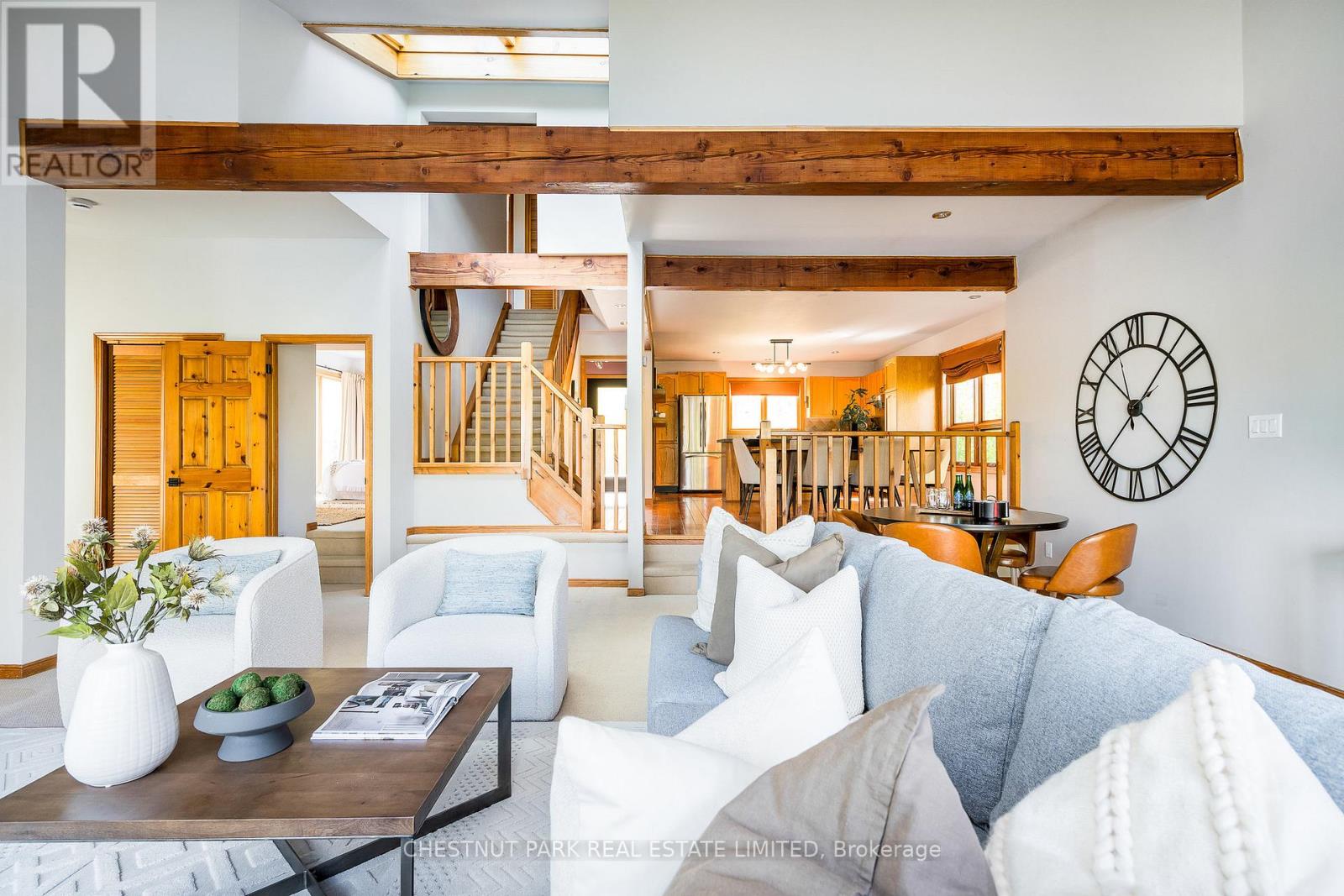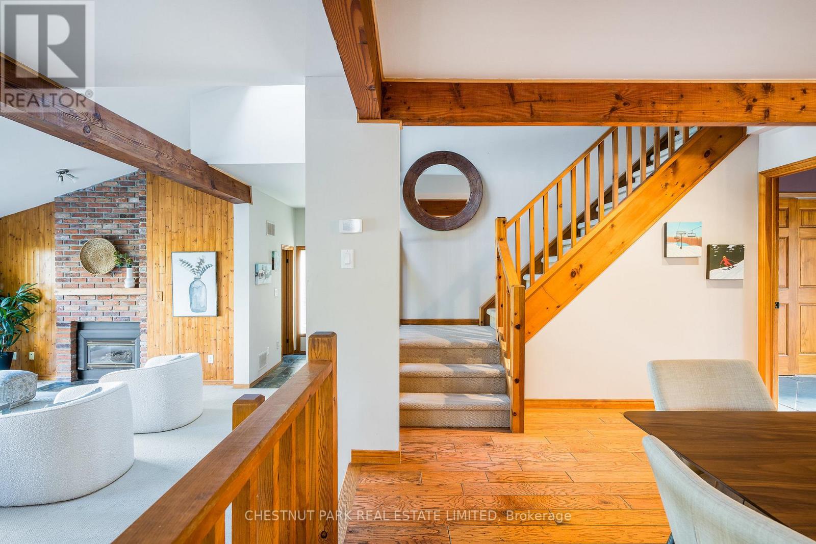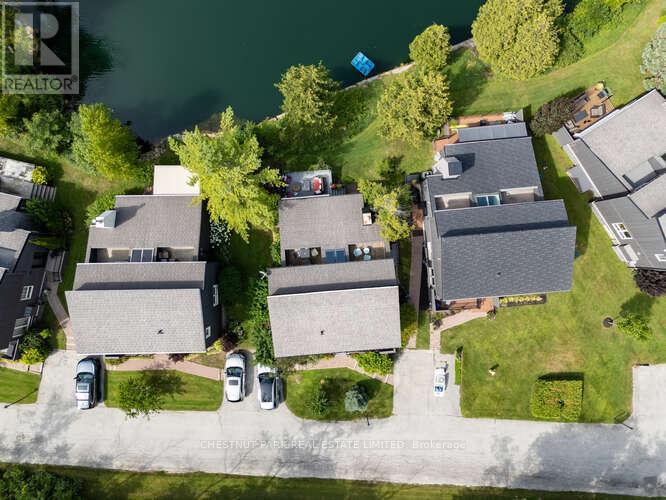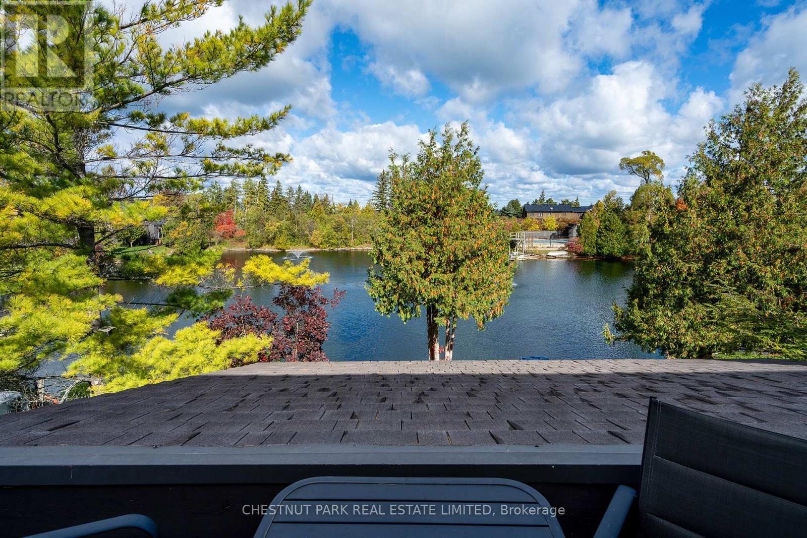 Set within the natural beauty of the Town of The Blue Mountains, and nestled between the ski hills and Georgian Bay, the private 12-home enclave of Hidden Lake is a sought-after haven for those who value peace, recreation, and elegant living. Residents enjoy an exclusive tennis and pickleball court, a sun-filled pool, a wide-open playing field, and a serene swimming pond, complete with a floating dock and diving tower - the perfect setting for four-season enjoyment. A private gate provides direct access to the Georgian Trail, perfect for biking, hiking, & x-country skiing, with a short stroll to the Bay. Chalet 9 offers almost 3000 sq ft of living space over 3 levels, 4 beds & 4 baths. Inside, the sunken great room showcases soaring ceilings, solid Fir beams, and views over the private 1-acre lake. A large kitchen with custom counters & breakfast bar opens seamlessly to the main living area - perfect for hosting family and friends. There is also a versatile main floor bedroom/ office tucked away, with a powder room across the hall. Two of three upstairs bedrooms feature sliding doors to private porches, offering peaceful views of Hidden Lake and peekaboo glimpses of Georgian Bay. The bright lower level offers a rec room, wet bar, media room, and bunk room. Outside, enjoy beautiful gardens, a front deck with a gas BBQ, and a back deck with pond views and a retractable awning. Homeowners share costs for grounds and amenities as a common elements condo. Close to Thornbury's renowned cideries, restaurants, bakeries, & shops, Scandinave Spa, & Blue Mountain resort - this is an exceptional location and a rare opportunity. This property is attractively priced for immediate sale - come play this winter! (id:4555)