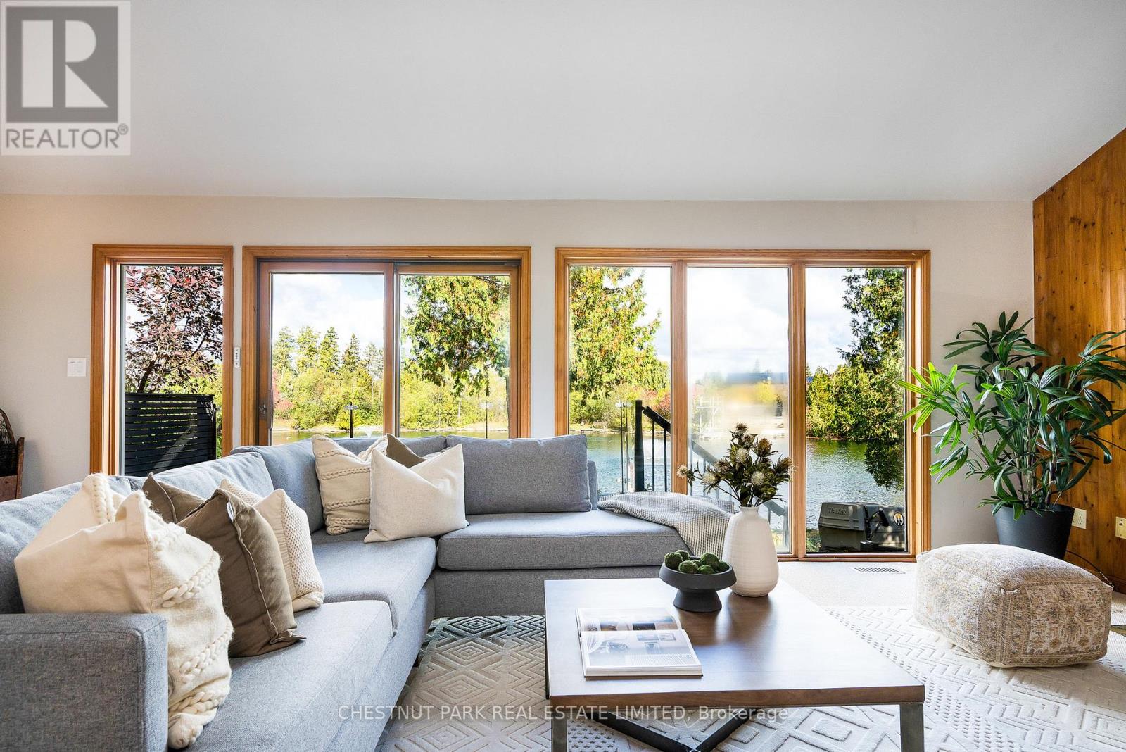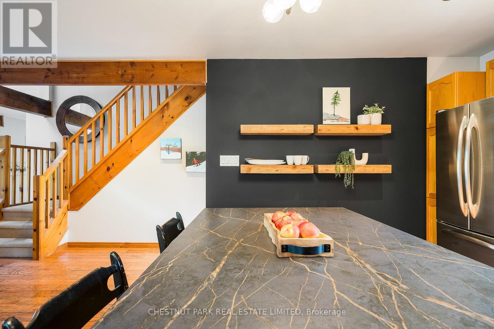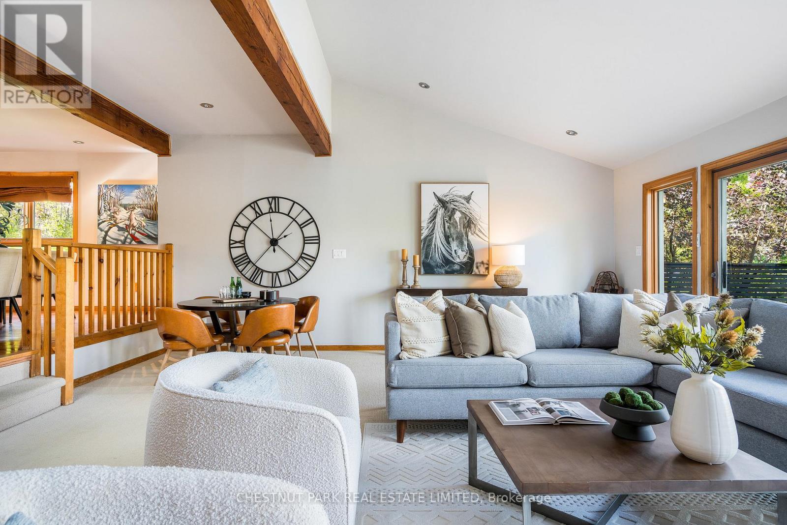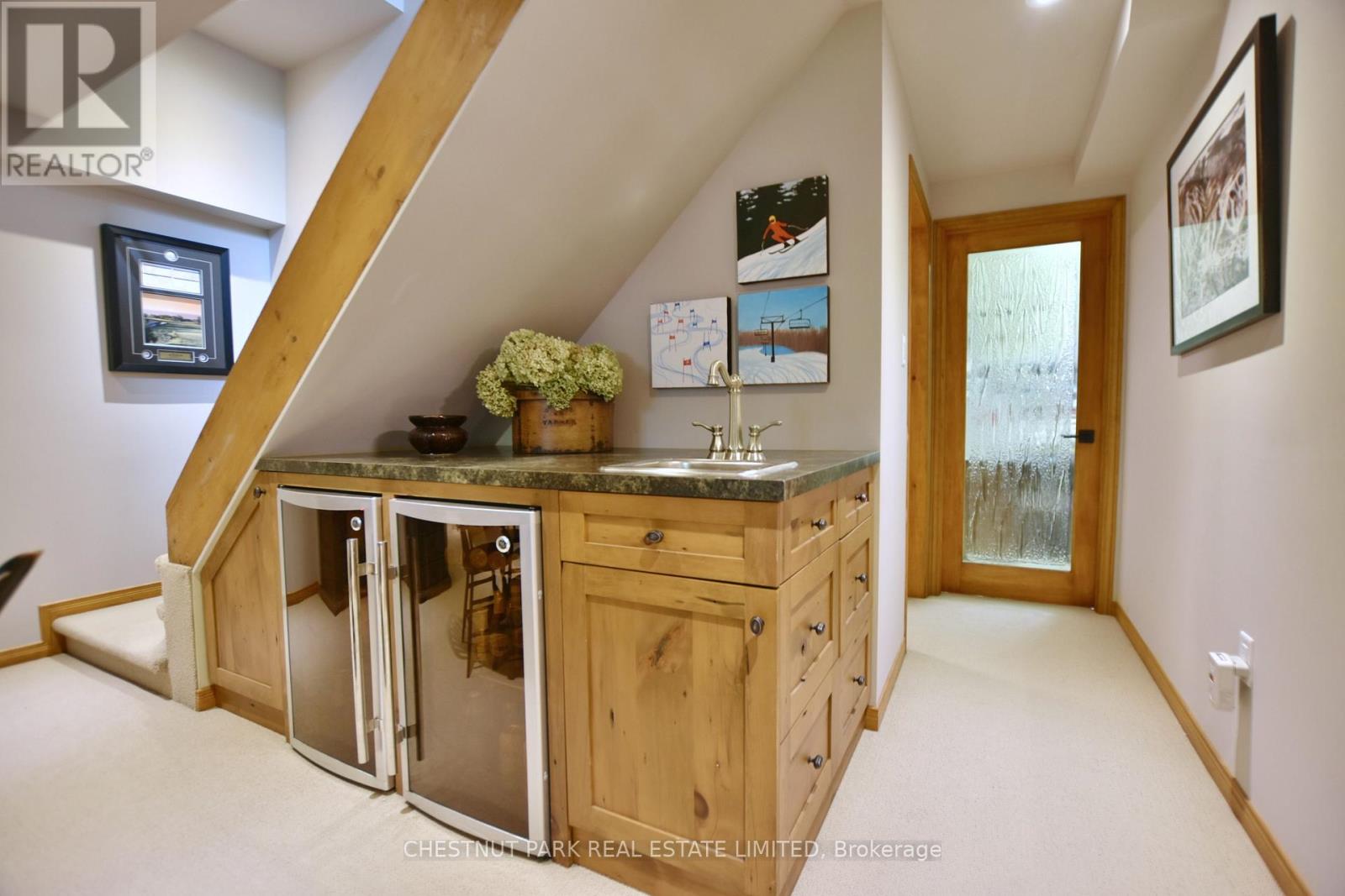 Set within the natural beauty of the Town of The Blue Mountains, and nestled between the ski hills and Georgian Bay, the private 12-home enclave of Hidden Lake is a sought-after haven for those who value peace, recreation, and elegant living. Residents enjoy an exclusive tennis and pickleball court, a sun-filled pool, a wide-open playing field, and a serene swimming pond, complete with a floating dock and diving tower - the perfect setting for four-season enjoyment. A private gate provides direct access to the Georgian Trail, perfect for biking, hiking, & x-country skiing, with a short stroll to the Bay. Chalet 9 offers almost 3000 sq ft of living space over 3 levels, 4 beds & 4 baths. Inside, the sunken great room showcases soaring ceilings, solid Fir beams, and views over the private 1-acre lake. A large kitchen with custom counters & breakfast bar opens seamlessly to the main living area - perfect for hosting family and friends. There is also a versatile main floor bedroom/ office tucked away, with a powder room across the hall. Two of three upstairs bedrooms feature sliding doors to private porches, offering peaceful views of Hidden Lake and peekaboo glimpses of Georgian Bay. The bright lower level offers a rec room, wet bar, media room, and bunk room. Outside, enjoy beautiful gardens, a front deck with a gas BBQ, and a back deck with pond views and a retractable awning. Homeowners share costs for grounds and amenities as a common elements condo. Close to Thornbury's renowned cideries, restaurants, bakeries, & shops, Scandinave Spa, & Blue Mountain resort - this is an exceptional location and a rare opportunity. This property is attractively priced for immediate sale - come play this winter! (id:4555)