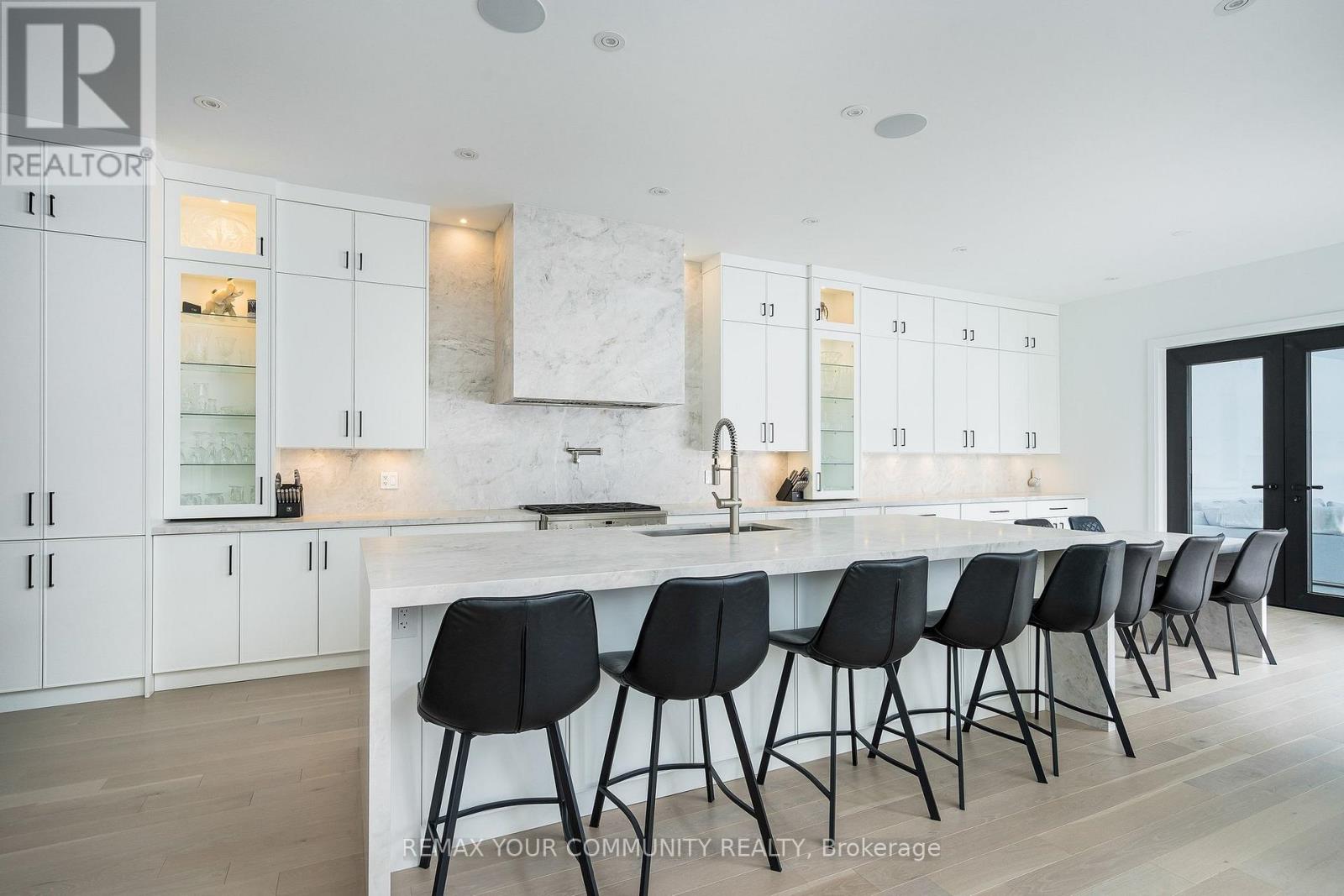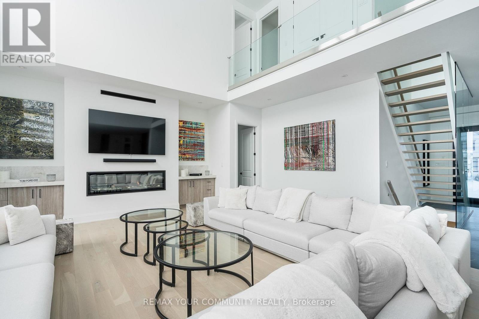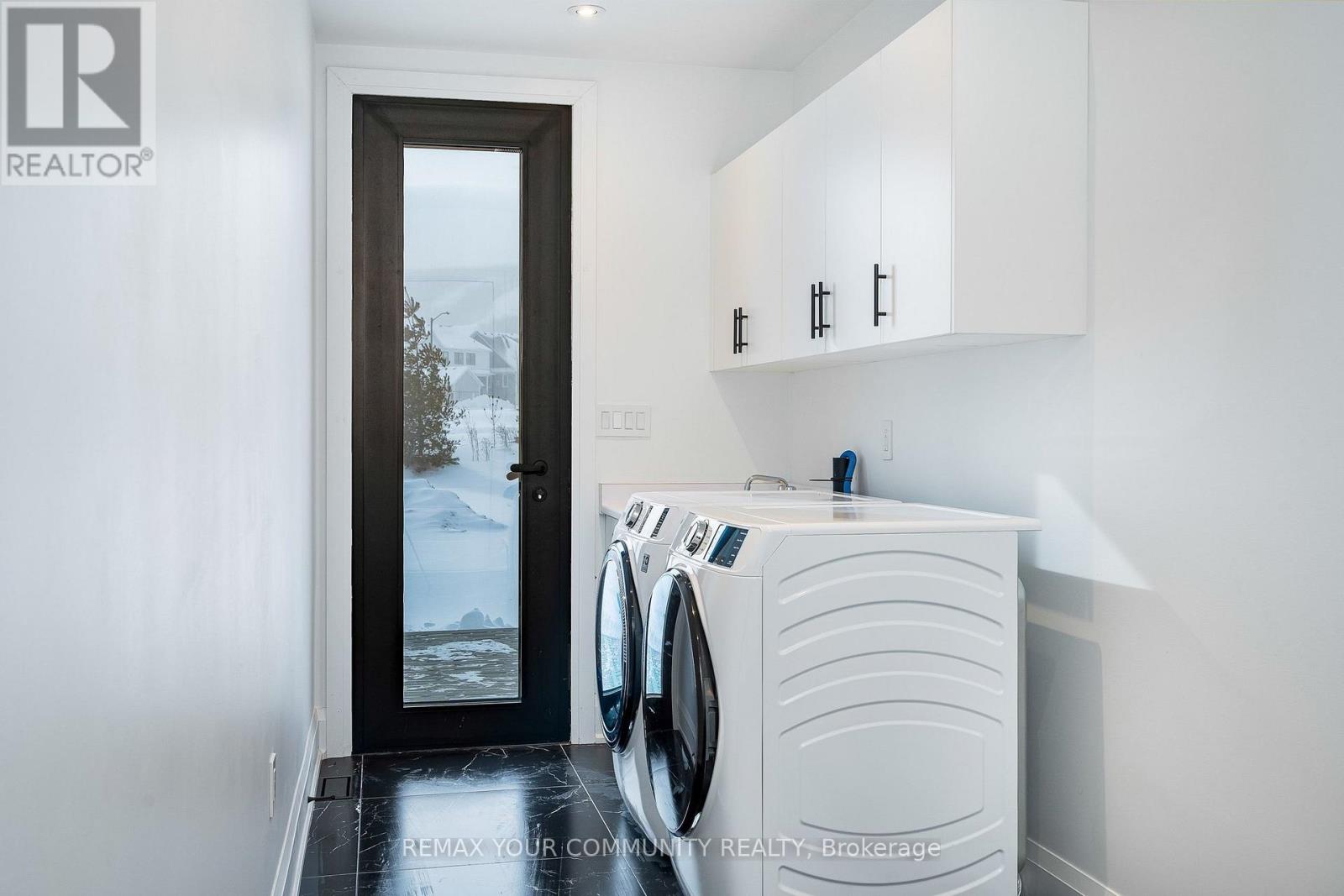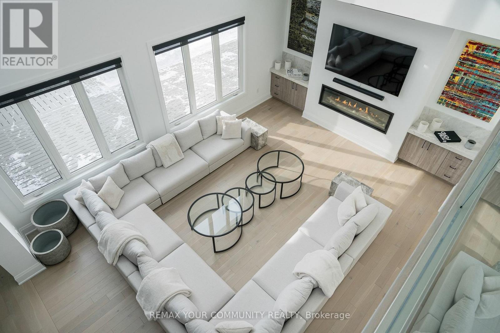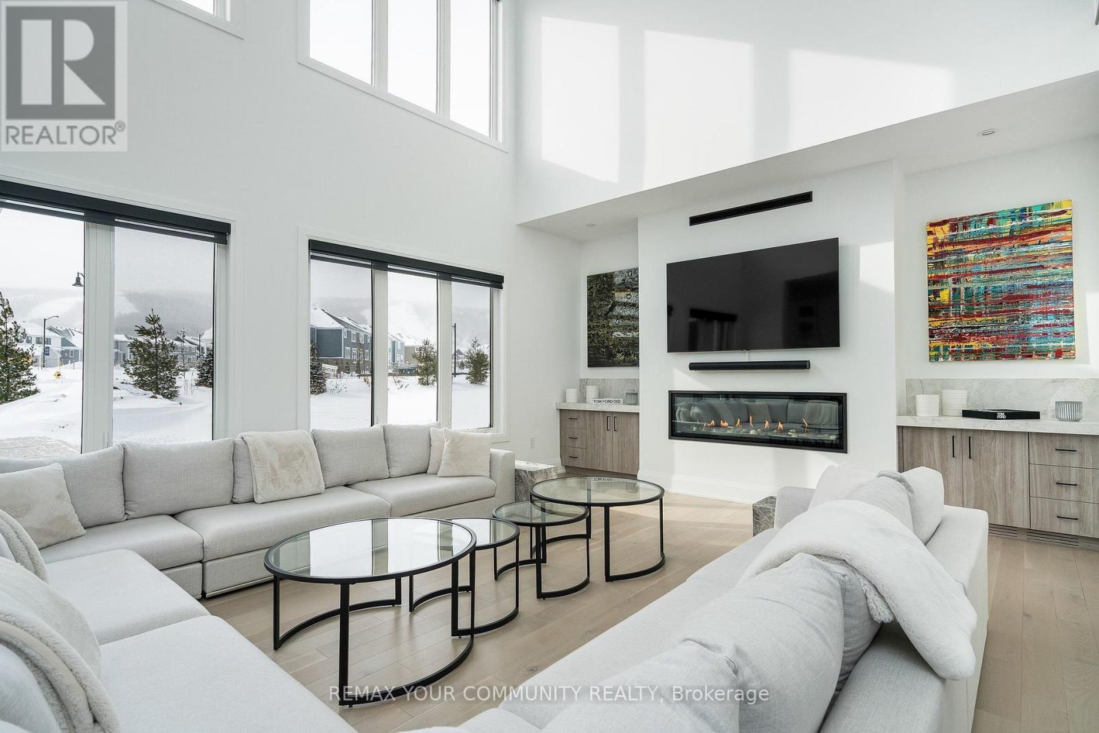 VISIT WWW.103STILLWATER.COM to view the full virtual walk-through and complete gallery. Positioned on a premium lot with unobstructed Blue Mountain views, this FULLY FURNISHED custom-built residence offers 5,009 sq ft of refined living space across three finished levels. A European-style 8-foot entry door, enhanced exterior lighting, and a purpose-built garage with high-lift tracks and EV rough-ins set the stage for the craftsmanship throughout. The main level features 10-foot ceilings, wide-plank hardwood, and a dramatic 20-foot great room with expansive windows framing panoramic mountain views. A linear Napoleon gas fireplace, custom built-ins, and integrated smart home features enhance the space. The chef's kitchen is anchored by a 17-foot stone island, full-height cabinetry, premium Monogram and Thermador appliances, and seamless access to a Trex wrap-around deck designed to capture the view. A vaulted four-season extension with heated porcelain floors, wood-burning fireplace, and two 9' x 9' glass doors creates exceptional indoor-outdoor living. Upstairs, the primary suite offers a private terrace and a spa-inspired ensuite, complemented by three additional bedrooms with walk-in closets and upgraded ensuites. The fully finished lower level includes radiant heated floors, wet bar, theatre, gym, smart sauna, and two additional bedrooms. The residence features three full laundry rooms-conveniently located on each level-delivering exceptional functionality and seamless comfort for year-round living and effortless entertaining in Blue Mountains. (id:4555)