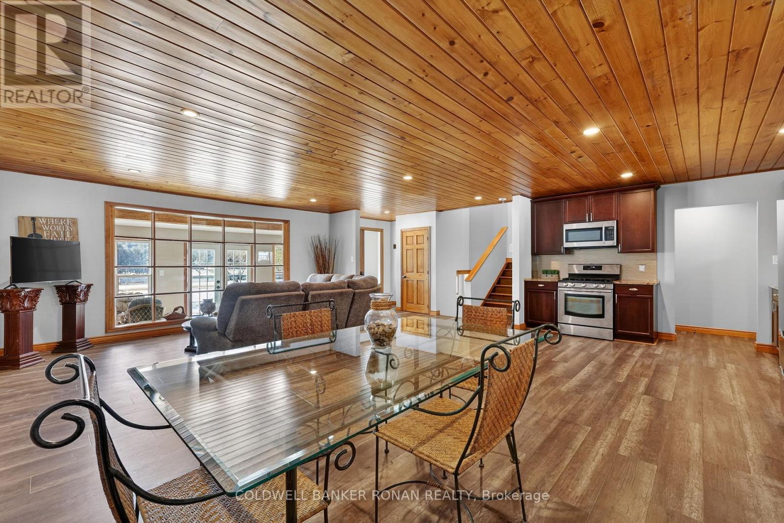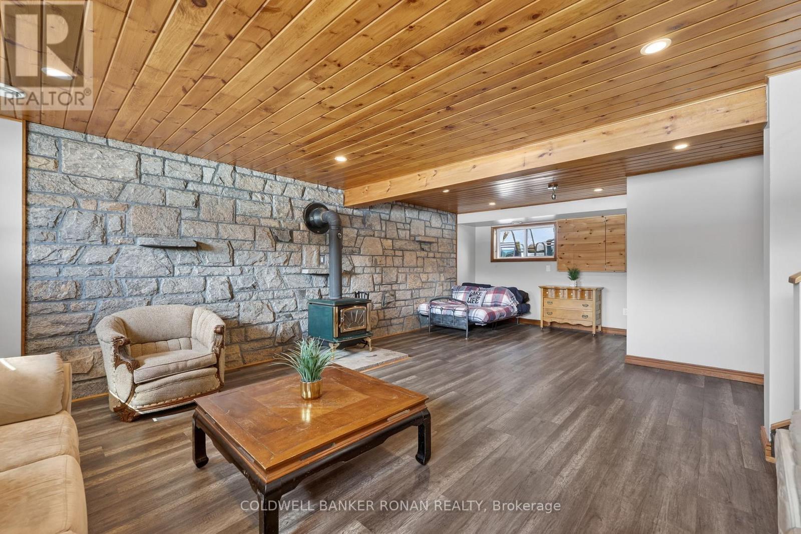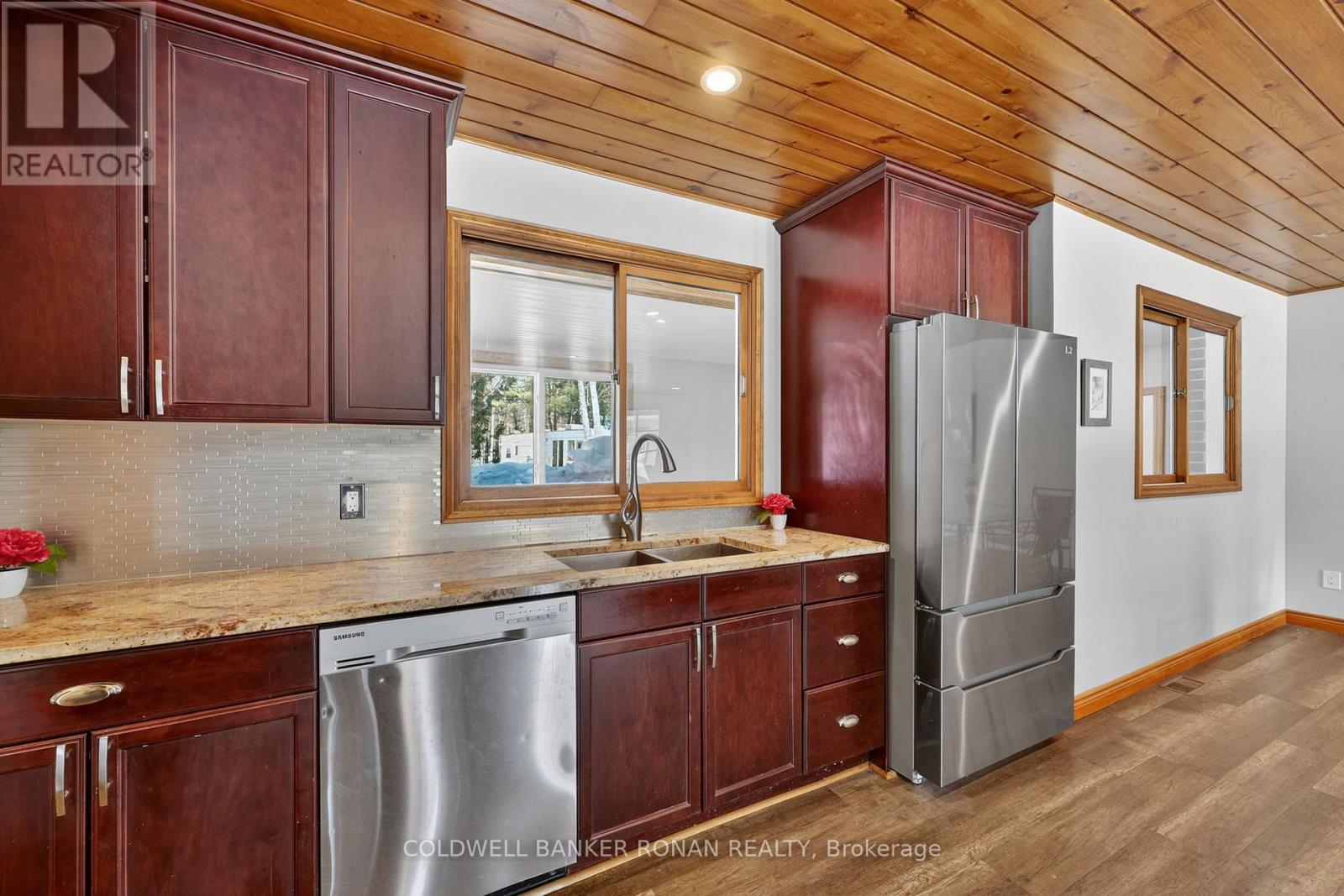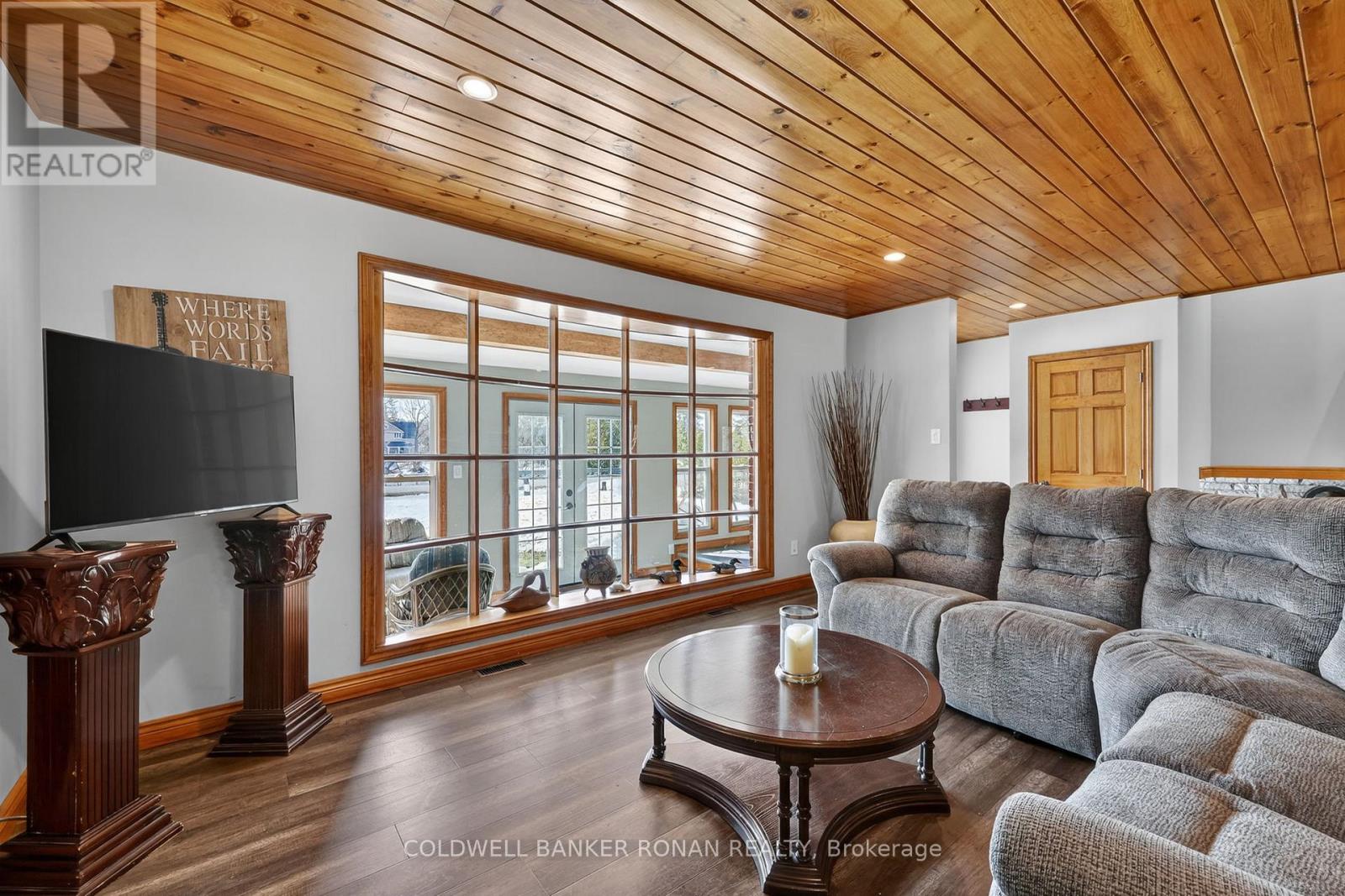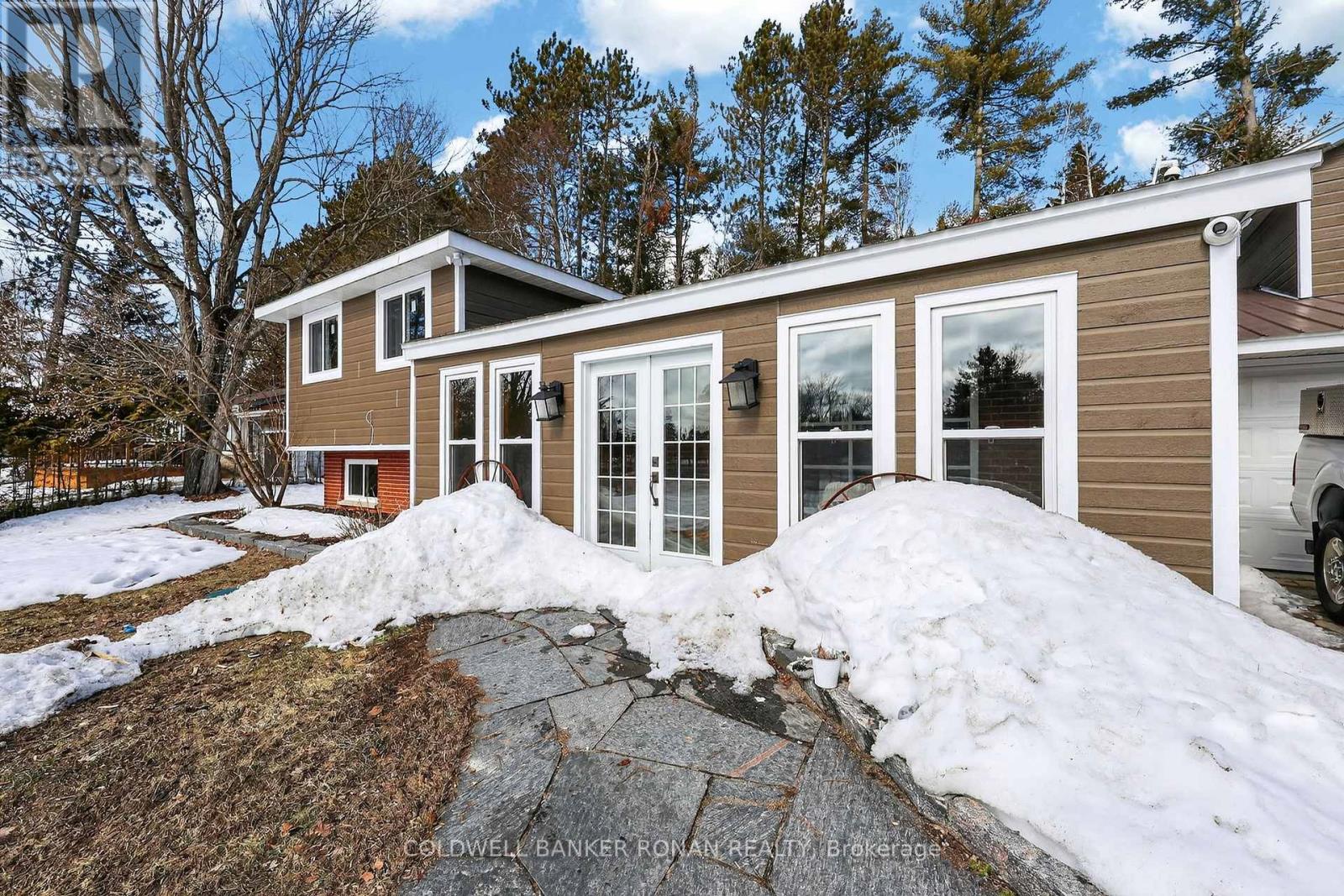 This charming spacious home boasts open concept living room, dining room & kitchen, 3 good sized bedrooms and lovely family room with woodstove. The sun filled sunroom offers serene view of the river. You will find the perfect guest room above the garage with french doors and view of the river. The insulated 2 car garage has access into the home. Recent renovations 2025 incl. new windows, flooring on main & lower level, painted throughout, ceramic floors in sun room & back foyer & fridge, new furnace, A/C and garage insulted w/epoxy floor & garage heated by electric heater.Renovations six years ago incl. new pine tongue & groove ceilings throughout, wiring, insulation, drywall, kitchen & guest room above garage.You will find a good sized dock at waterfront across Santas Village Rd. giving access to the 3 big lakes, Muskoka, Joseph & Rosseau. Min to downtown Bracebridge with all amenities incl. hospital. This property is perfect for entertaining with that lovely peaceful feeling and plenty of outdoor space. Lots of parking.Book your appointment now and make this"Home Sweet Home" (id:4555)