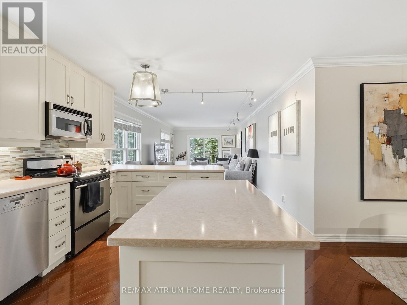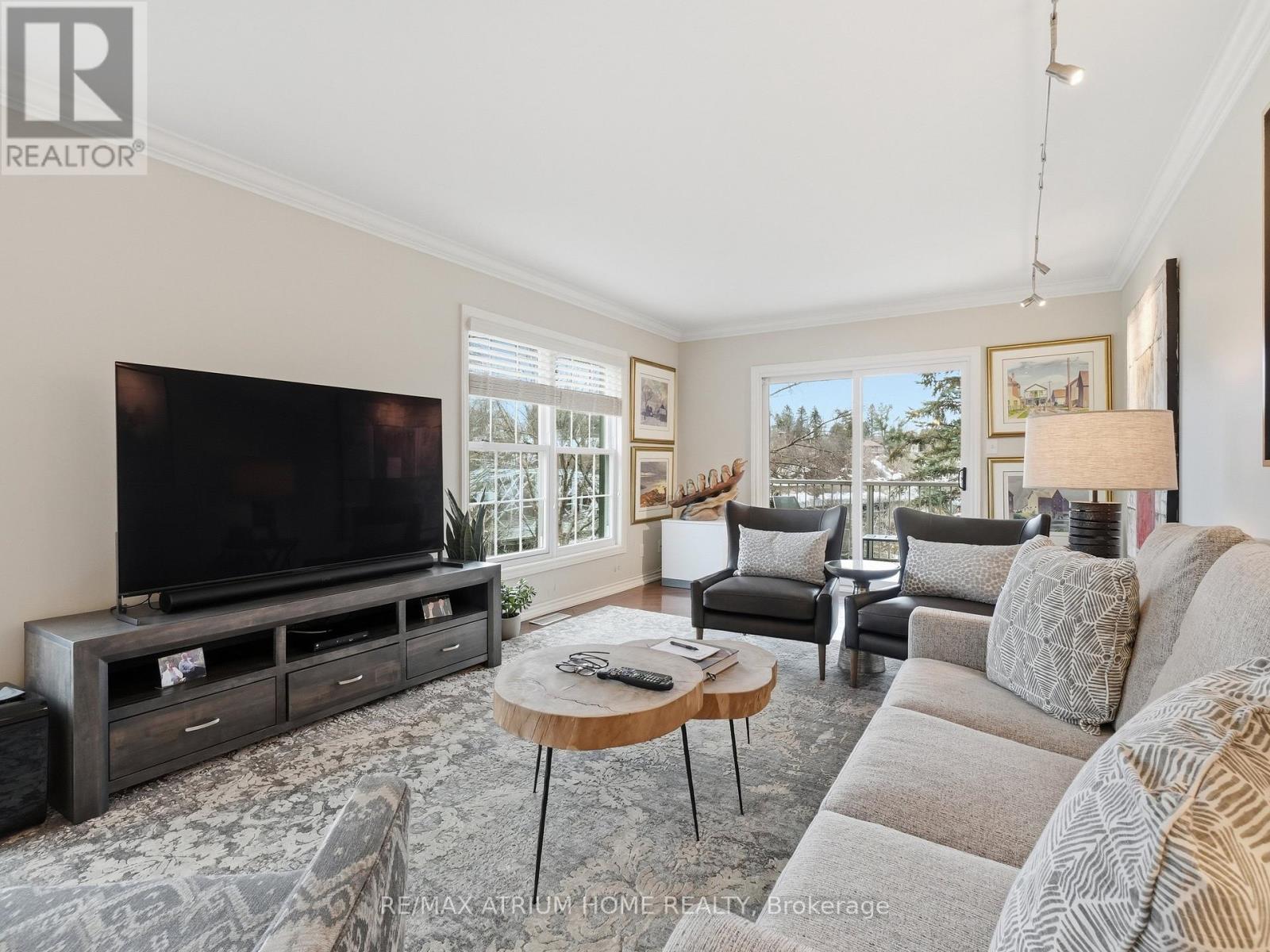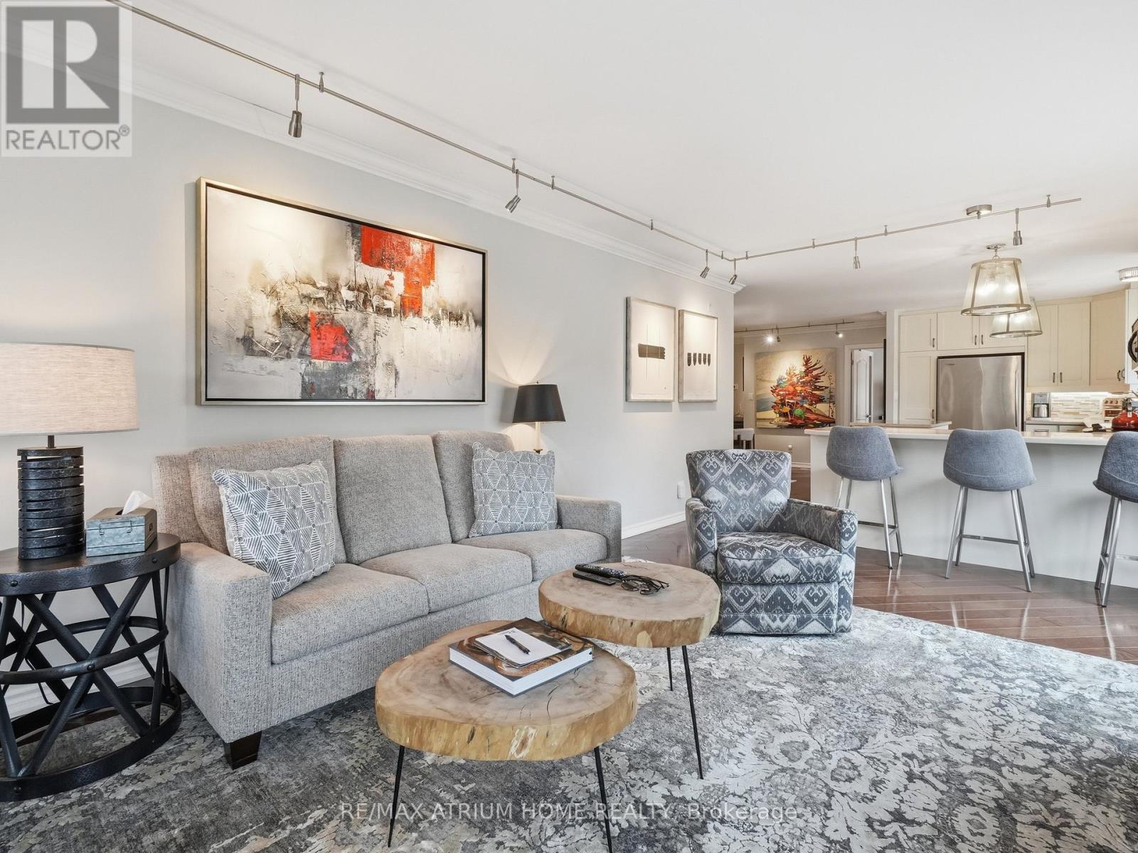 Set within the natural beauty of Muskoka, this residence at Drumkerry by the Falls offers a rare balance of quiet retreat and everyday convenience in the heart of Bracebridge. Thoughtfully designed, the two-bedroom plus den suite features a bright, open layout where natural light moves effortlessly through the living and dining spaces, anchored by a well-appointed kitchen with generous workspace, ample cabinetry, and a welcoming breakfast bar for casual dining or gathering. The living area extends seamlessly onto a private covered balcony - an ideal place to unwind with the subtle presence of the falls nearby. The primary bedroom serves as a calm, private retreat with a walk-in closet and ensuite bath, while the second bedroom and den provide flexibility for guests, a home office, or additional living space. Meticulously maintained and beautifully presented, the suite also includes in-suite laundry, one parking space, and a private locker, all within a well-managed, secure building. Whether enjoyed as a refined weekend escape or a full-time residence, this home offers a sense of ease, connection, and understated comfort that defines Muskoka living. (id:4555)