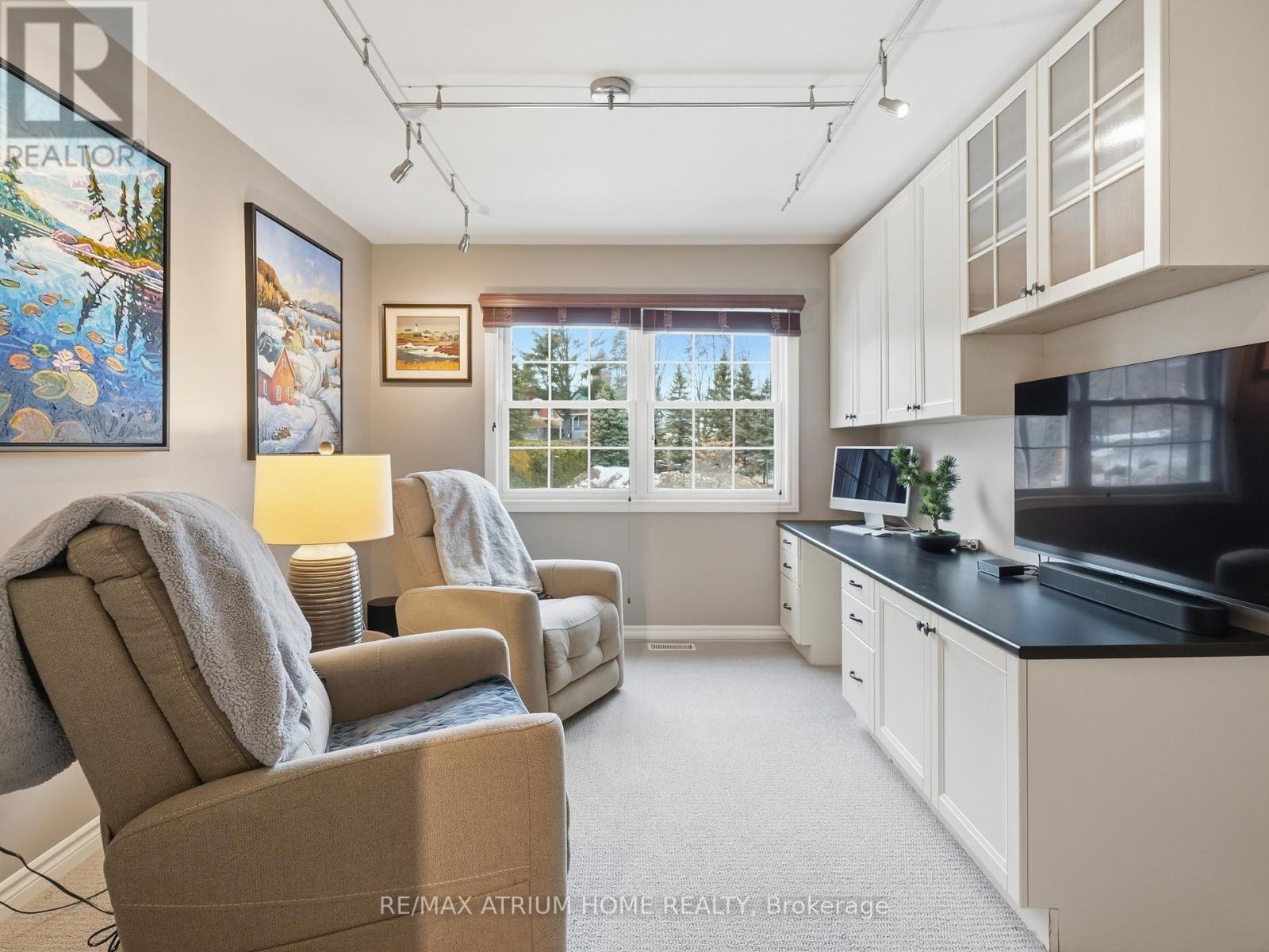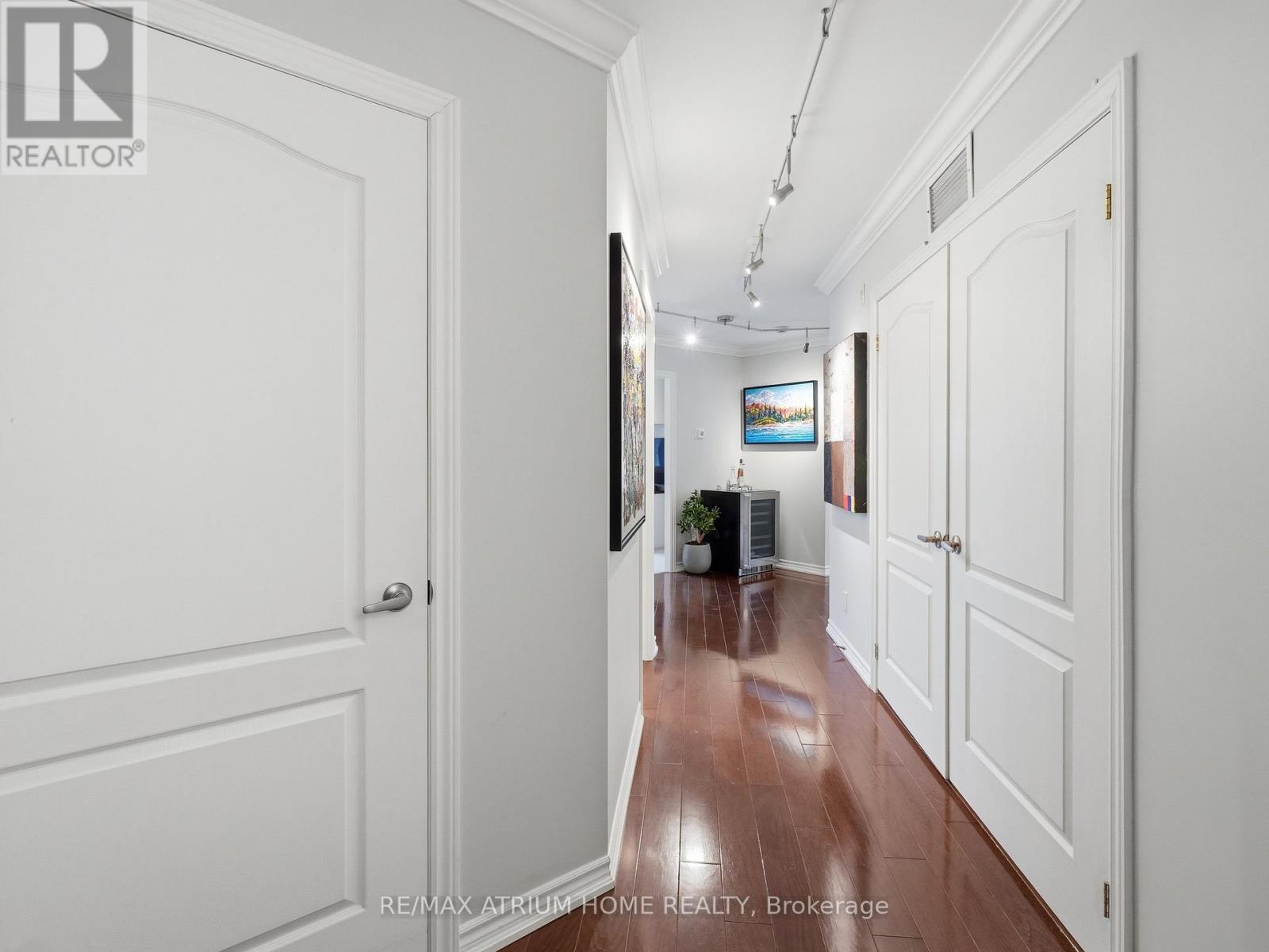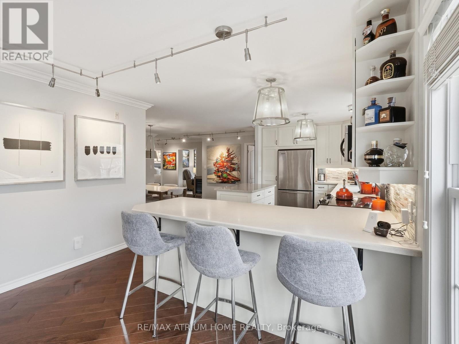 Set within the natural beauty of Muskoka, this residence at Drumkerry by the Falls offers a rare balance of quiet retreat and everyday convenience in the heart of Bracebridge. Thoughtfully designed, the two-bedroom plus den suite features a bright, open layout where natural light moves effortlessly through the living and dining spaces, anchored by a well-appointed kitchen with generous workspace, ample cabinetry, and a welcoming breakfast bar for casual dining or gathering. The living area extends seamlessly onto a private covered balcony - an ideal place to unwind with the subtle presence of the falls nearby. The primary bedroom serves as a calm, private retreat with a walk-in closet and ensuite bath, while the second bedroom and den provide flexibility for guests, a home office, or additional living space. Meticulously maintained and beautifully presented, the suite also includes in-suite laundry, one parking space, and a private locker, all within a well-managed, secure building. Whether enjoyed as a refined weekend escape or a full-time residence, this home offers a sense of ease, connection, and understated comfort that defines Muskoka living. (id:4555)
