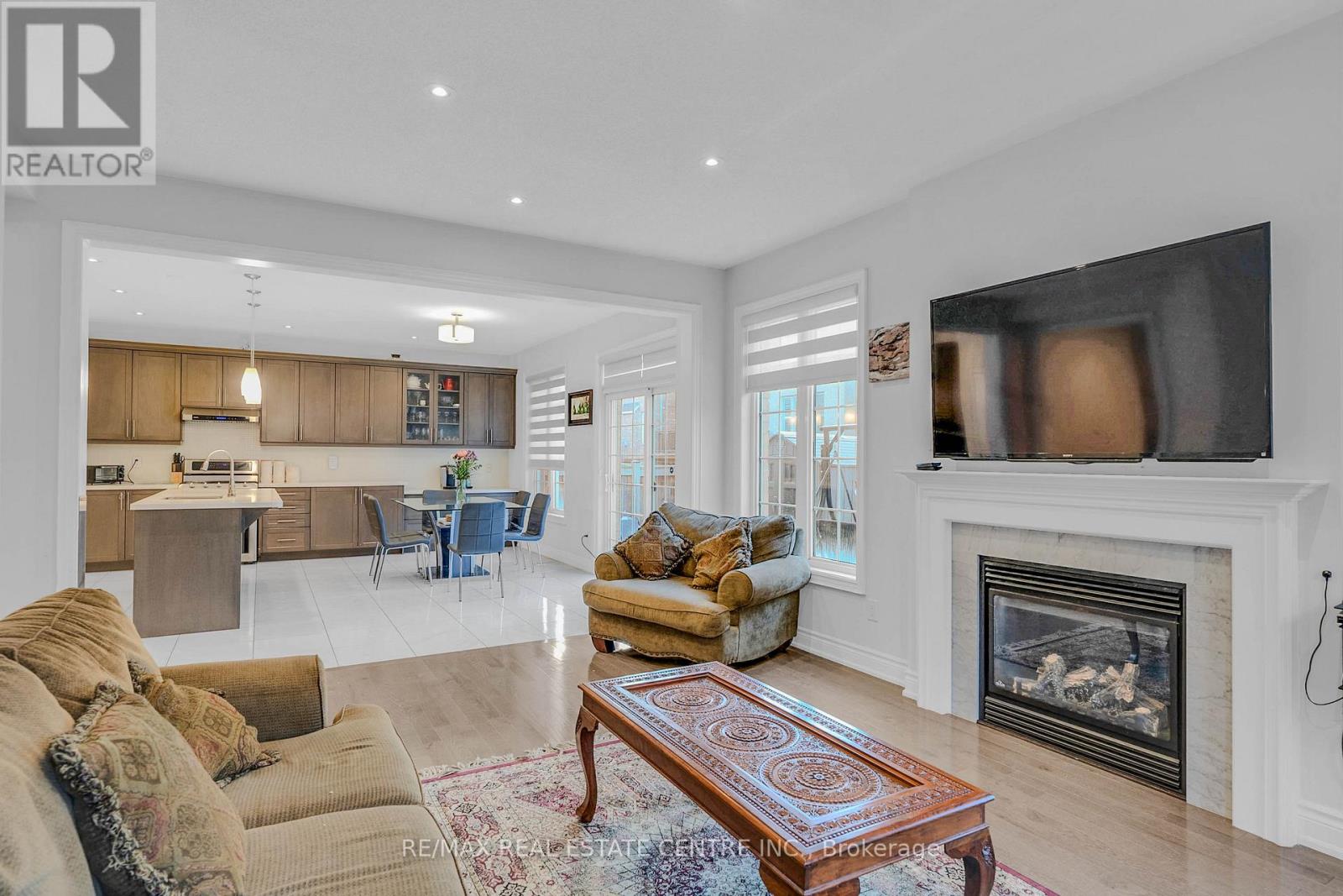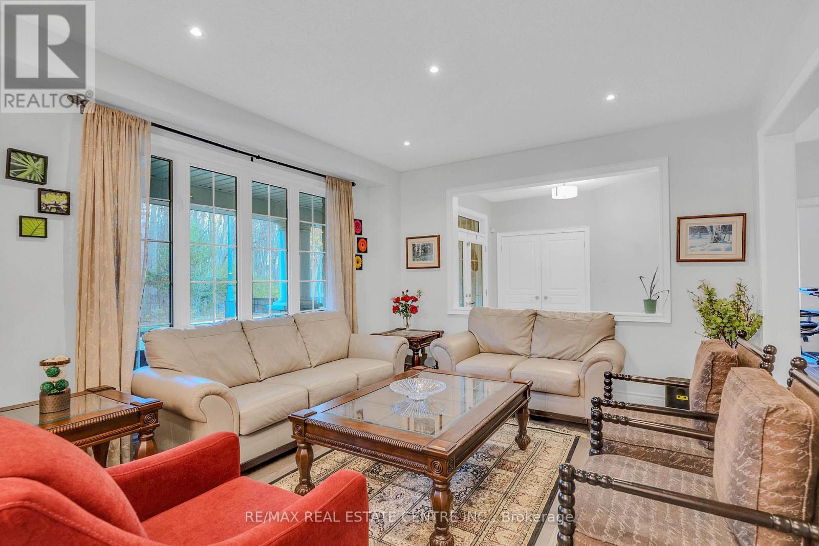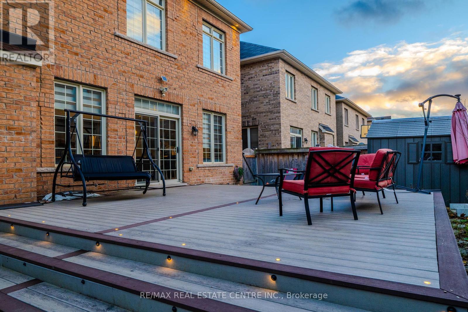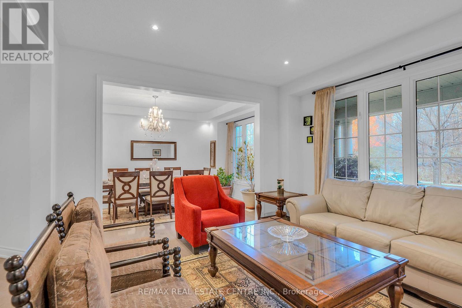 Facing peaceful green space on a quiet crescent and set on a premium corner lot, this home offers over 5,000 sq. ft. of total finished living space in one of the area's most desirable locations, featuring rich maple flooring, nine-foot ceilings, a hardwood staircase with iron pickets, a spacious kitchen with a large island and pantry, stainless steel appliances, a bright living area with a gas fireplace, and a dedicated main-floor office. The second level includes engineered hardwood in the halls, cozy carpeted bedrooms, four well-appointed bedrooms with two ensuites plus a Jack-and-Jill bathroom, generous walk-in closets, and a primary suite with ten-foot ceilings and an additional exercise room that can be converted into a fifth bedroom. The professionally finished basement enhances the home further with a separate entrance, two bedrooms, one bathroom, enlarged windows, ample storage, and electrical outlets ready for a future washer and dryer setup-ideal for extended family or guests. Completing the property is a double-car garage, a landscaped yard with an upgraded composite deck, and an oversized interlock patio. (id:4555)