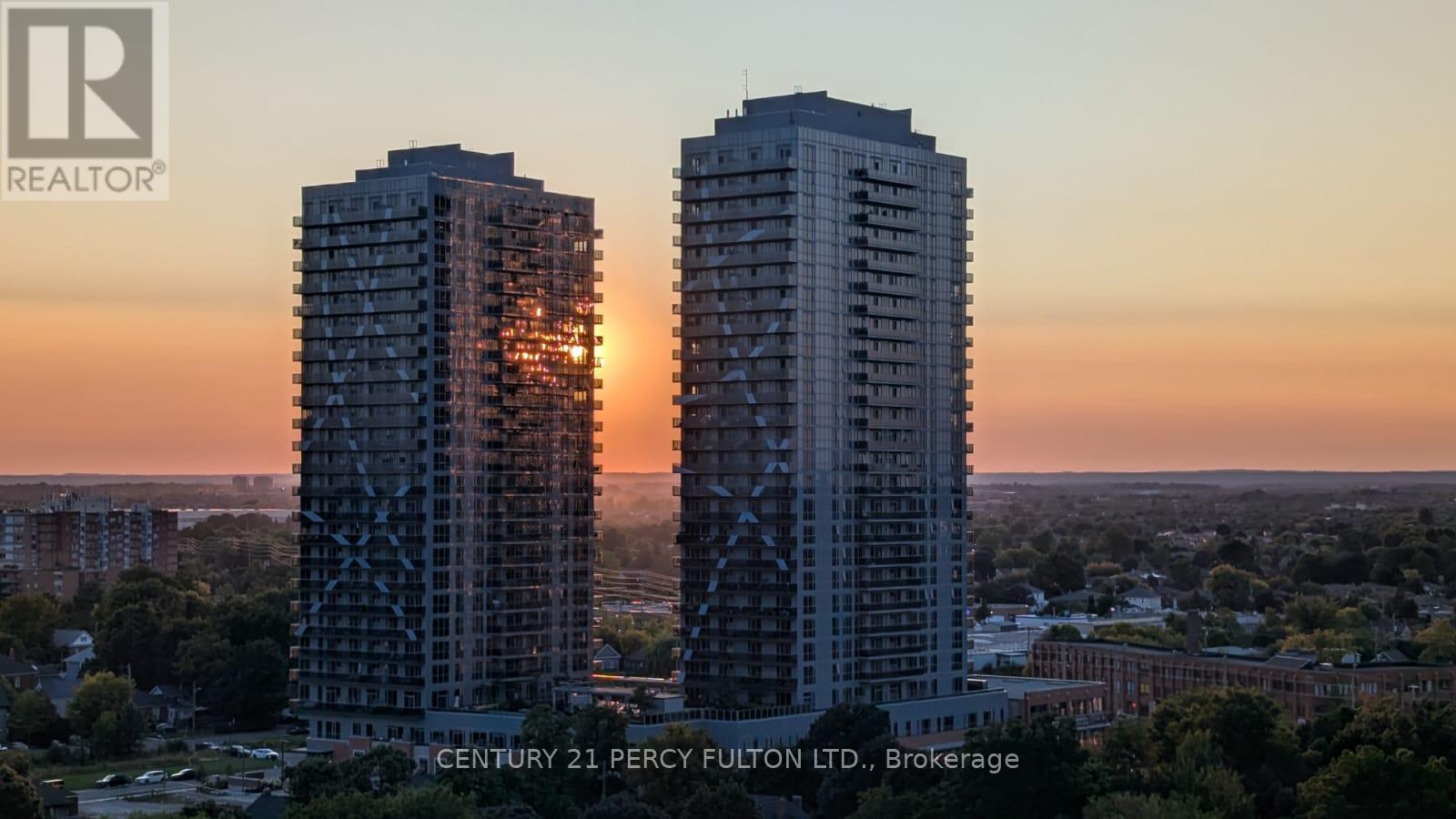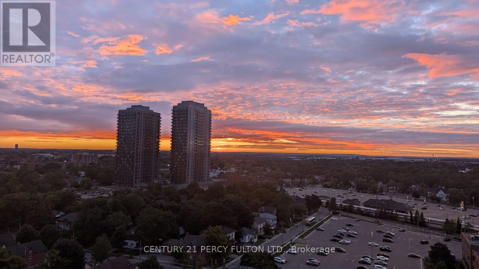 Welcome to The Renaissance in the heart of Downtown Brampton! This warm and inviting Northwest-facing 2+1 bedroom, 2-bath condo offers floor-to-ceiling windows that fill the home with natural light and showcase stunning sunset views from your private balcony. The open living and dining areas are perfect for family time, while the renovated flooring and upgraded lighting create a bright, modern feel. The stylish kitchen features marble counters, stainless steel appliances, plenty of cabinetry, and a breakfast bar that makes meals and entertaining easy. Both washrooms have been beautifully updated with fresh finishes, giving the whole home a polished look. Added conveniences include ensuite laundry, underground parking, and a storage locker. Families will love being steps from schools, parks, the Rose Theatre, and Garden Square events, plus nearby shops, markets, and transit options. With 24/7 concierge and security, this condo is the perfect place to enjoy comfort, community, and family living. (id:4555)