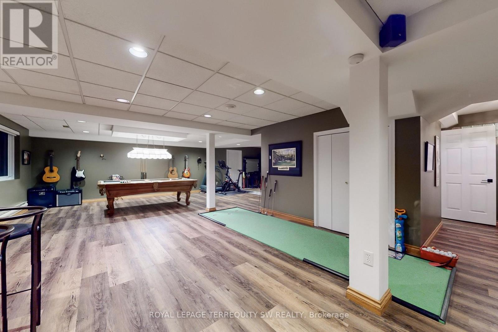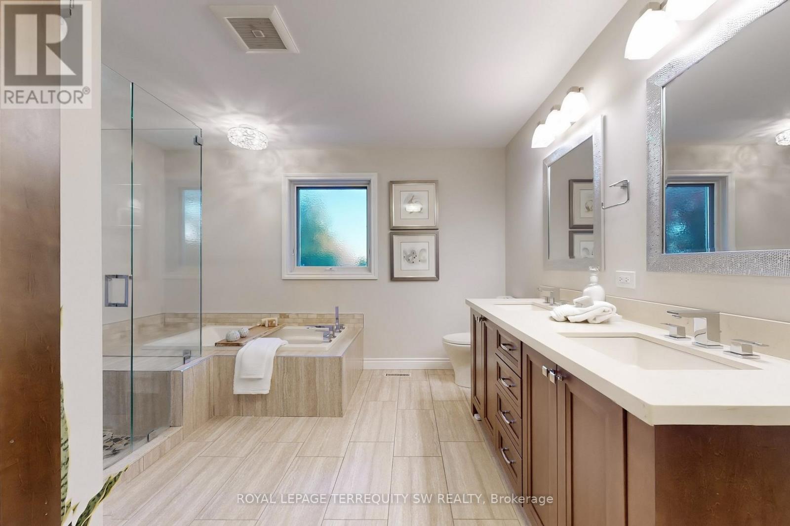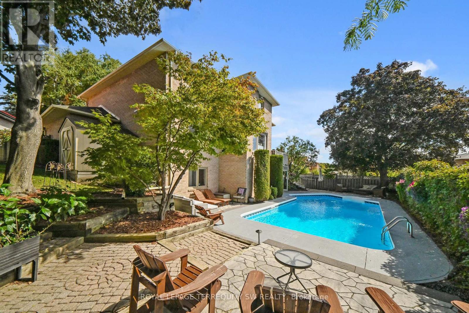 Tucked away on a quiet cul-de-sac in one of Brampton's most established enclaves, 8 Chalmers Court offers an exceptional balance of elegance, comfort, and family functionality. This detached 2 storey executive brick home sits on a mature, pie-shaped lot measuring 52 ft across at the front widening to over 130ft at the rear-surrounded by manicured gardens, mature trees, and resort-style outdoor living with a stone patio, gazebo, pristine heated in-ground pool. A gracious foyer opens to distinct principal rooms with refined finishes: formal living and dining rooms with French drs, smooth ceilings, and gleaming hardwood floors; a bright family room anchored by a gas fireplace, built-in cabinetry, and patio doors to the sun deck. The chef's kitchen impresses with granite countertops, centre island, custom backsplash, gas stove, under-mount lighting, pot lights, beverage fridge, and stainless-steel appliances. The adjoining breakfast rm-featuring a bay window and walk-out to the deck-overlooks the lush gardens, and pool. Upstairs, the spacious primary suite (incorporating the fifth bedroom) offers a private dressing area, hardwood floors, and a luxurious 4-pc ensuite with heated floors, double sinks, glass shower, and standalone tub. Three additional bedrooms and a skylit hallway complete the level. The finished lower level adds a versatile recreation room with wood-burning fireplace, wet bar, games area, 4-pc bath with Jacuzzi, exercise space, built-ins, and a walk-out to the patio. Recent updates include roof(2023), main bath(2016), new blinds throughout, 200-amp service + pony panel, pool liner(10 yrs), pump(5 yrs), heater(10 yrs), and backyard patio (3 yrs). Additional features: central air, central vac, security system, in-ground sprinklers, landscape lighting, and gas line for BBQ/fire table. Minutes to schools, parks, and major routes (410/407/401), a beautifully maintained executive residence on a peaceful court-pride of ownership shines inside and out. (id:4555)